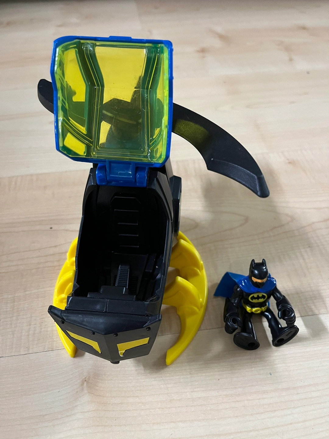 This is a Batman helicopter toy with a figure. The helicopter has a translucent cockpit that opens. The toy is in good condition.