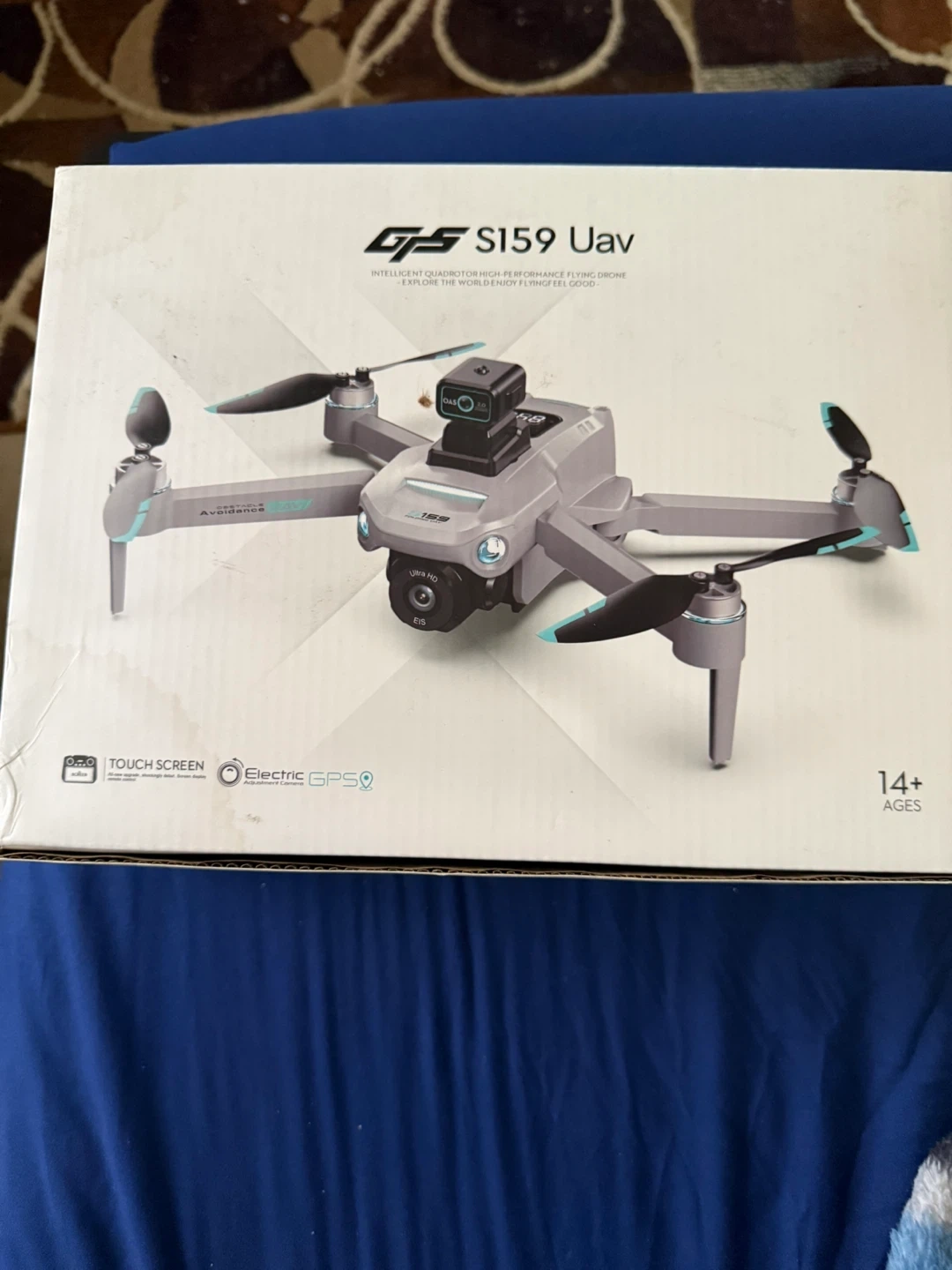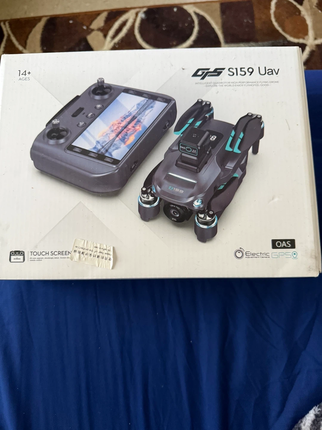 This is the GJS S159 UAV drone. It's an intelligent quadcopter with GPS and touch screen capabilities. It comes with a controller and a carrying case for easy transport.