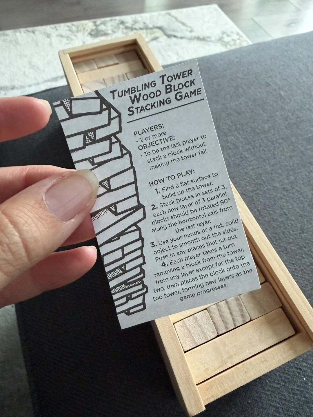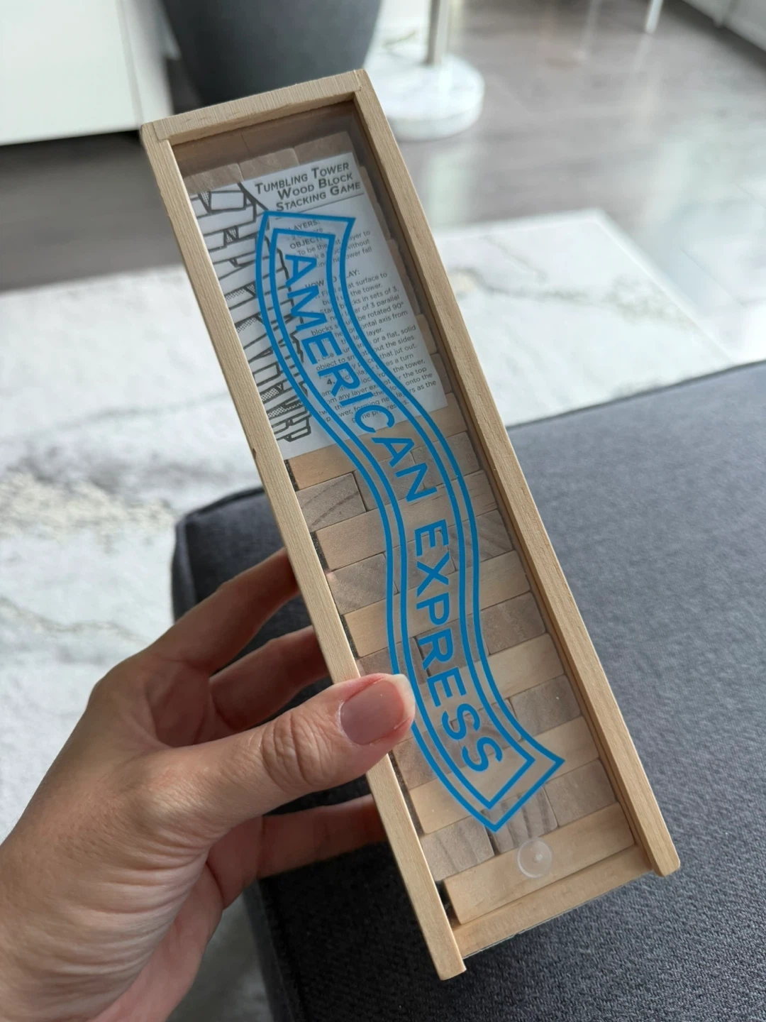 This is a never used tumbling tower wood block stacking game branded Amex. It's a fun game for 2 or more players. The objective is to be the last player to stack a block without making the tower fall. The box is included