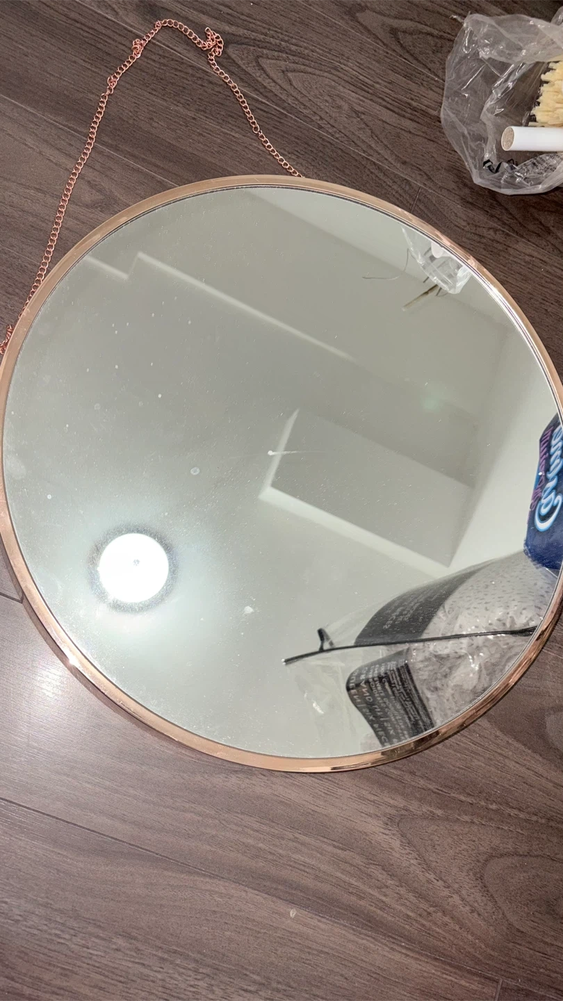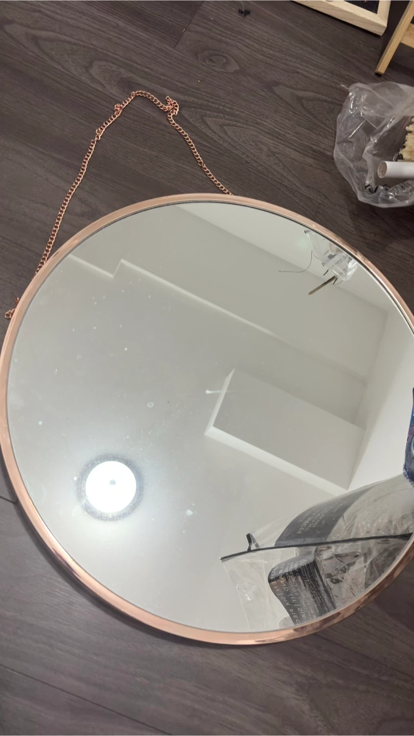 A stylish round wall mirror with a rose gold metal frame. It’s in mint condition. It comes with a decorative rose gold chain for hanging. This mirror adds a touch of elegance to any room. Easy-to-Hang Circular Wall Mirror with Durable Metal Chain. Chain is made from real metal.