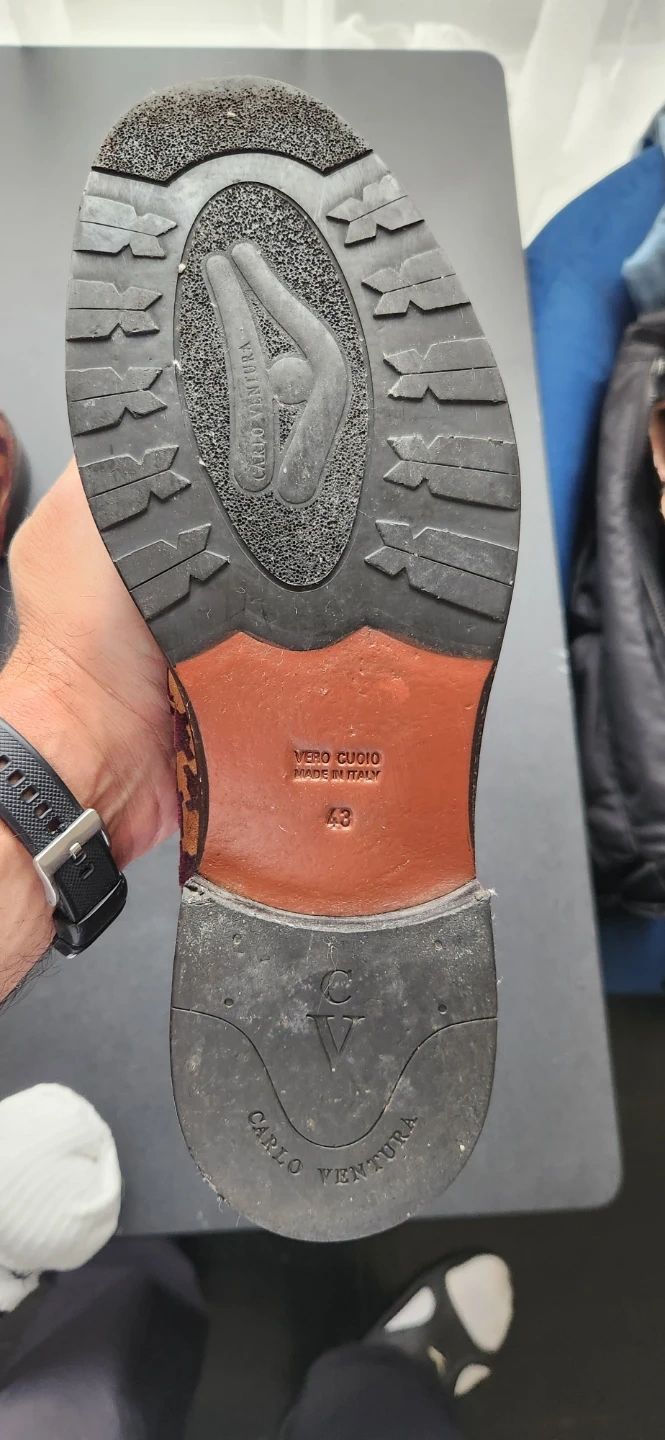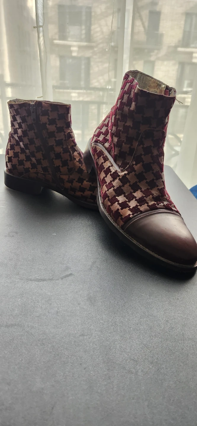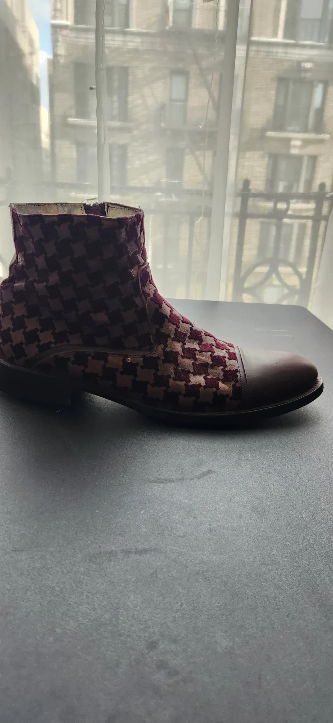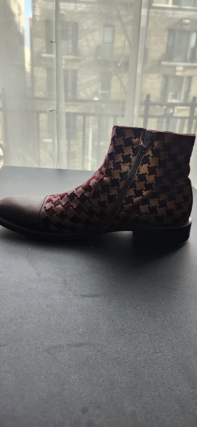 Selling a pair of Carlo Ventura ankle boots in size 43, USA size 11. They feature a unique patterned design on the upper and a leather toe cap. The soles show some wear, but they're still in good condition for everyday use & stylish to boot!