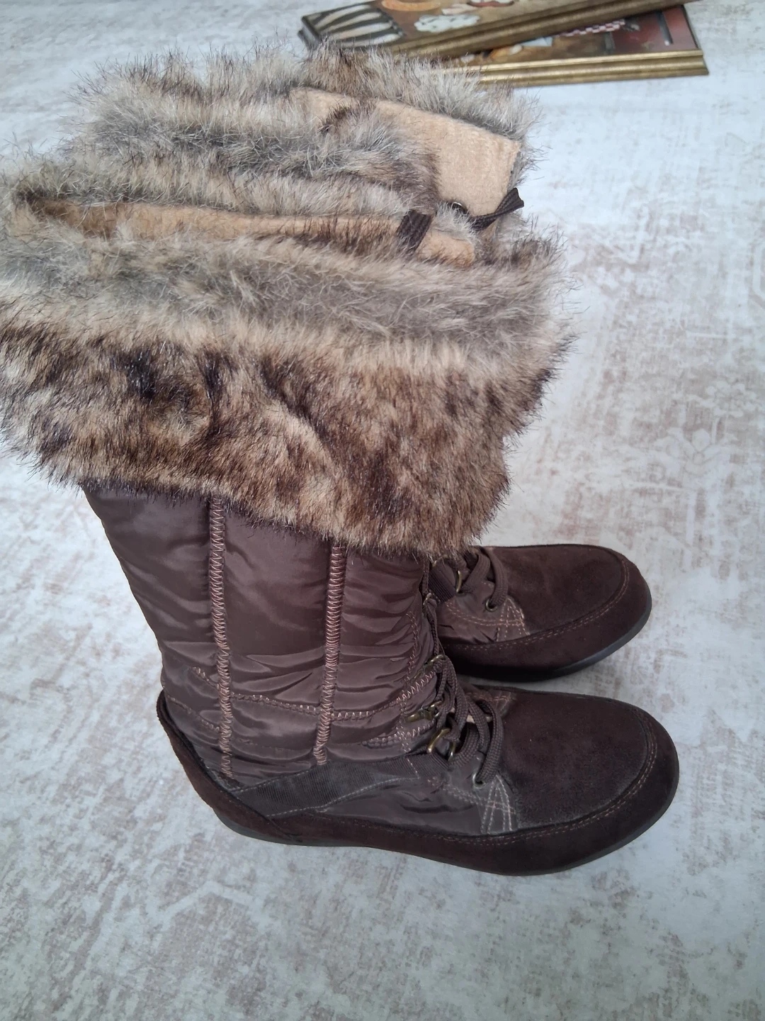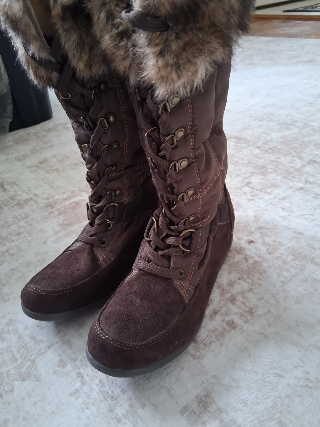 Cozy up in these stylish brown winter boots from Zigisohao. They feature a quilted nylon shaft and a soft faux fur lining for extra warmth. The lace-up front ensures a snug fit. Perfect for cold weather days! Size 7.