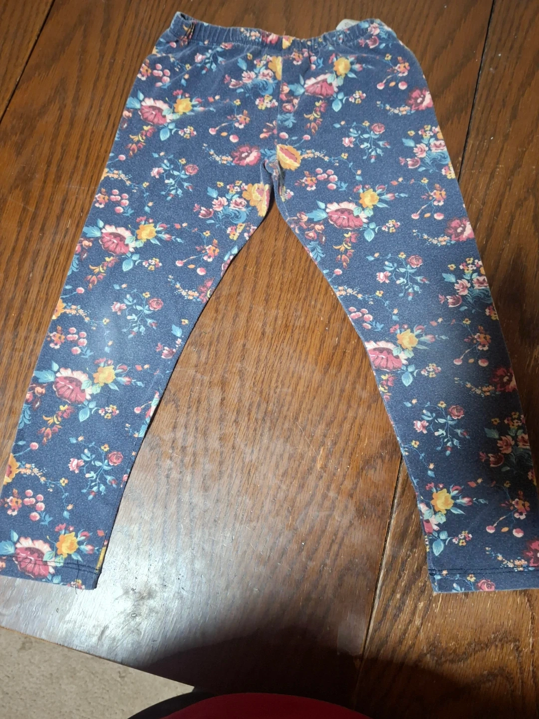 Comfy kids' leggings with a navy blue floral print. These are soft and stretchy for easy wear. Perfect for playtime or layering! Size 6