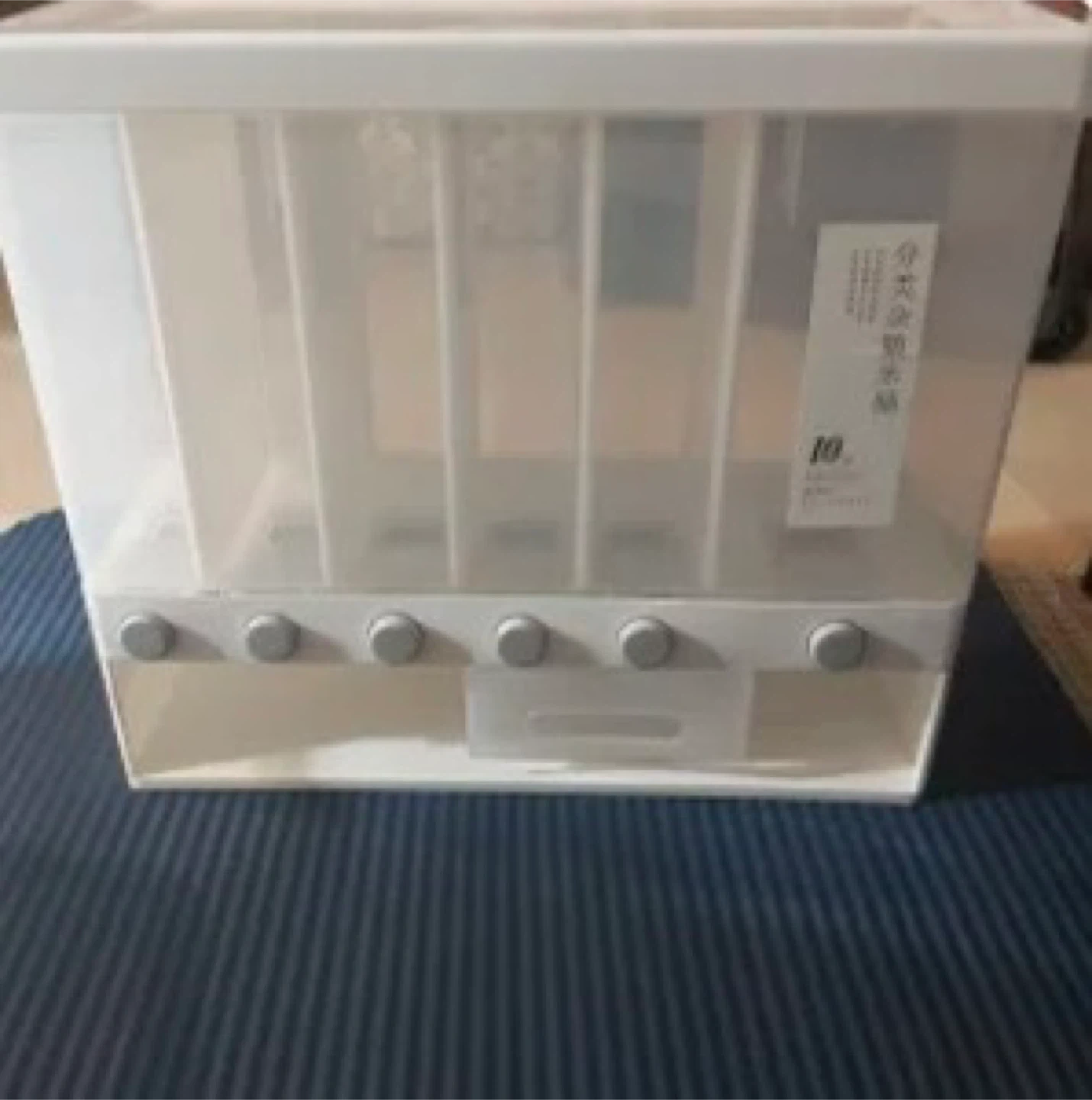 White cereal dispenser with six individual compartments. Each compartment has a dispensing knob for easy access. Plastic material.