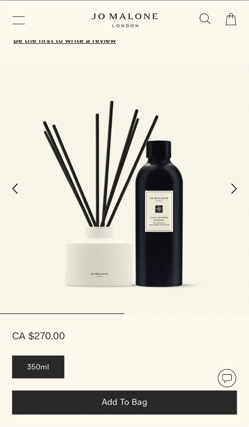 Jo Malone London diffuser set with Lilac Lavender & Lonicera scent. It's 350ml. The diffuser oil comes with reeds and a ceramic holder.