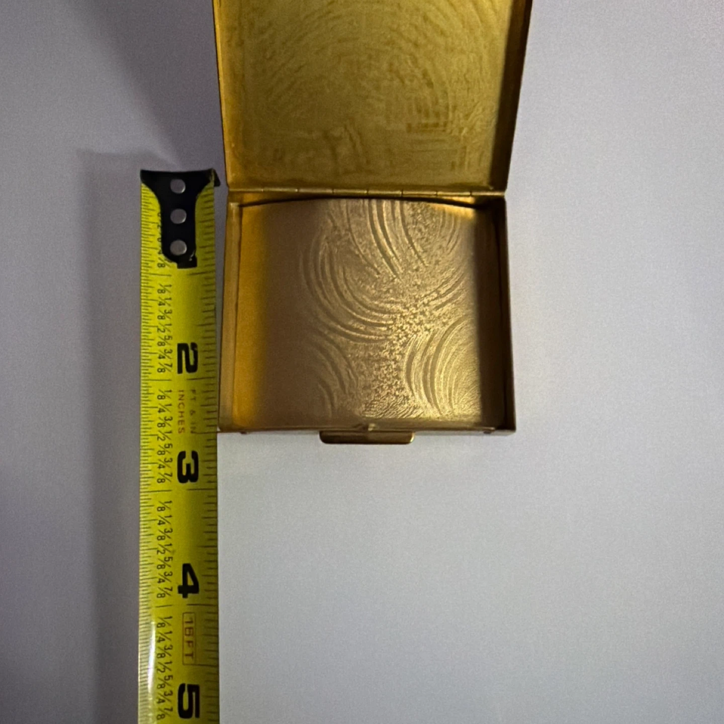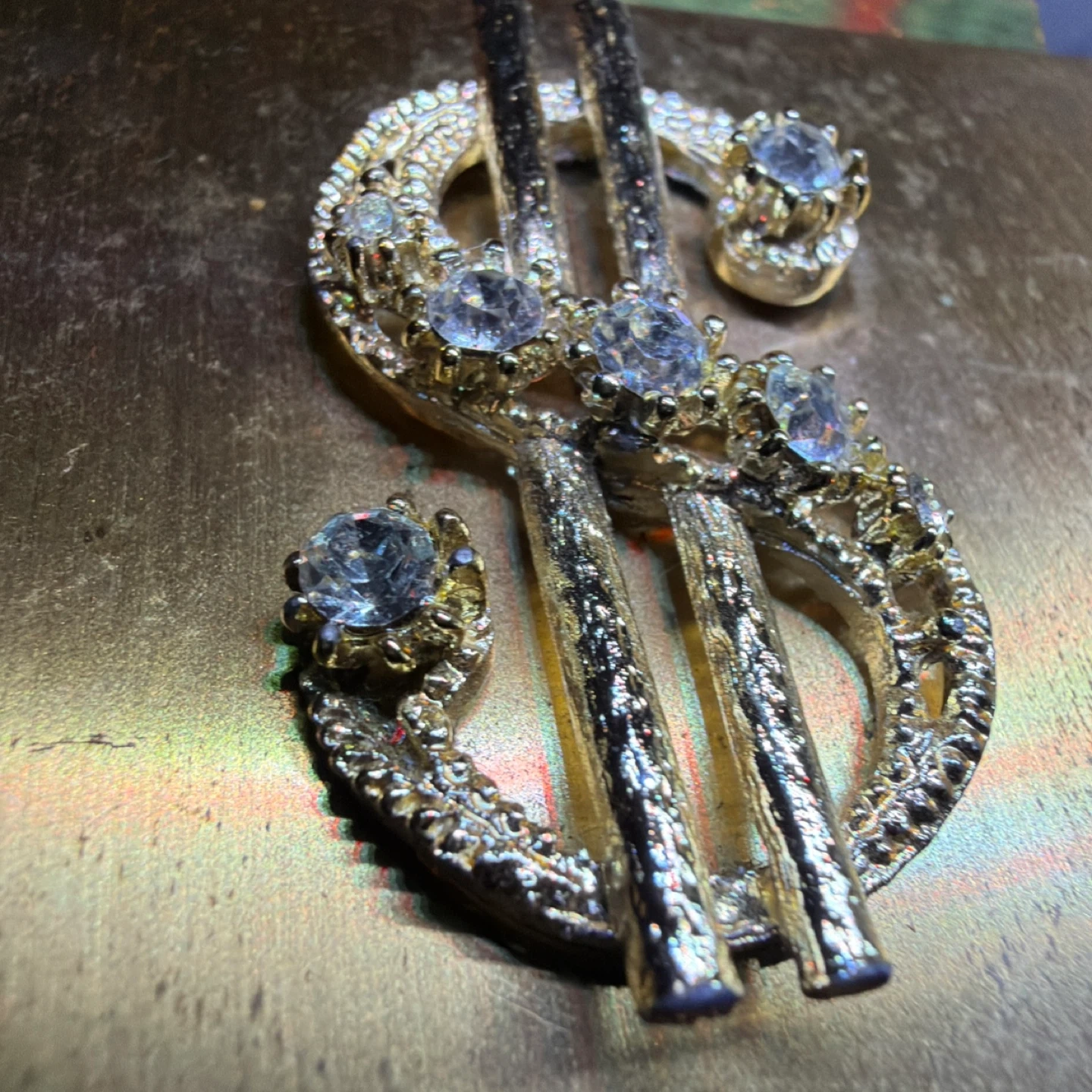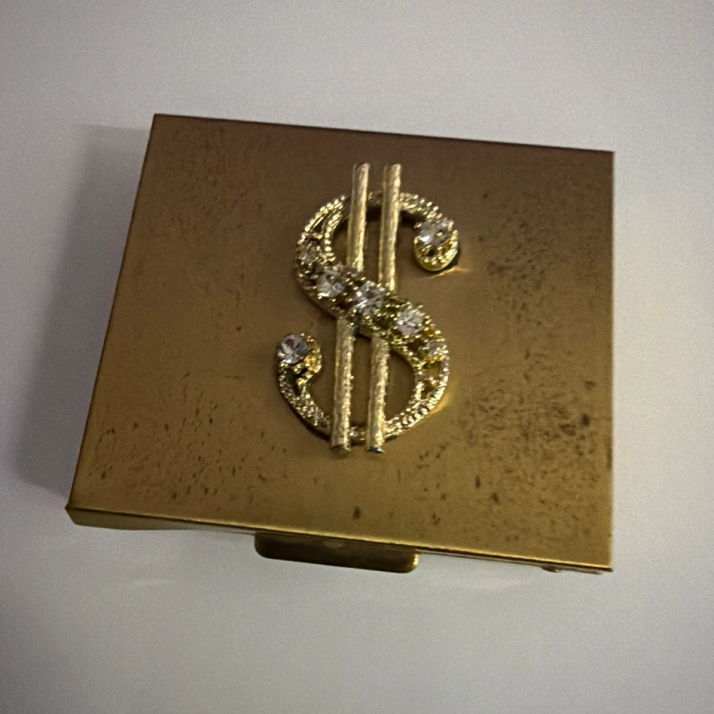 This vintage gold tone compact has a textured interior and exterior. It features a decorative dollar sign charm with faux diamonds. Measures approximately 3.5 inches by 3 inches.
