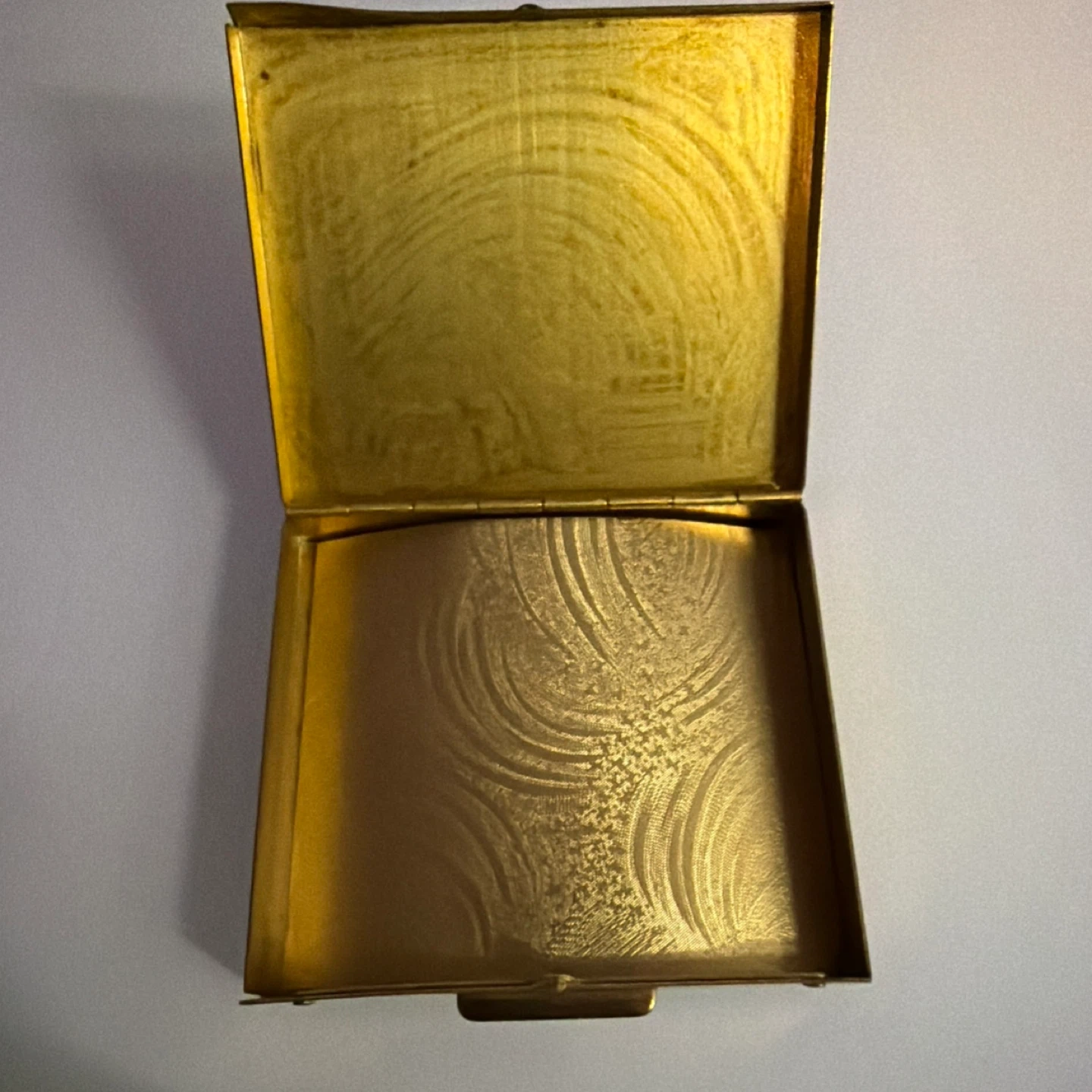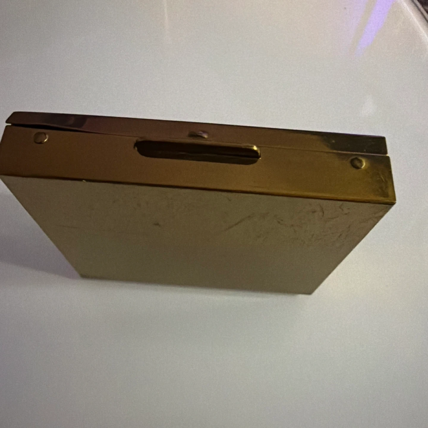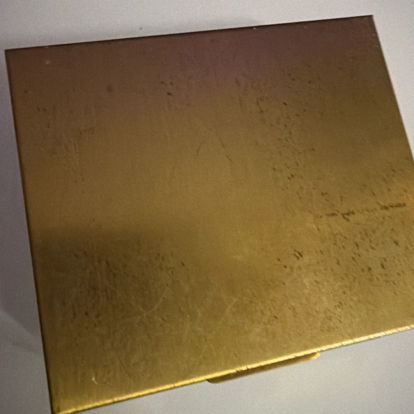 This vintage gold tone compact has a textured interior and exterior. It features a decorative dollar sign charm with faux diamonds. Measures approximately 3.5 inches by 3 inches.