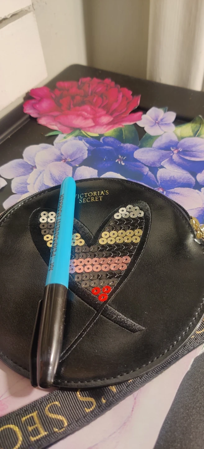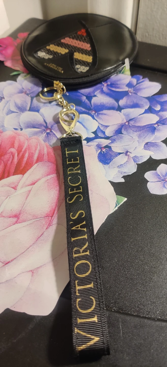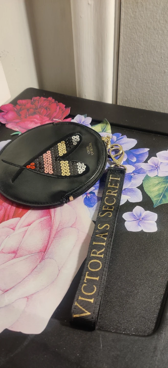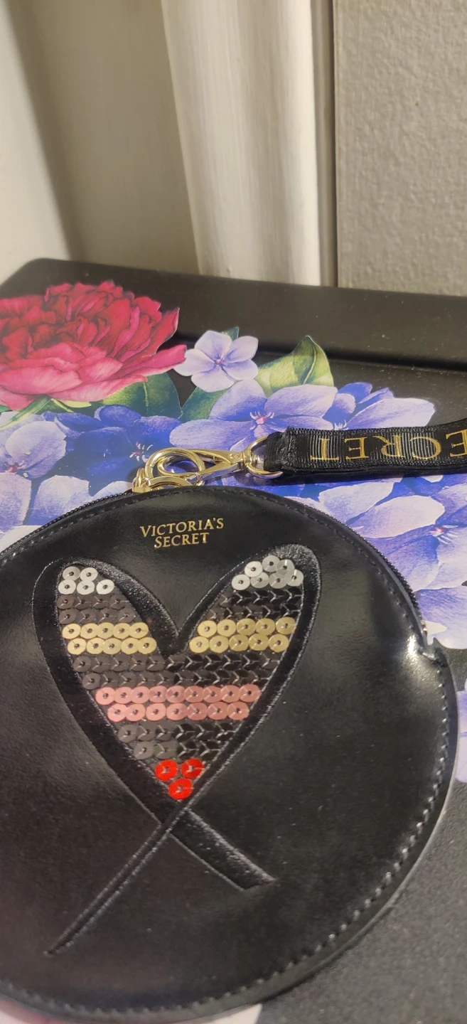 Black round coin purse from Victoria's Secret. It features a heart design with colourful sequins. Comes with a detachable Victoria's Secret branded strap and keychain. Zipper closure.