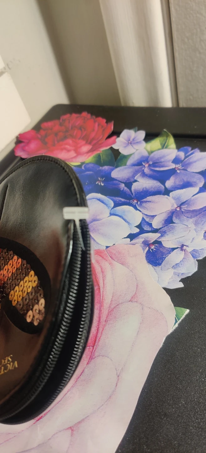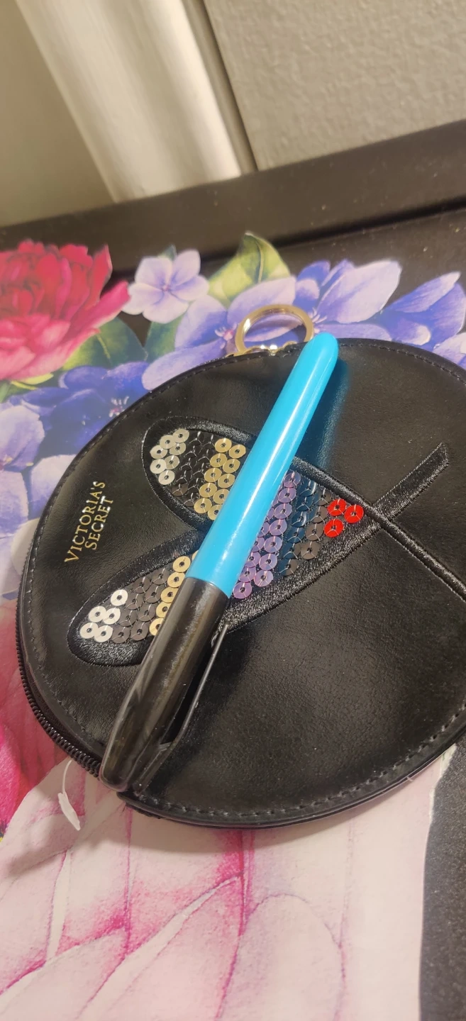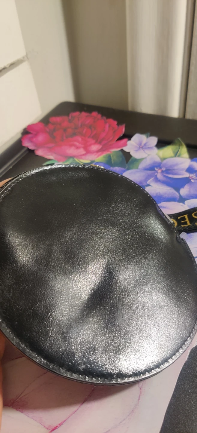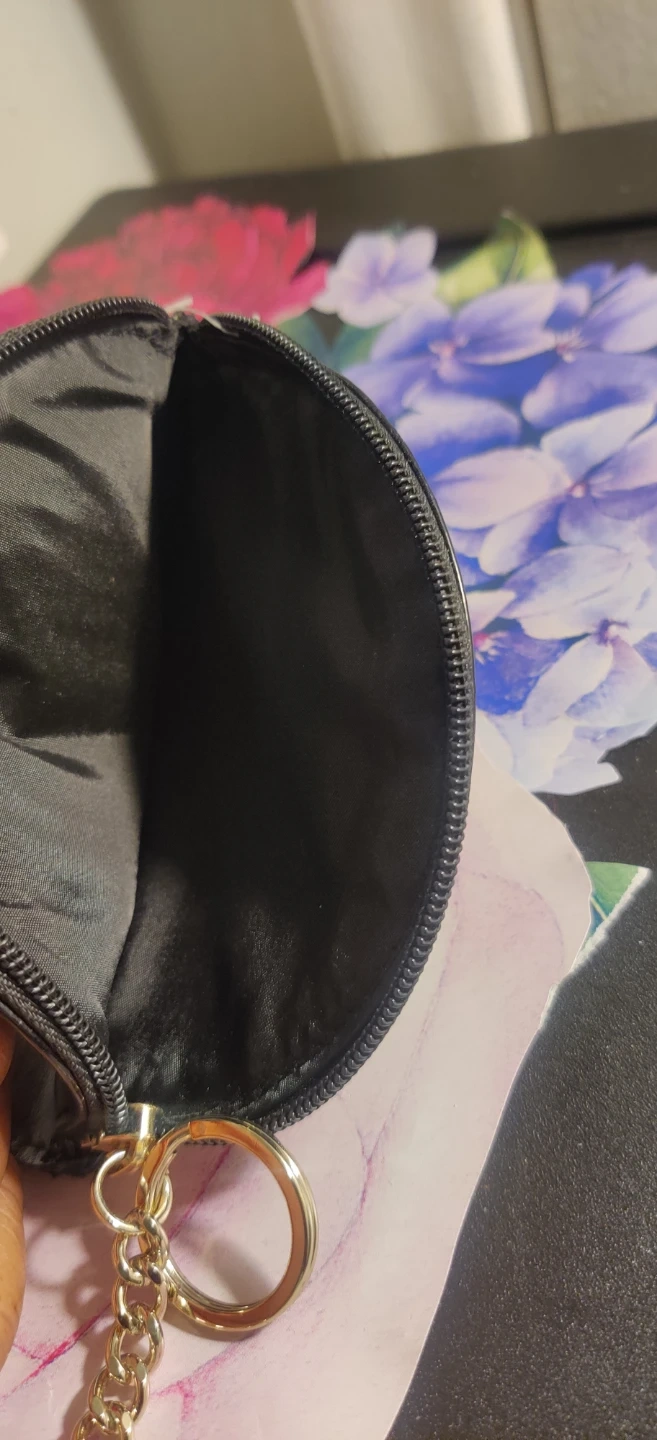 Black round coin purse from Victoria's Secret. It features a heart design with colourful sequins. Comes with a detachable Victoria's Secret branded strap and keychain. Zipper closure.