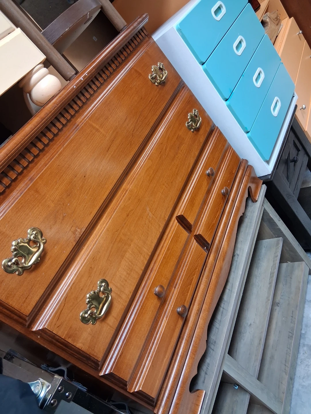 This wooden dresser features a warm cherry finish and ornate brass drawer pulls. It has multiple drawers for storage. The top of the dresser has a decorative carved edge. This piece offers ample storage for clothing and other household items.Tienda de segunda mano uvicacion 5521 w de la Belmont aven open 11 am cierrre de la tienda 7 pm llamar si tieneuna pregunta sobre un producto si estan disponibles +17733268814 llamar por WhatsApp