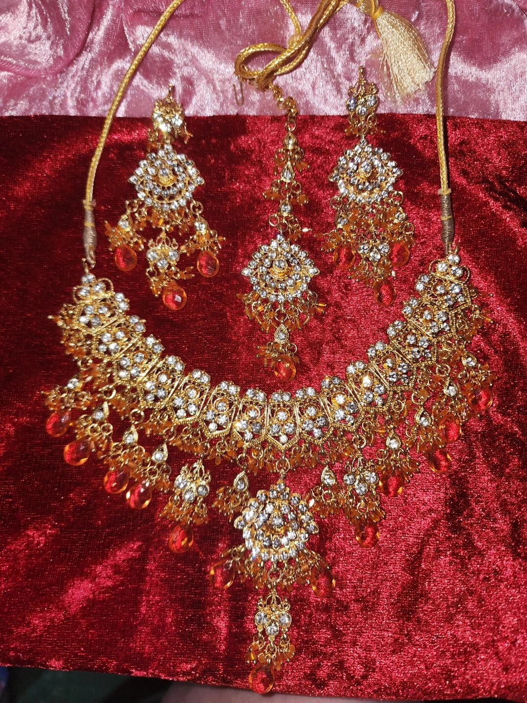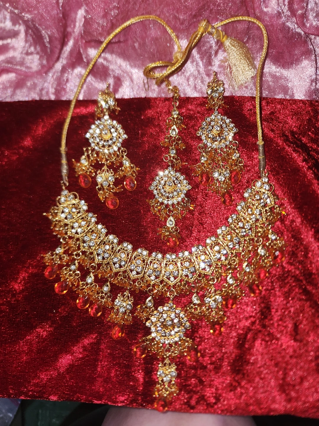 60Beautiful necklace and earrings set, perfect for adding a touch of elegance to any outfit! The set features intricate detailing with sparkling stones and red accents. It's in great condition and ready to be loved by someone new, or a great gift idea