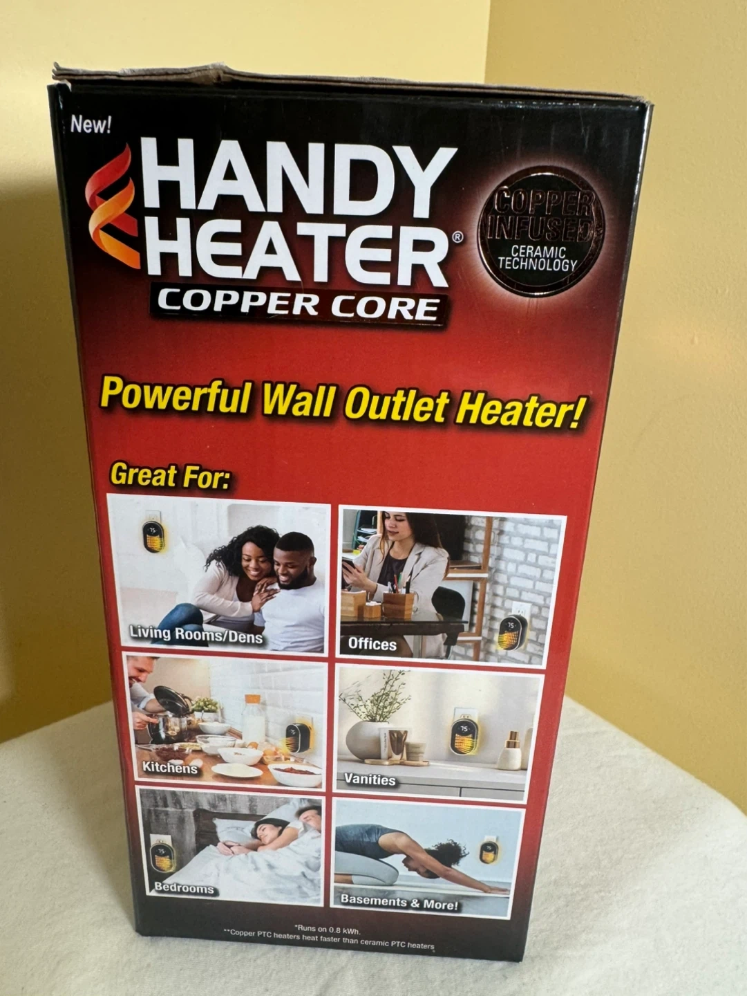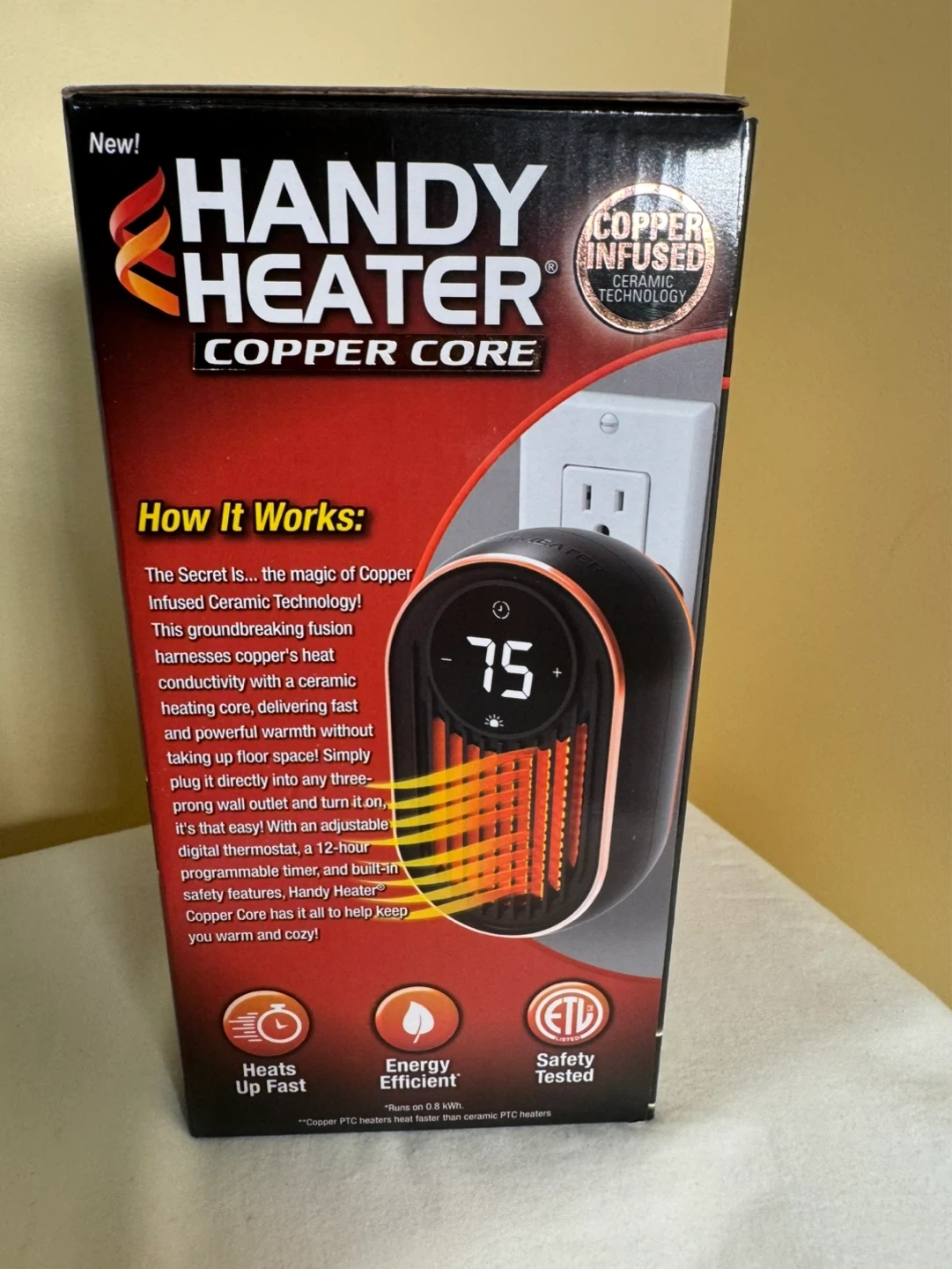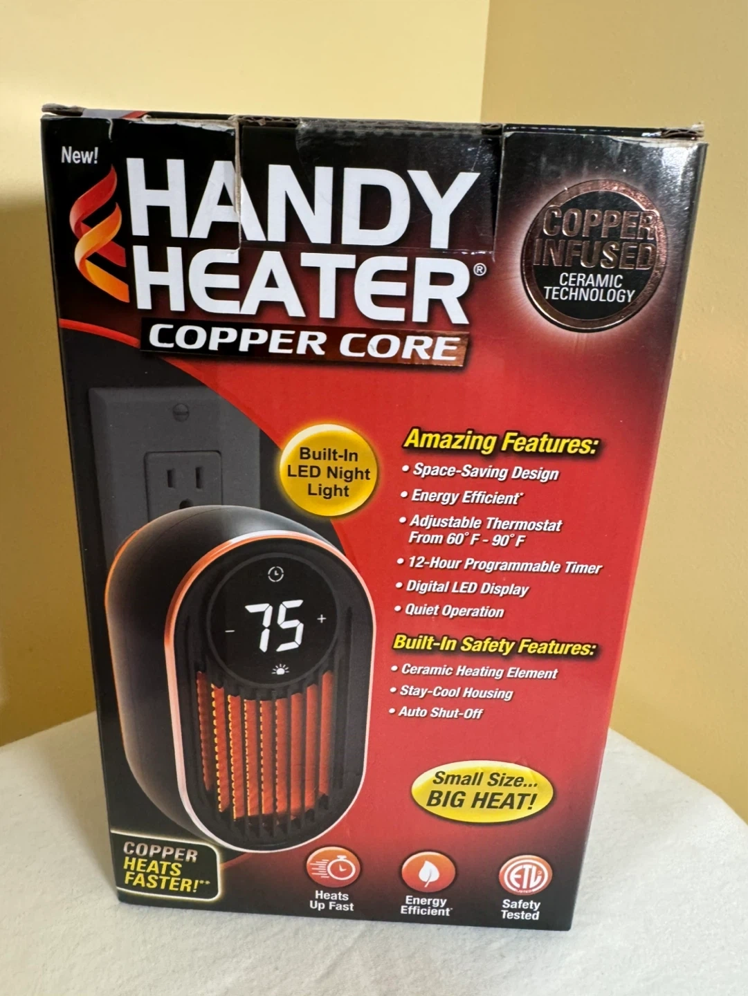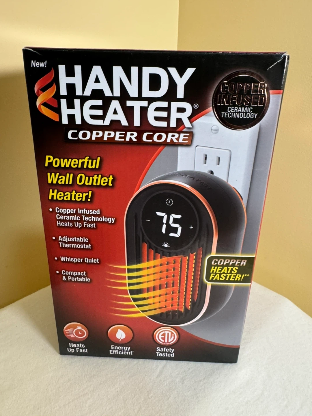 This Handy Heater Copper Core is a powerful wall outlet heater! It features copper infused ceramic technology that heats up fast. The unit has an adjustable thermostat from 60°F - 90°F and a 12-hour programmable timer. It also has a quiet operation and a digital LED display.