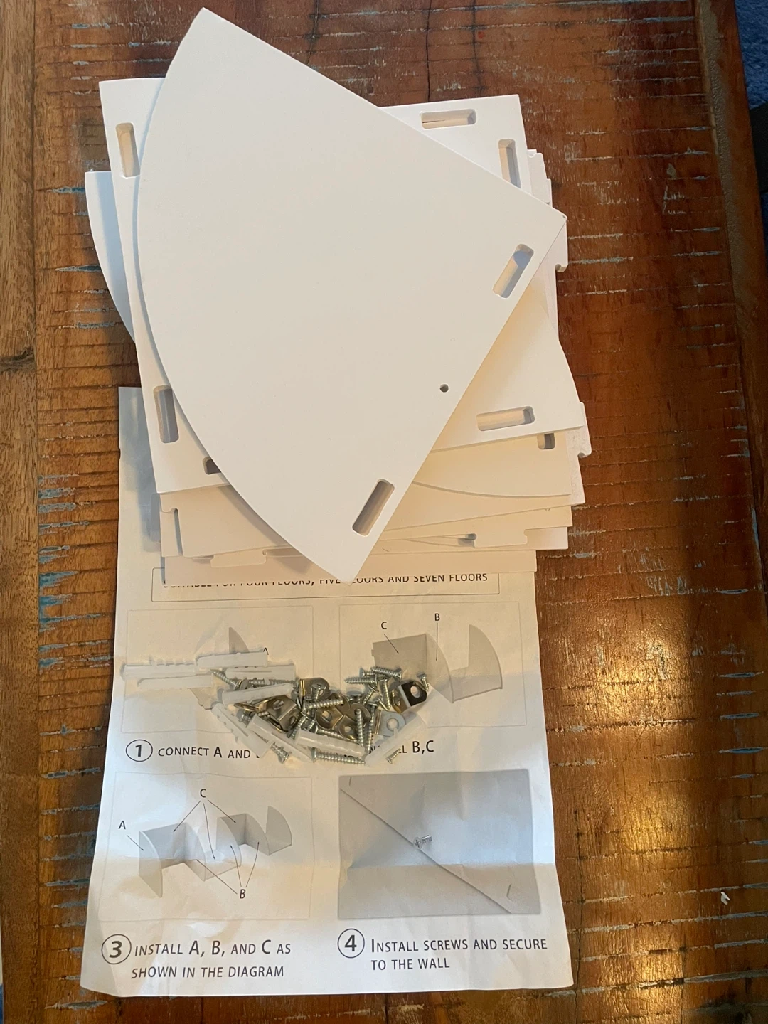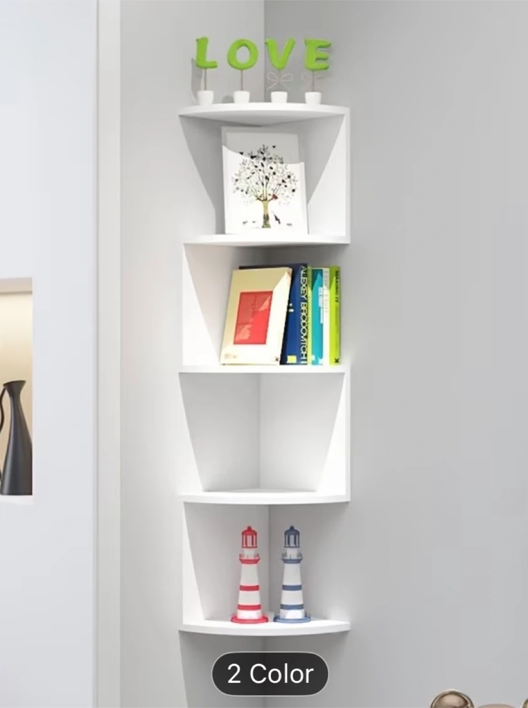 This white corner shelf was never assembled and includes hardware for mounting. It's a great way to display your knickknacks or decor. Multiple shelves offer ample storage space.