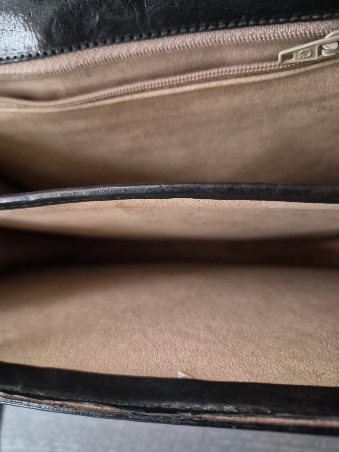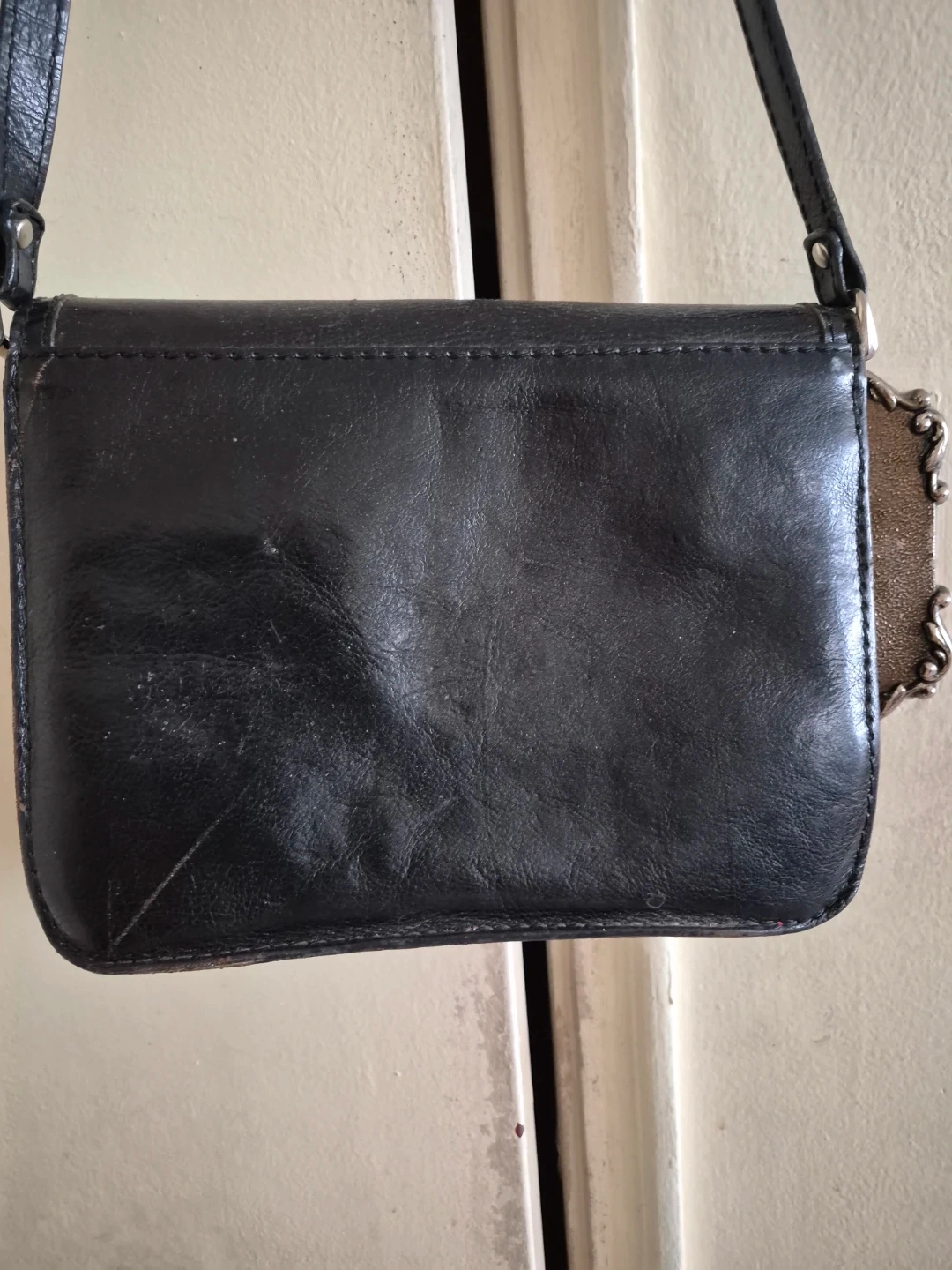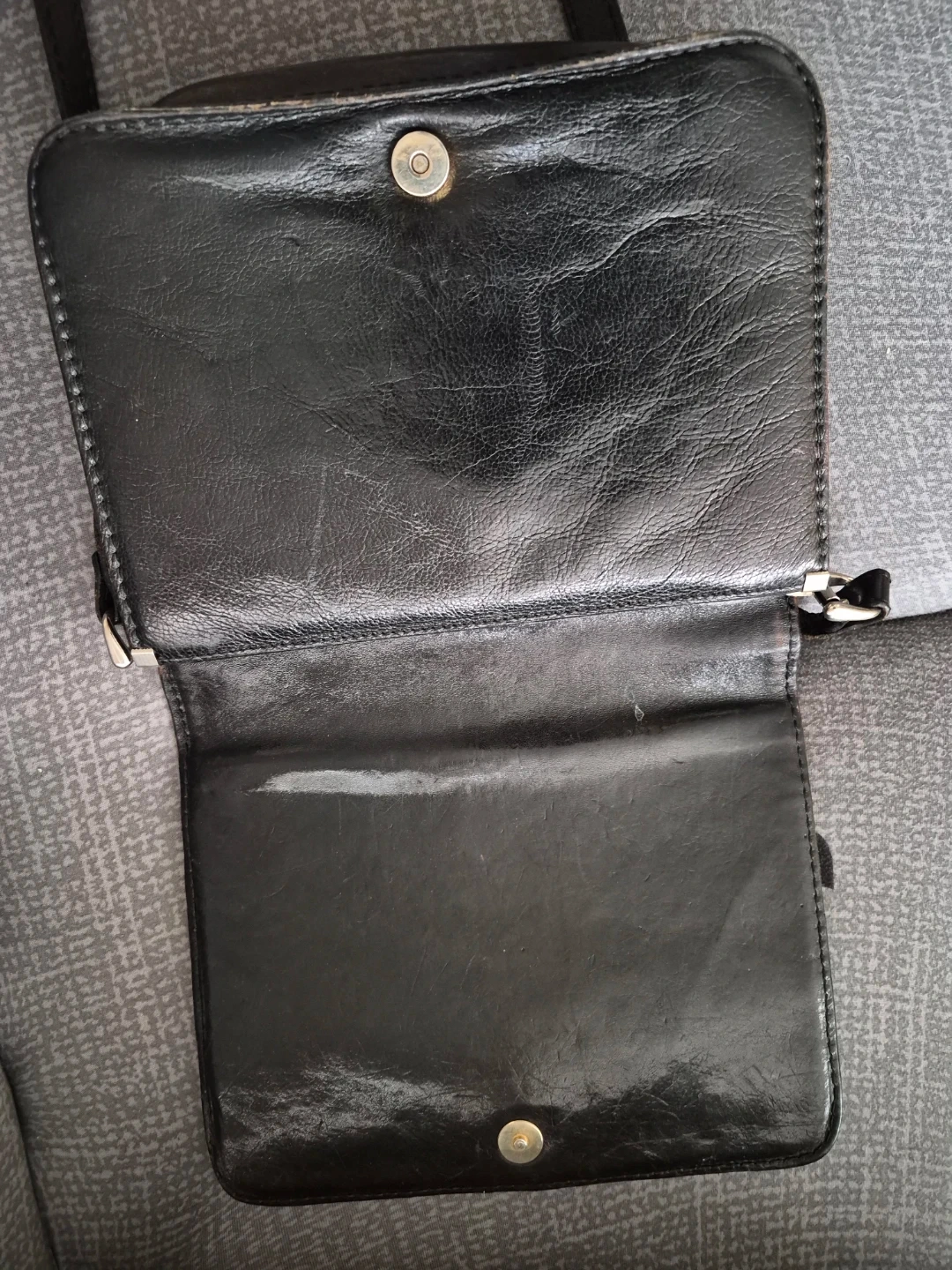 This is a black leather shoulder bag. It has a snap closure and an interior zippered pocket. The strap is adjustable.