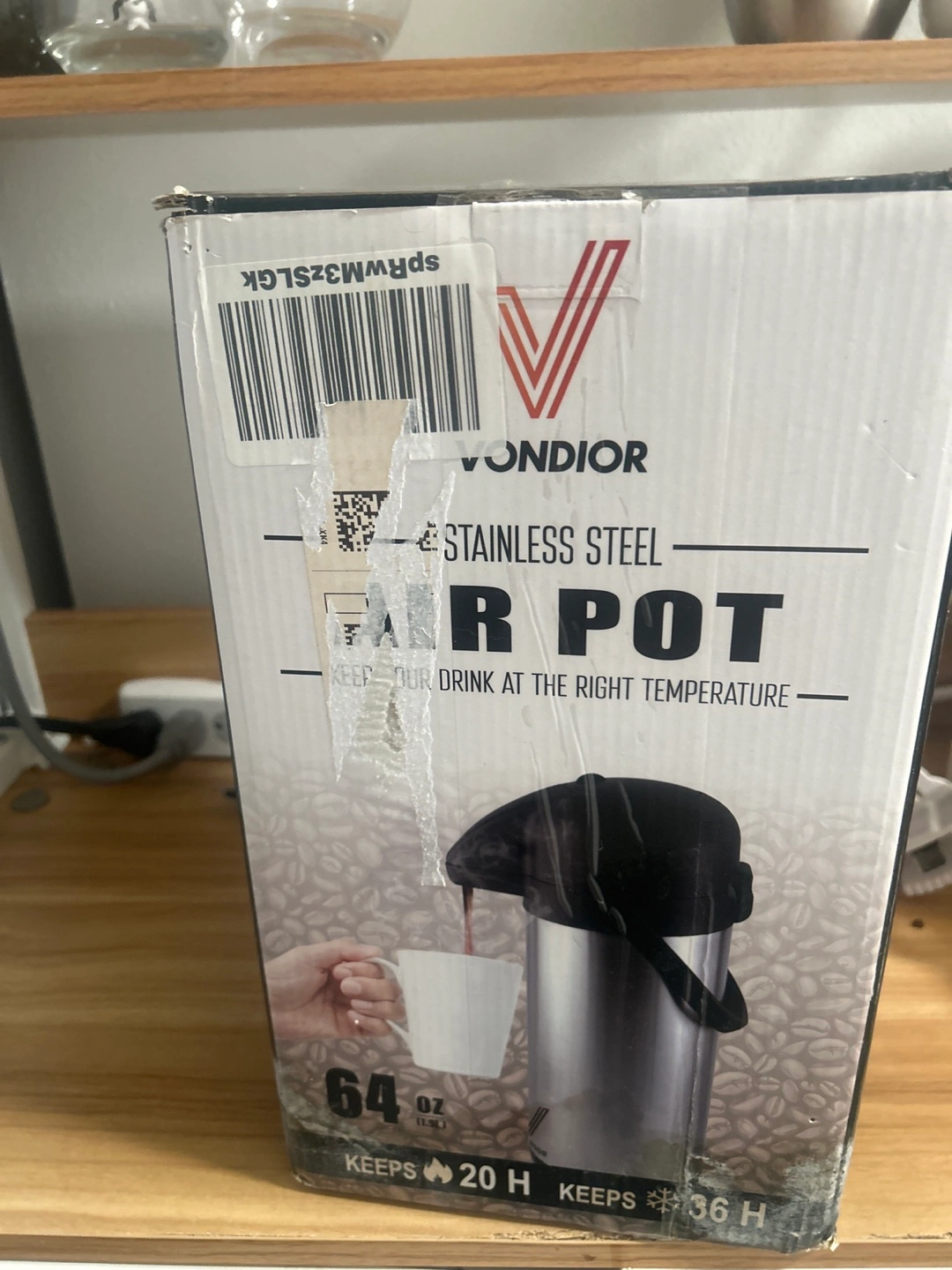 I'm selling a Vondior stainless steel air pot. Never opened, I got it to support my boss’s second business thinking I’d get a raise but I did not lol. It's designed to keep your drink at the right temperature. It holds 64oz (1.9L) and keeps drinks hot for up to 20 hours and cold for up to 36 hours