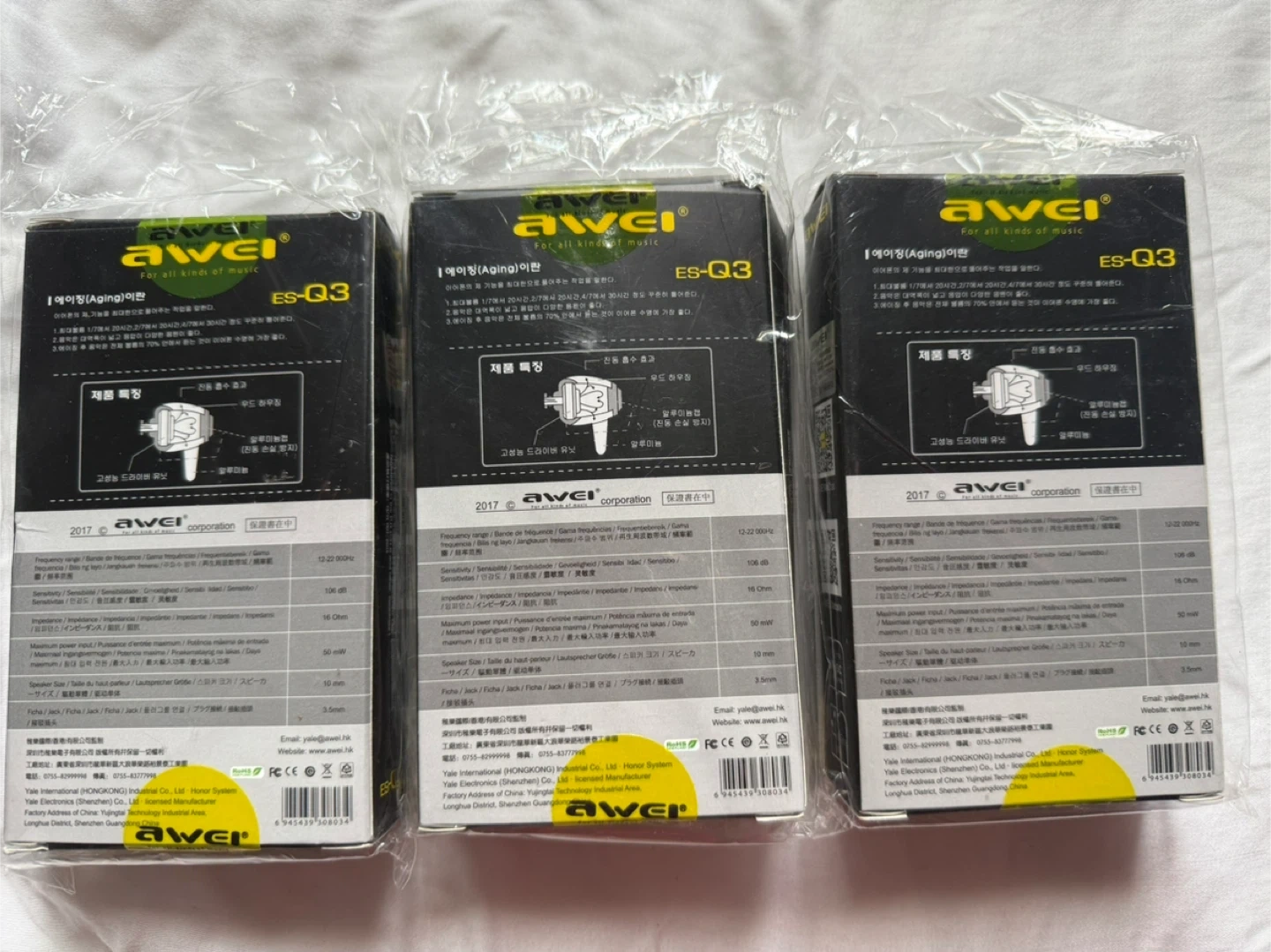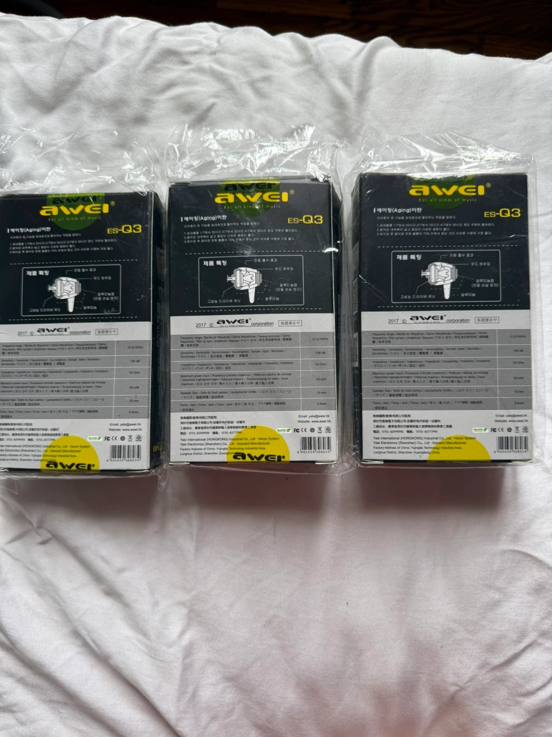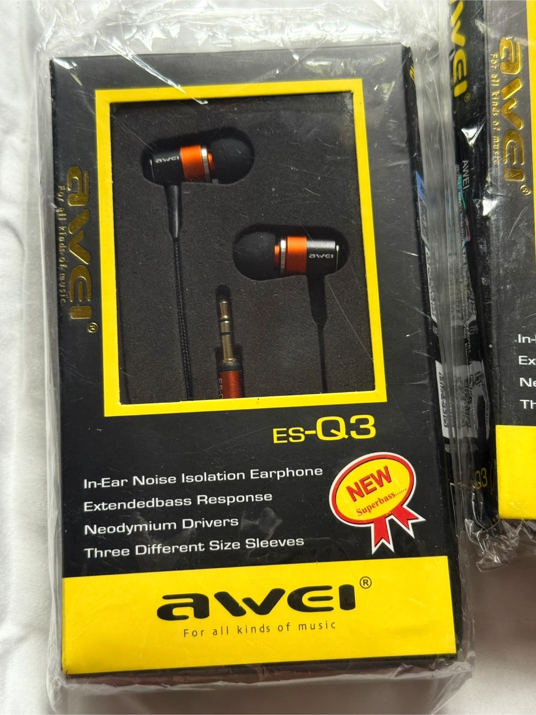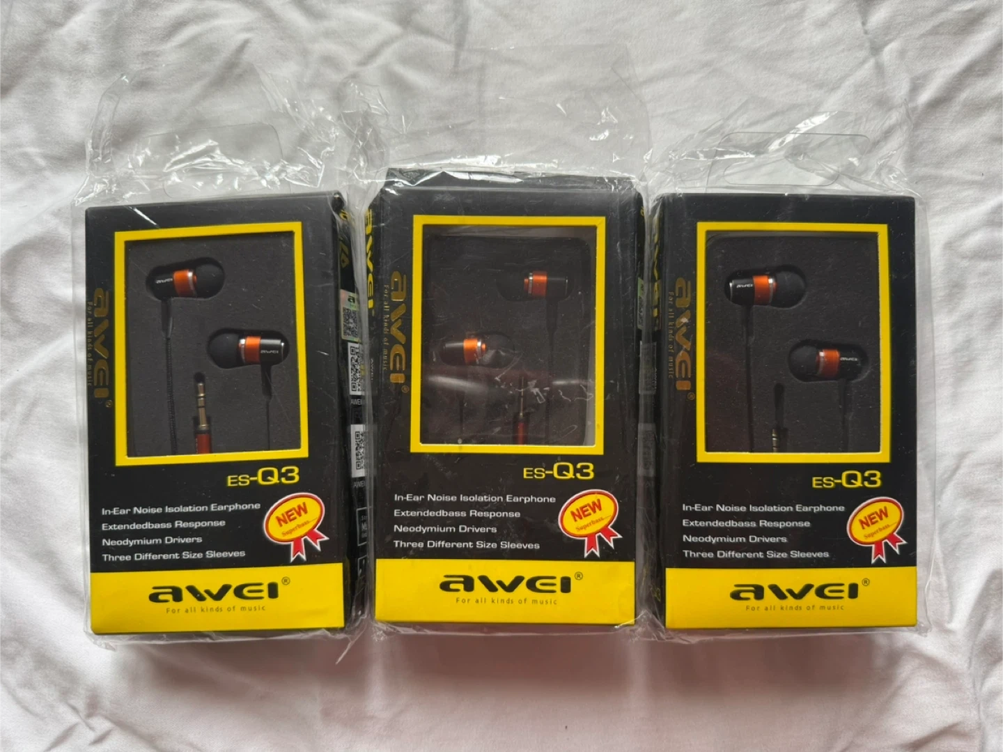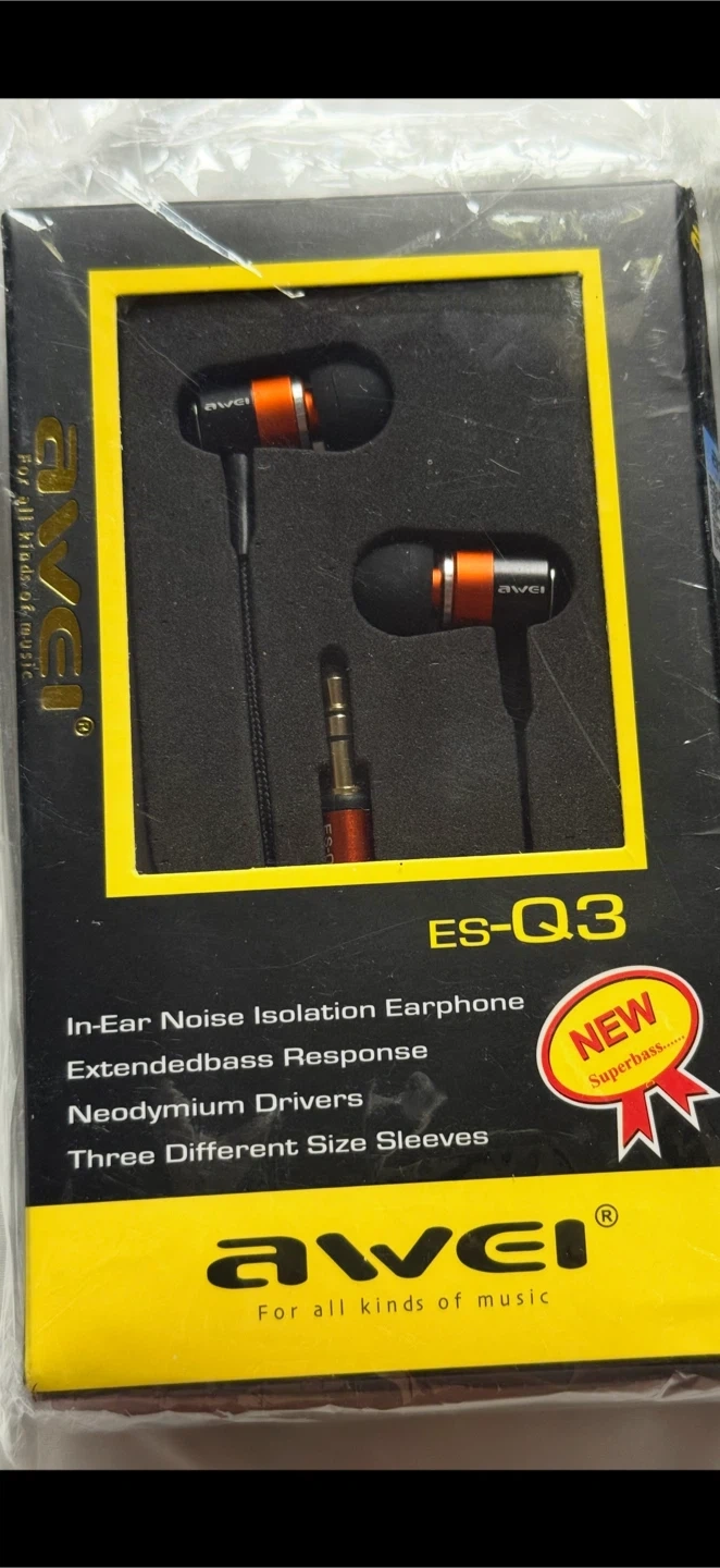 I'm selling 3 new Awei ES-Q3 earphones! These are in-ear noise isolation earphones that come with extended bass response, neodymium drivers, and three different size sleeves. They're still in their original packaging.