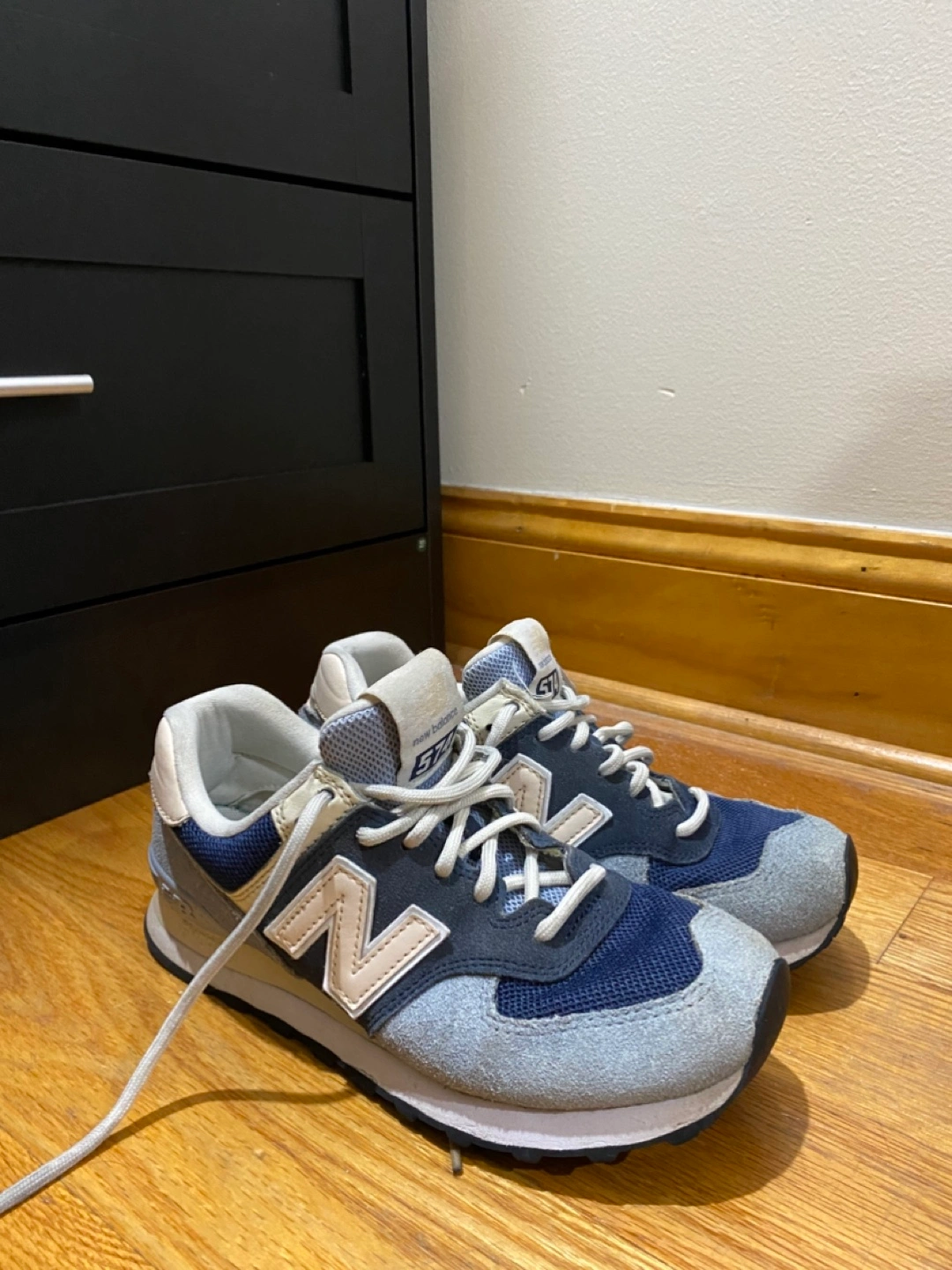 Selling a pair of New Balance 574 sneakers in a blue and gray colorway! They're in great condition and ready for a new home. These are US size 7, UK size 5, EUR size 37.5