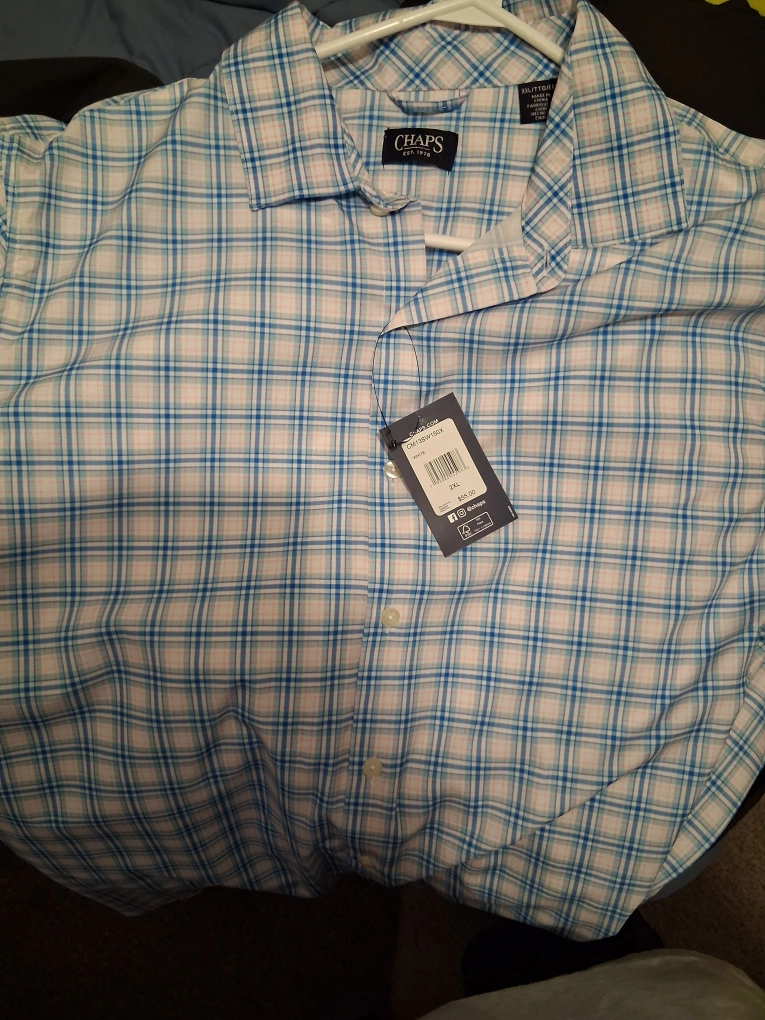 60I'm selling a brand new Chaps button-down shirt! It's a size 2XL and has a nice white and blue plaid pattern. The original price tag is still attached, showing it was originally $55