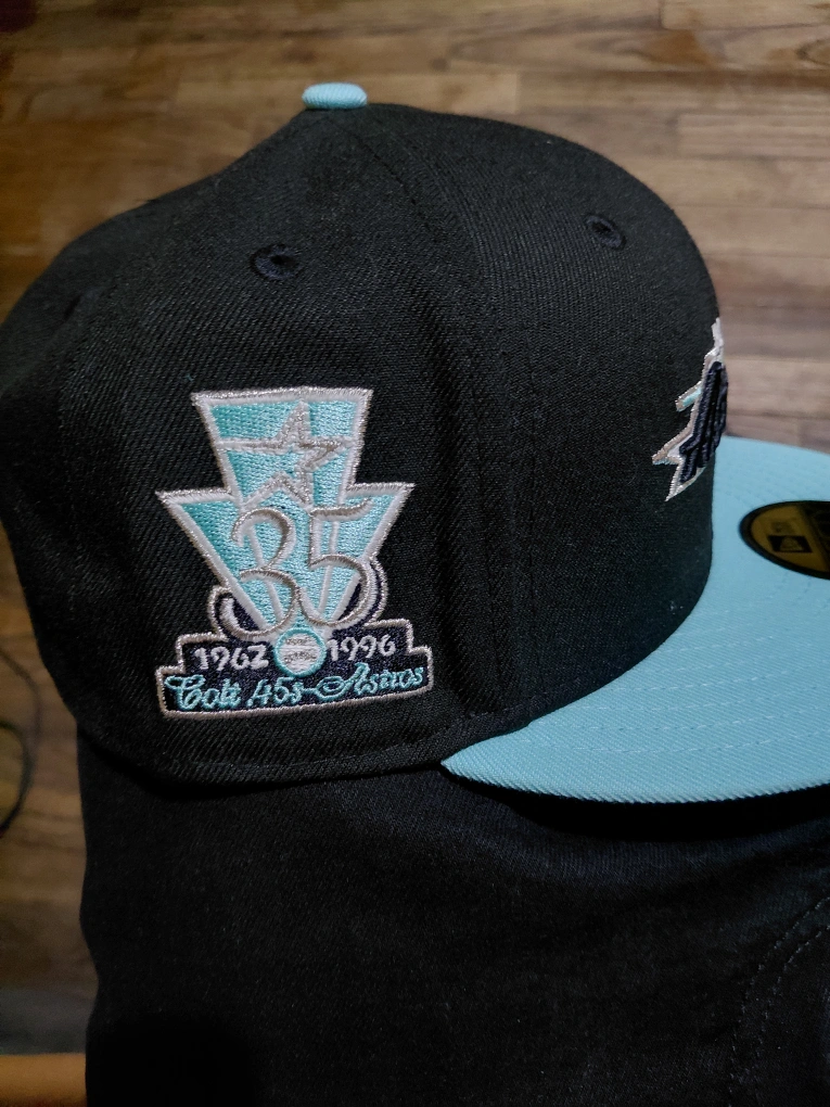 60Selling a New Era Houston Astros fitted hat in size 7 1/4. It features a black crown and a light blue brim. There's also a '1962-1996 Colt .45s Astros' patch on the side