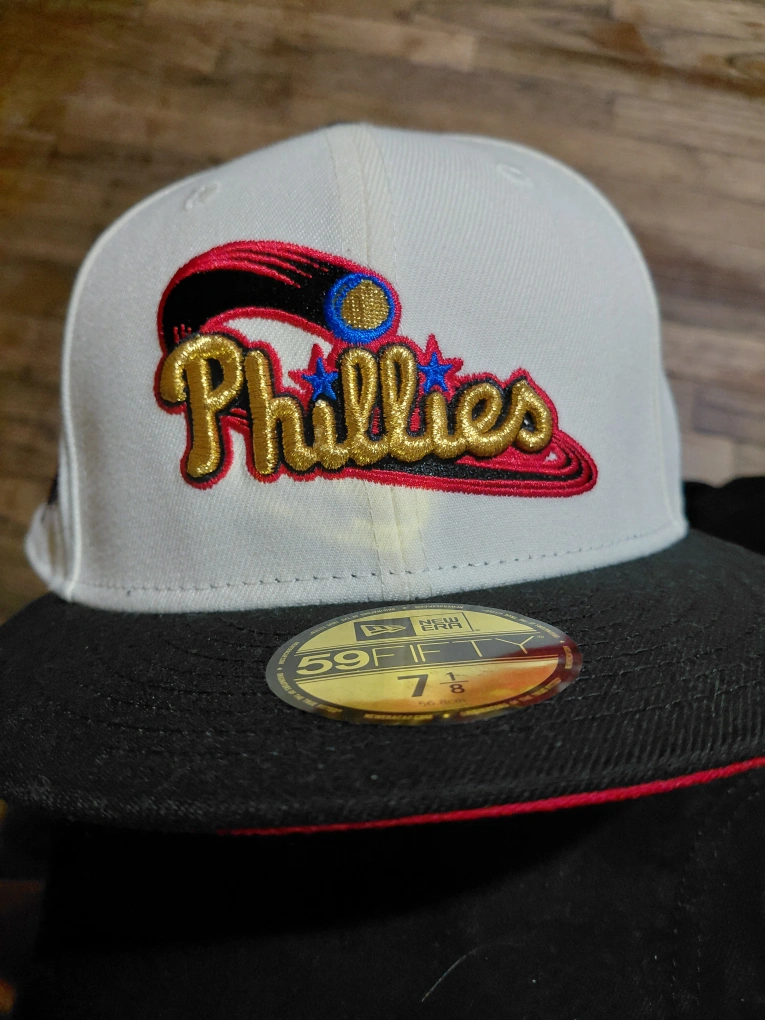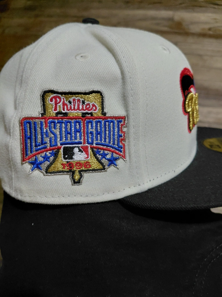 60Selling a New Era Philadelphia Phillies 59FIFTY hat in size 7 1/8. Features a white crown and black brim with a red underbrim. The front has a gold embroidered Phillies logo with red and black accents. The right side has a 1996 All-Star Game patch