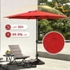 Here's a red orange patio umbrella perfect for providing shade on sunny days. It features a durable crank system for easy opening and closing, and a one-button tilt function to adjust the angle. The umbrella also offers UPF 50+ protection and blocks 99.9% of UV rays