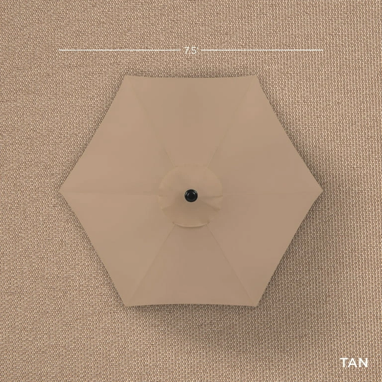 This tan patio umbrella is perfect for providing shade on sunny days! It features UV protection with a quality polyester fabric shade to diffuse sunlight. The durable powder-coated steel frame withstands wear over time. It also has a built-in crank to easily open and close the umbrella, and a push-button tilt to adjust the angle with a locking tilt joint. The umbrella is 7.5 feet wide!