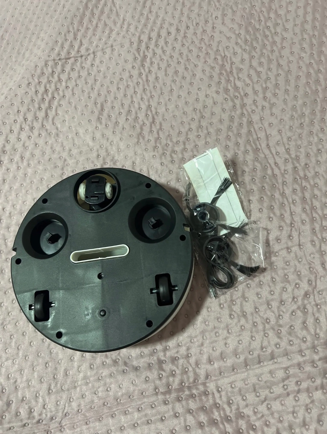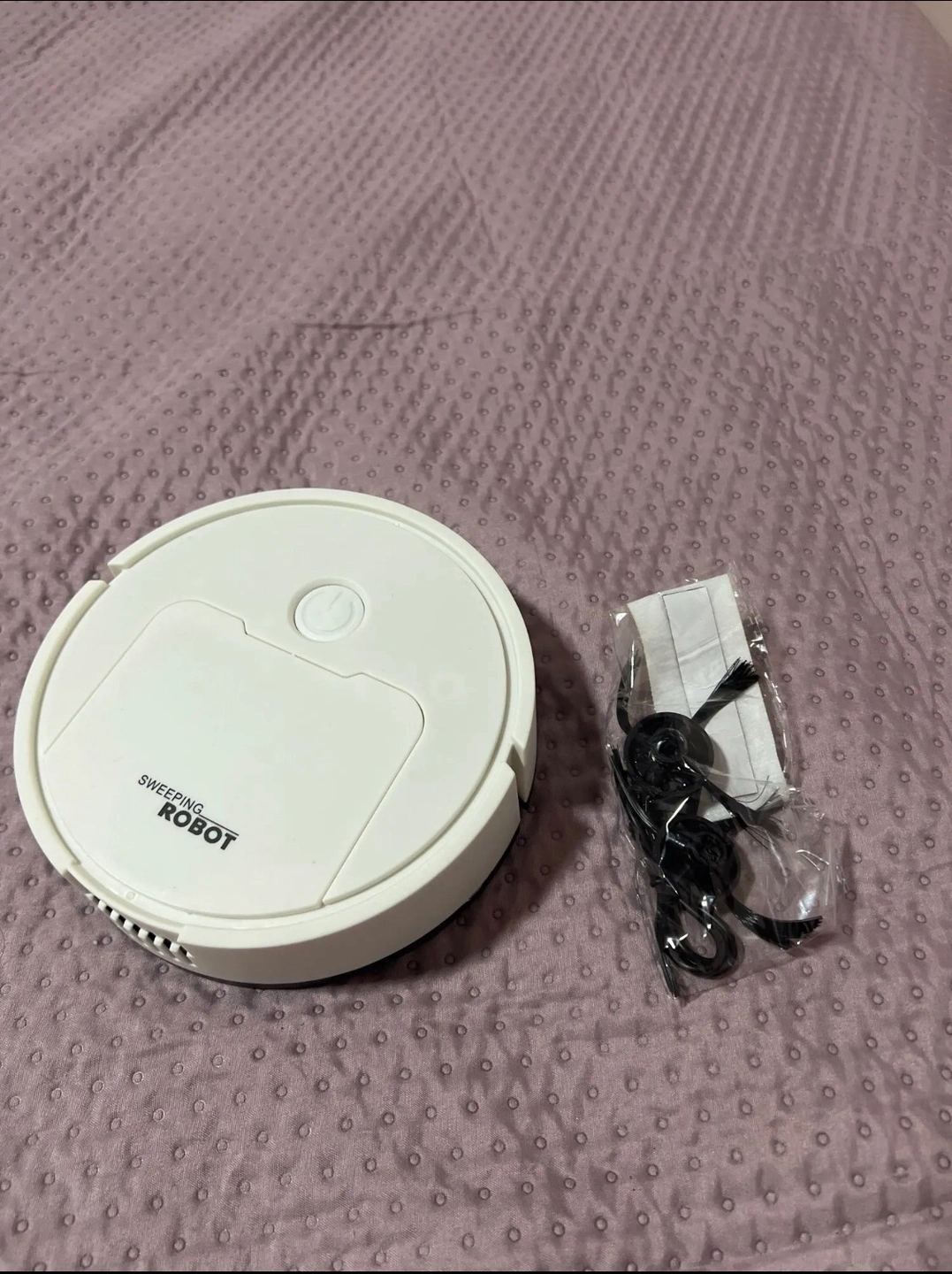 It’s new mini vacuum robot, working well and cute, especially collecting hairs. Come with a box. Rechargeable.
