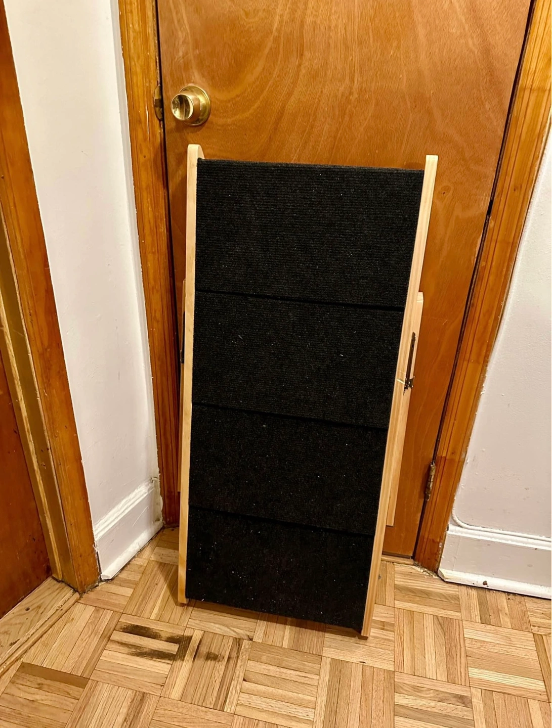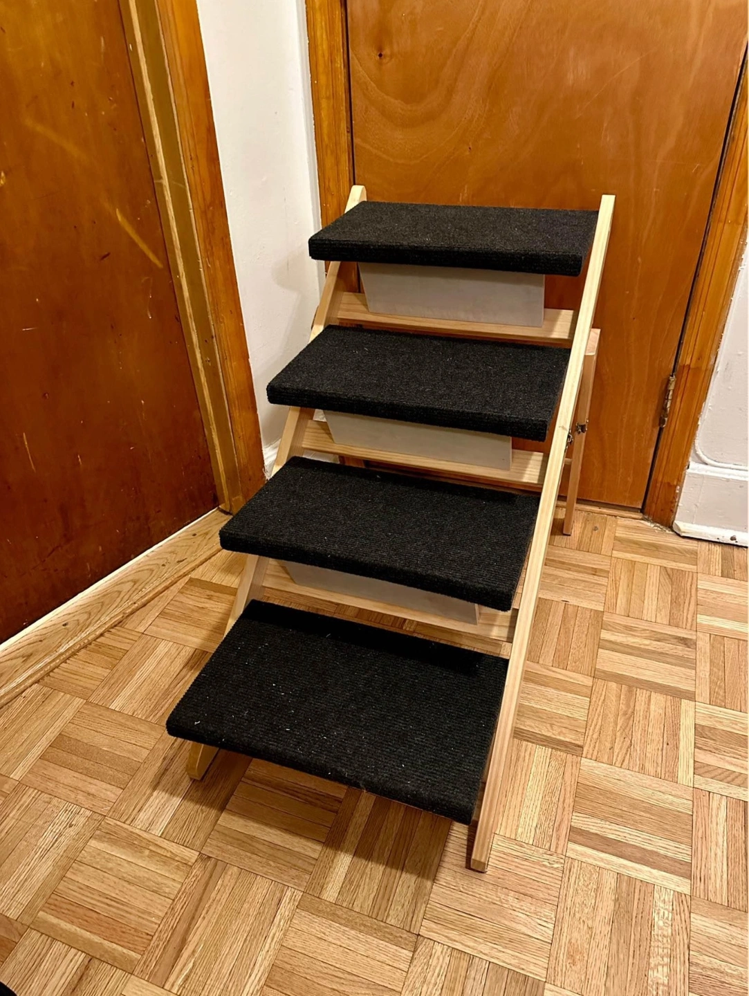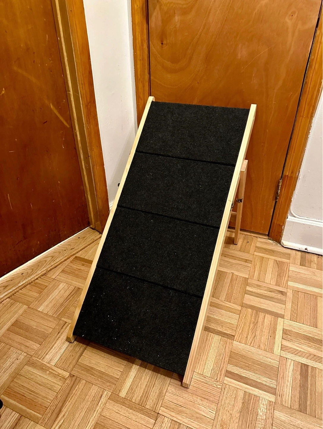 15*NEW* foldable pet stairs or ramp, it can be switched to whichever style works best for your furry friend! This is perfect for the bed, couch, or any higher surface your pet might be trying to reach. Barely used (maybe once or twice), our puppy simply did not like using it and preferred to jump on and off, so we'd rather someone put it to better use. Minor scuff that was present when we received the product. Dimensions are 30.9"L x 18.5"W x 25.6"H. 4 steps included, coated in a carpet like covering. Extremely sturdy, and when folded up it's a space saver and can be easily tucked away. Originally $110. Please note: Pricing is based on condition, time used and what I think it's still valued at, but I am always open to negotiation so please do not hesitate to reach out. Thank you!