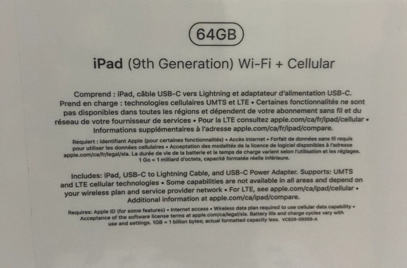 New, sealed in original packaging. iPad 9th Generation Wifi + Cellular 64 GB Space Gray Includes: iPad, USB-C to Lightning cable, and USB-C Power Adapter. Supports: UMTS and LTE cellular technologies. Some capabilities are not available in all areas and depend on your cellular plan and service provider network. For LTE, see apple.com/ca/ipad/cellular. Local pickup and cash only Lowballers will be ignored Ref: Apple, IPad, 9th Generation, WiFi + Cellular, 64GB
