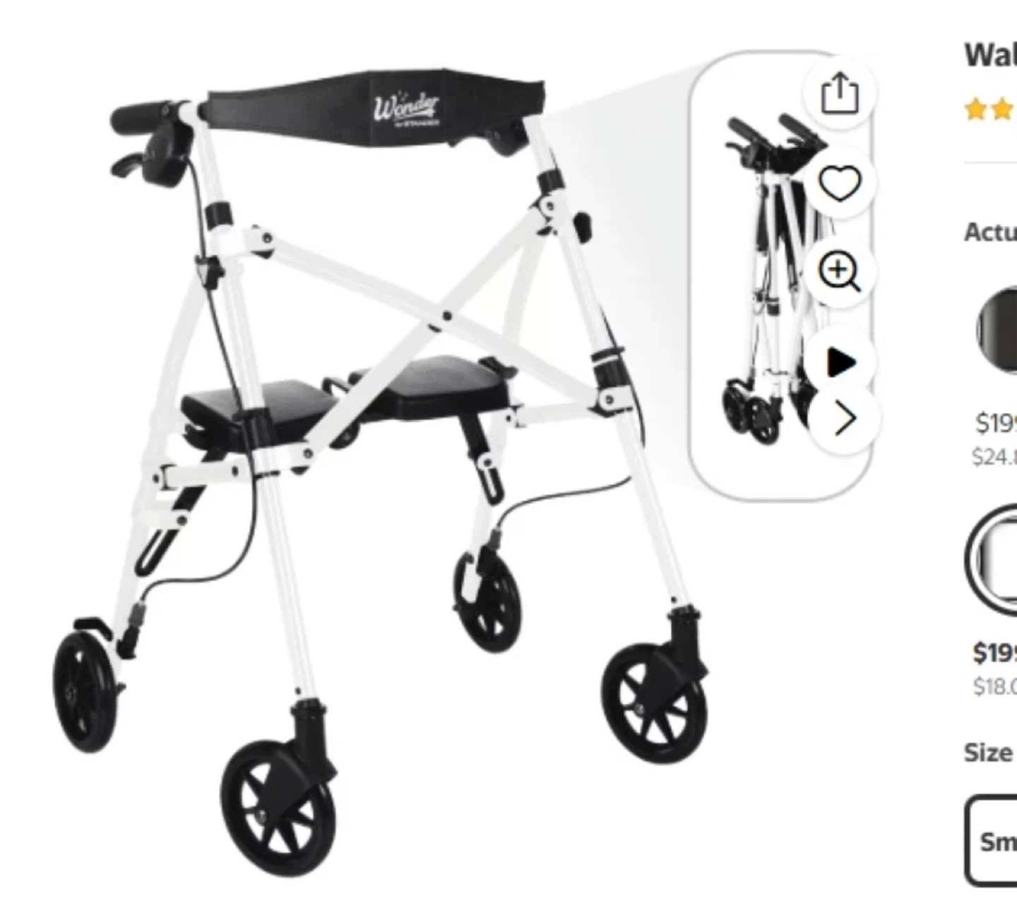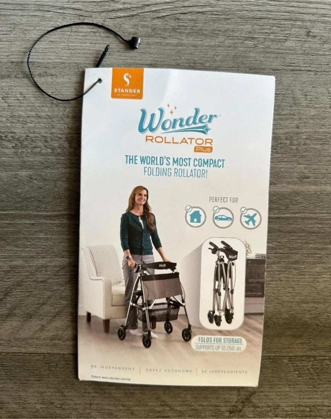 Stander Wonder Rollator Walker White New, Open Box, Not in Original Box Convenient seat for resting Easily folds to be portable Handle height adjustable 33" to 36" and supports up to 250 pounds