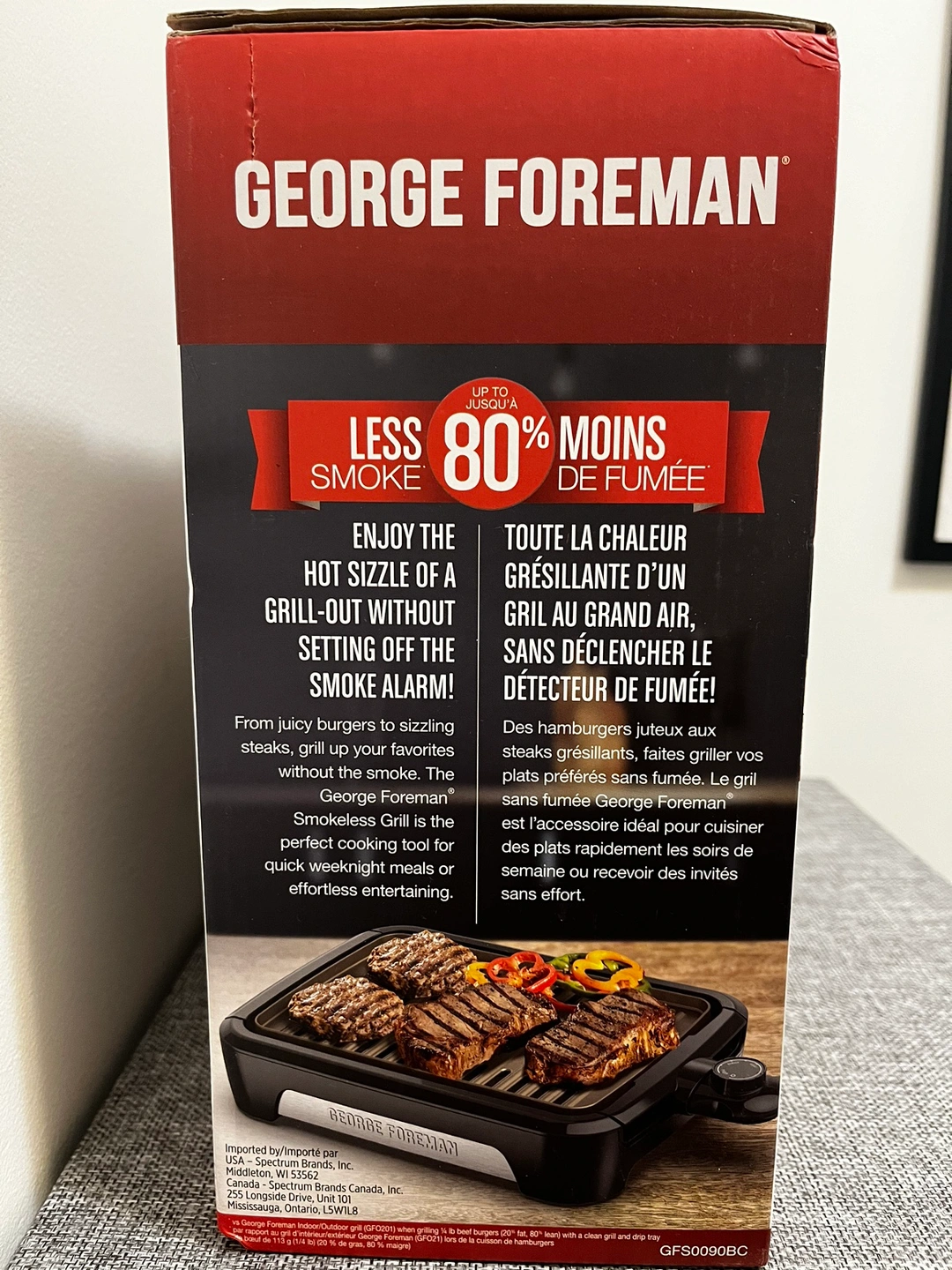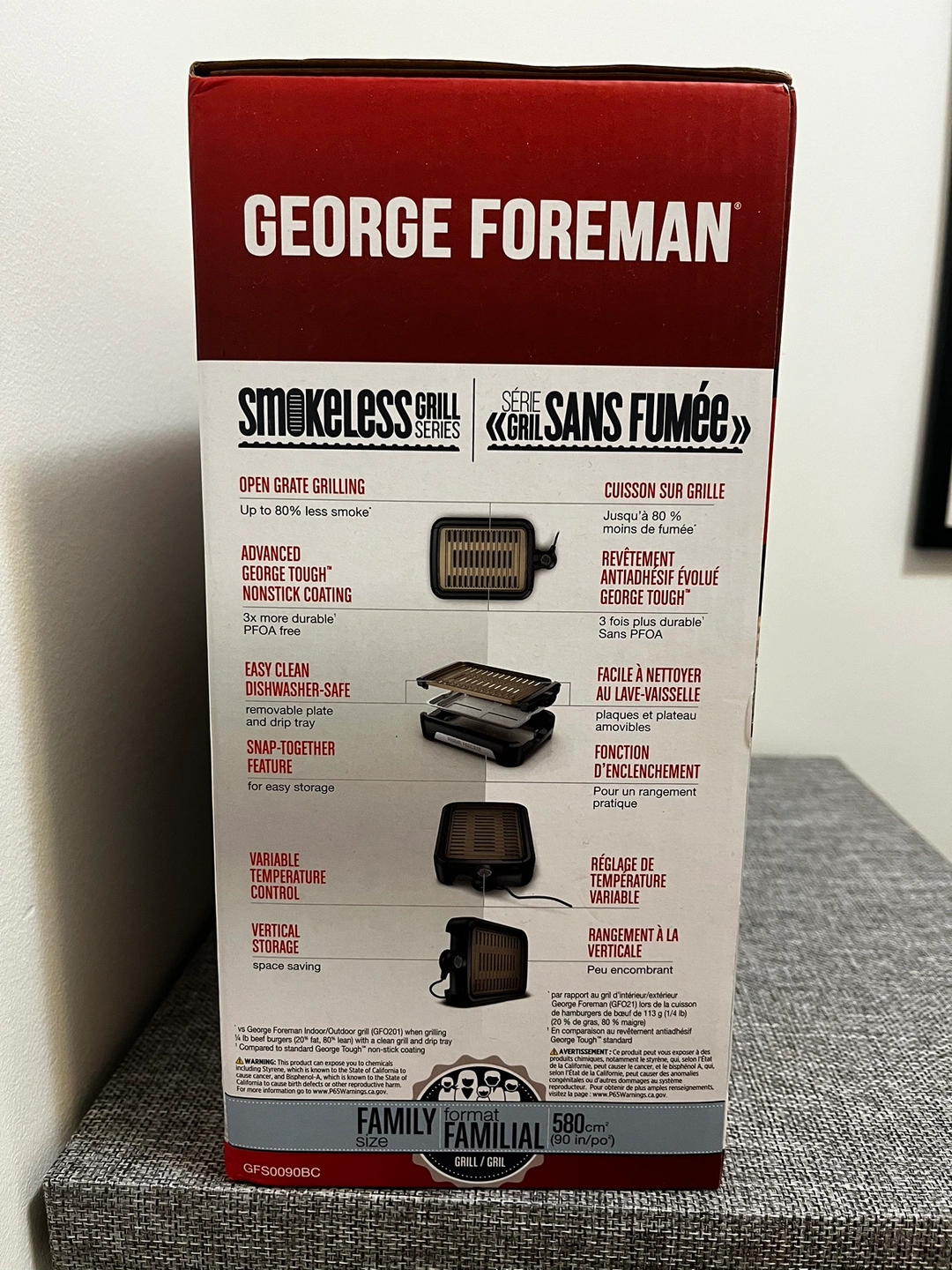 NEVER USED! This is a George Foreman Family Size Smokeless Grill. It has a removable drip tray, a temperature control knob and comes in black. It is in new condition, in the original box. - 90 Square inch open grate grilling - Up to 80% less smoke. The open grate design allows grease to drain onto the drip tray, cooling it down before it can burn and produce smoke - Easy to Clean - The grill plate and drip tray are removable and dishwasher-safe for simplified cleanup -Advanced George tough nonstick coating - There’s a lot to love about this nonstick coating. It’s 3X more durable, free of PFOA, and easy to clean after every grilling session -Family size grill - The smokeless grill makes it easy to create quick weeknight meals the whole family will love. Juicy burgers, grilled vegetables, sizzling steaks, and so much more fit easily on the 90 sq. in. cooking surface -Variable temperature controls - Set the dial at High, Medium, or Low for precise cooking and delicious results on a variety of grilled favourites. The grill heats up quickly and the temperature probe is removable for easy cleanup and storage -The grill plate, drip tray and body of the grill snap together feature makes vertical storage easy and saves space thanks to the reduced footprint