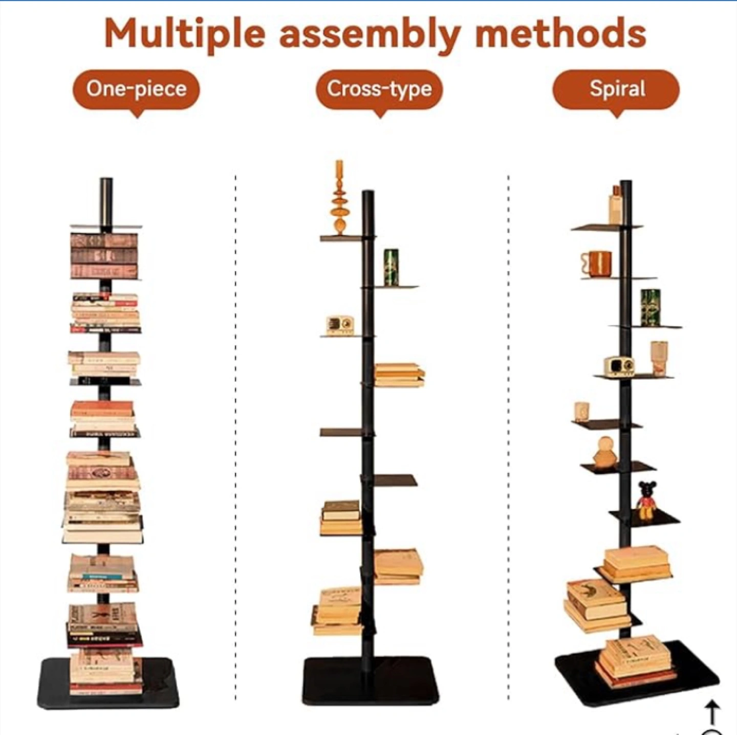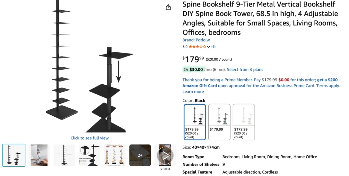 Selling a Pddolw 9-Tier Metal Vertical Bookshelf in black! It's a DIY spine book tower, standing at 68.5 inches tall. The bookshelf has 4 adjustable angles, making it suitable for small spaces, living rooms, offices, and bedrooms. The size is 40x40x174cm and it has 9 shelves. It features adjustable direction and is cordless. Originally priced at $179.99