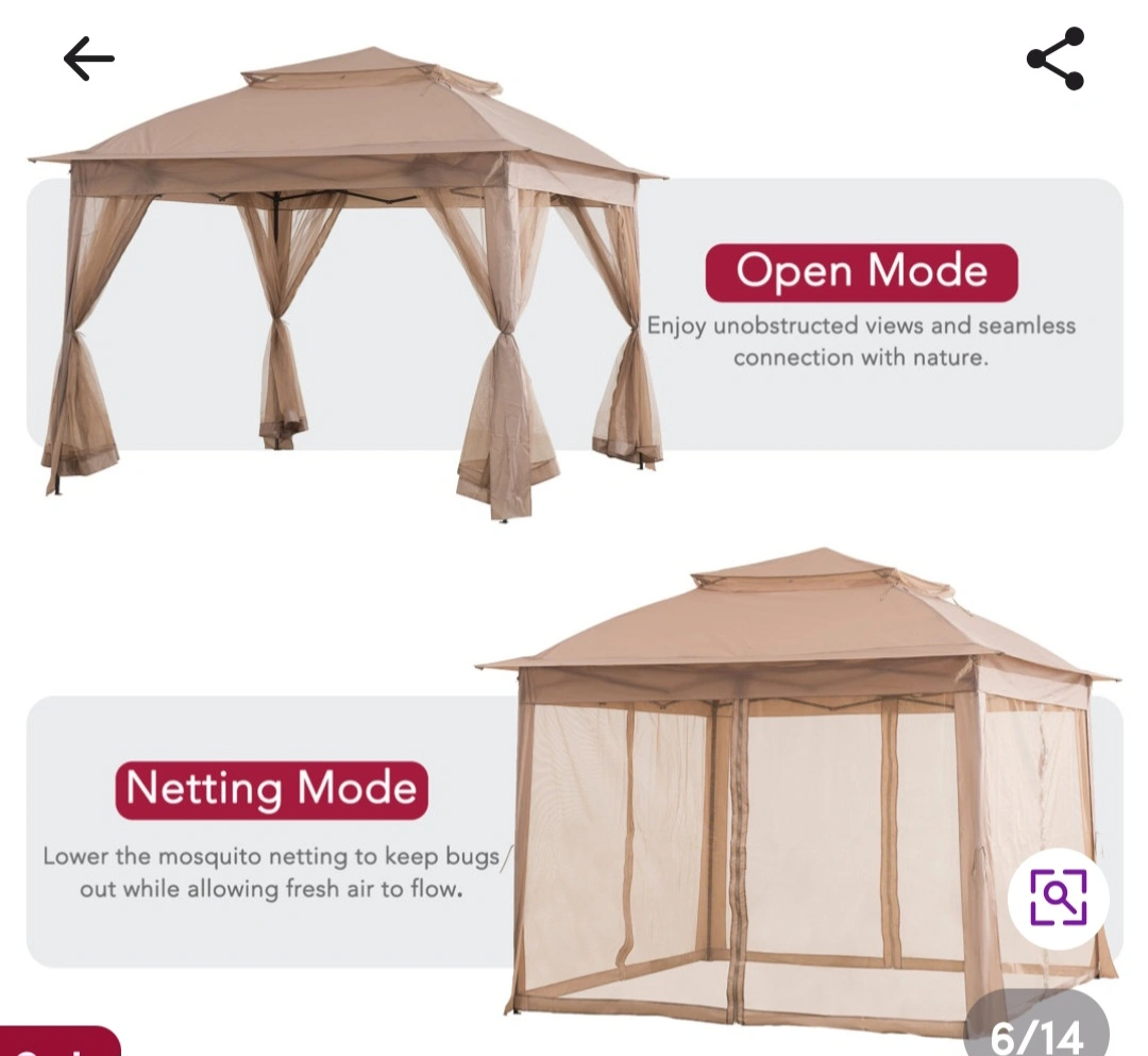 This gazebo features both netting and open modes. Enjoy unobstructed views and seamless connection with nature in open mode, or lower the mosquito netting to keep bugs out while allowing fresh air to flow ****New Never used.