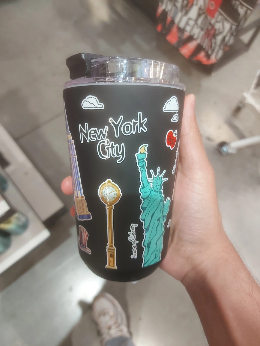 I'm selling a New York City travel mug! It's black and has stickers of New York City landmarks on it