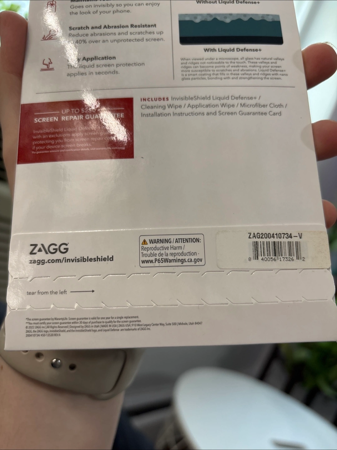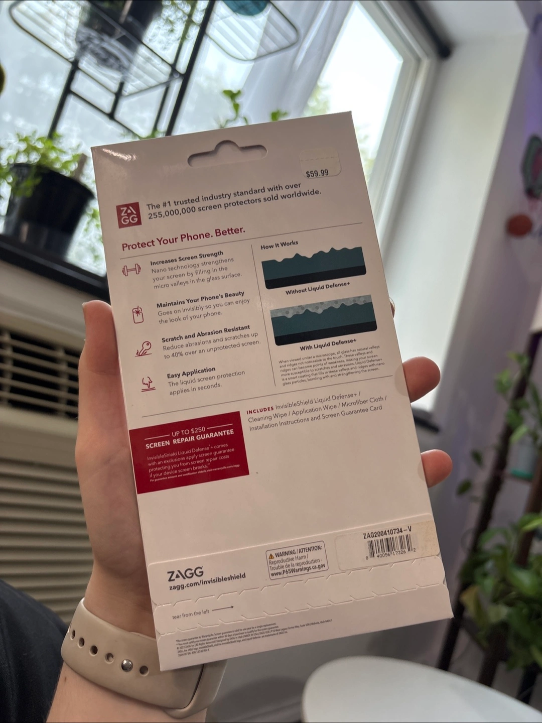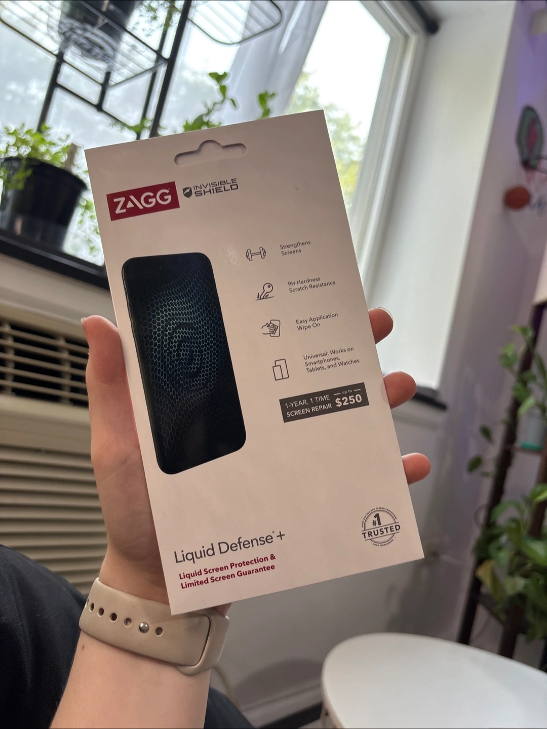 I'm selling a brand new (never opened) ZAGG InvisibleShield Liquid Defense+ screen protector! It increases screen strength and maintains your phone's beauty. It also has scratch and abrasion resistance. Includes InvisibleShield Liquid Defense+, cleaning wipe, application wipe/microfiber cloth, and installation instructions and screen guarantee card. Though I got it a while ago so any warranties might be void.