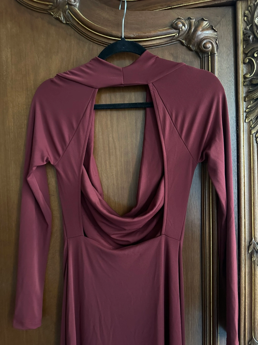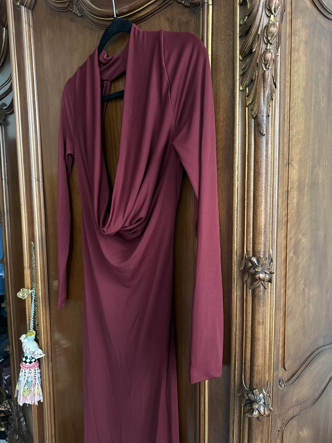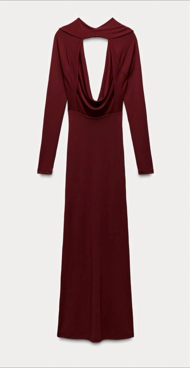 The Zara Burgundy Long Draped Open Back Dress in size Medium is a stylish and versatile piece suitable for various occasions. With its plunging neck and long sleeves, this dress exudes elegance and sophistication. The pullover closure and open back design add a touch of daring, making it perfect for a party, wedding, or even a casual outing. The rich burgundy color and maxi dress length make it a timeless and elegant choice for any season. Made by the popular brand Zara, you can trust that this dress is both high quality and fashionable.