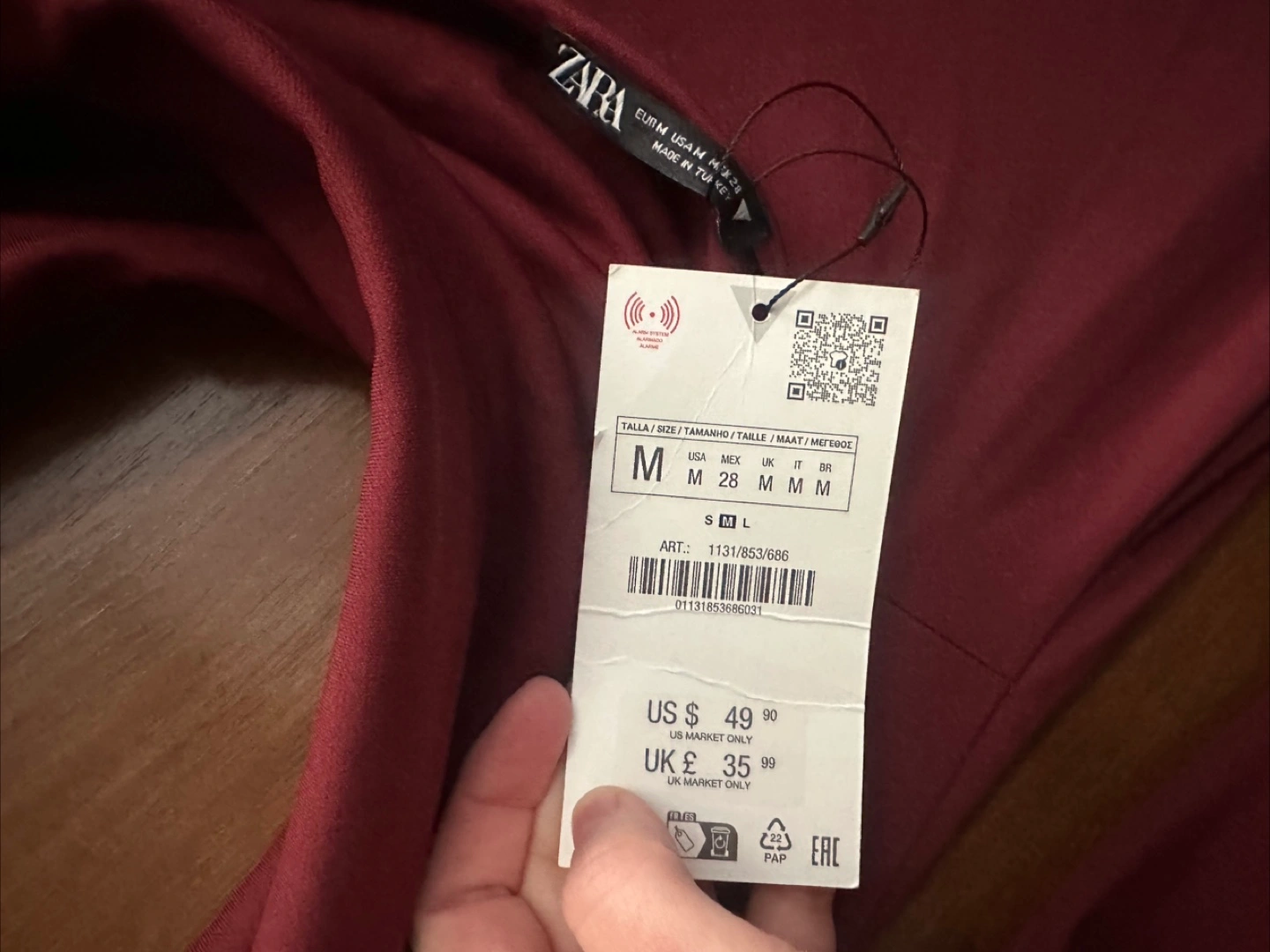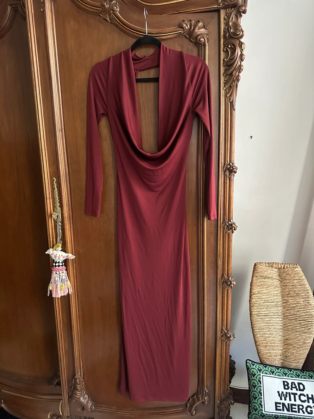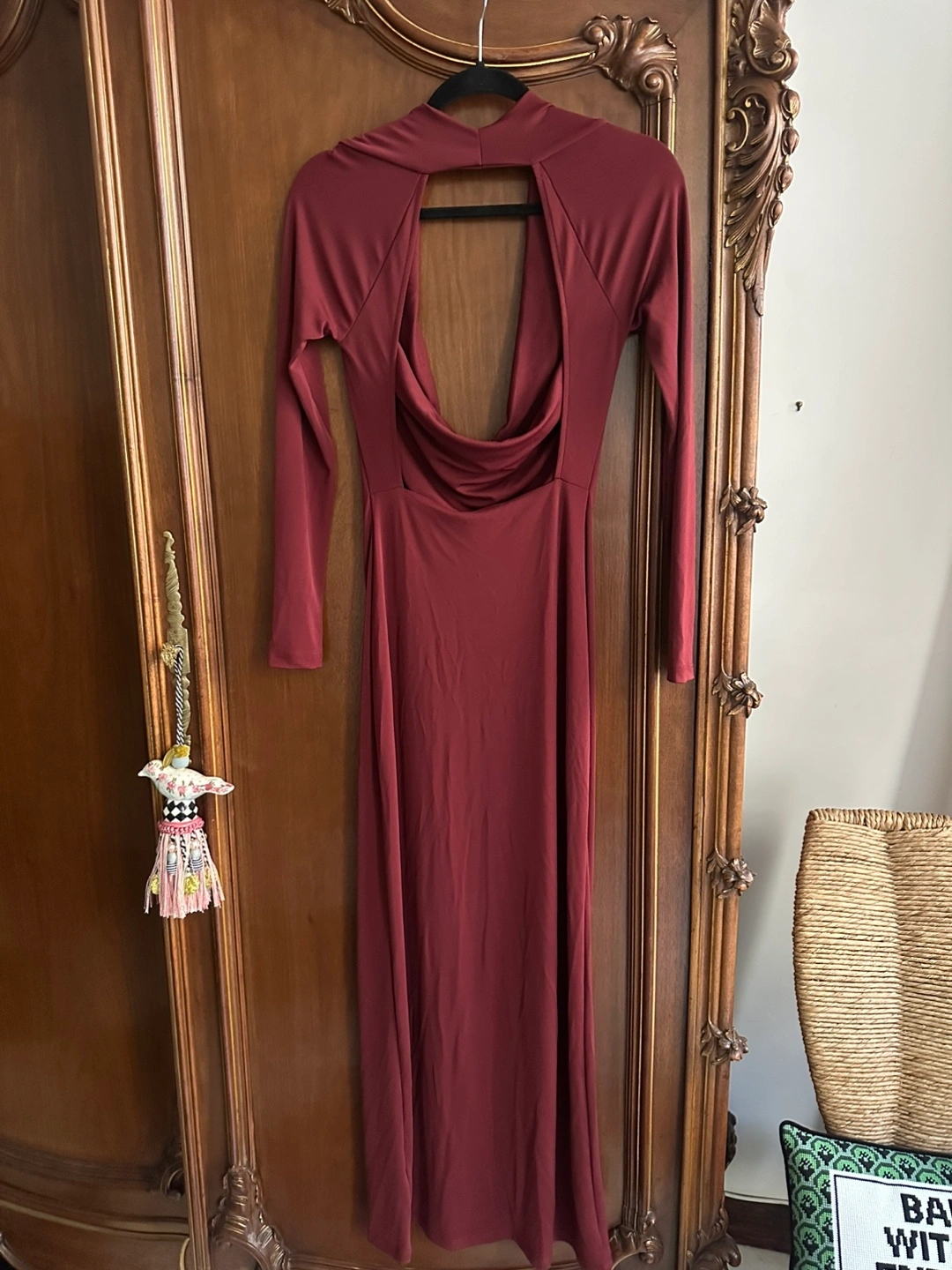 The Zara Burgundy Long Draped Open Back Dress in size Medium is a stylish and versatile piece suitable for various occasions. With its plunging neck and long sleeves, this dress exudes elegance and sophistication. The pullover closure and open back design add a touch of daring, making it perfect for a party, wedding, or even a casual outing. The rich burgundy color and maxi dress length make it a timeless and elegant choice for any season. Made by the popular brand Zara, you can trust that this dress is both high quality and fashionable.