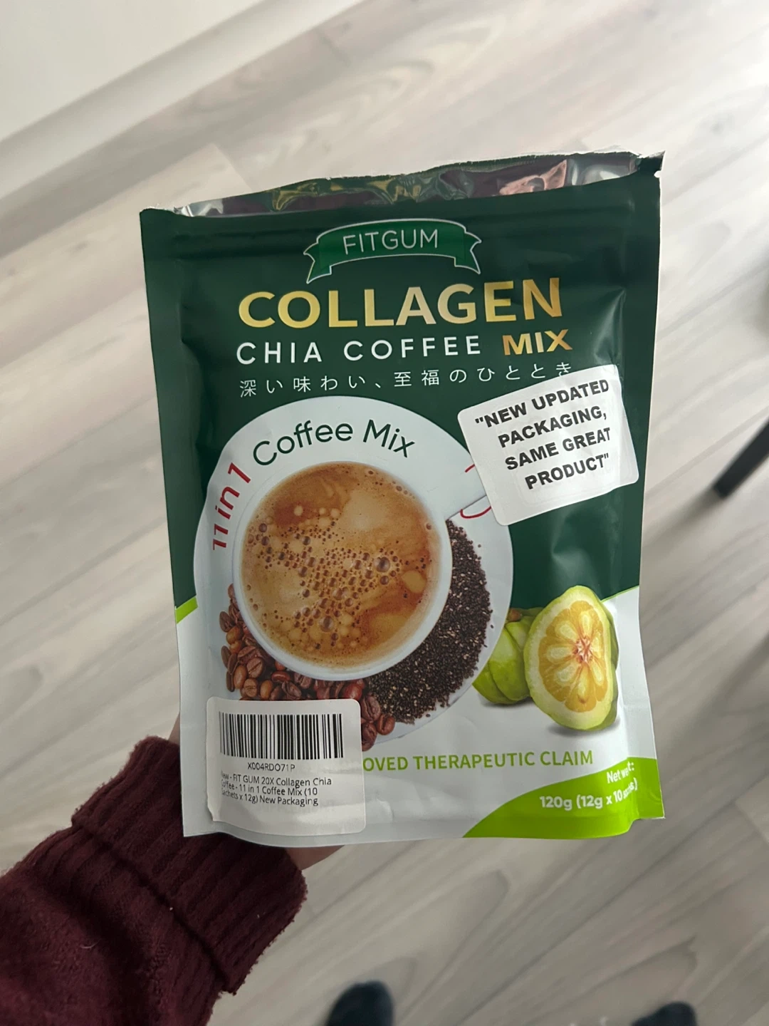 This is a Fitgum Collagen Chia Coffee Mix. It's a 11-in-1 coffee mix. Contains 9 sachets, each weighing 12g. I tried one, but prefer a different brand. All other 9 are unopened. This retails for like $25. FCFS ONLY