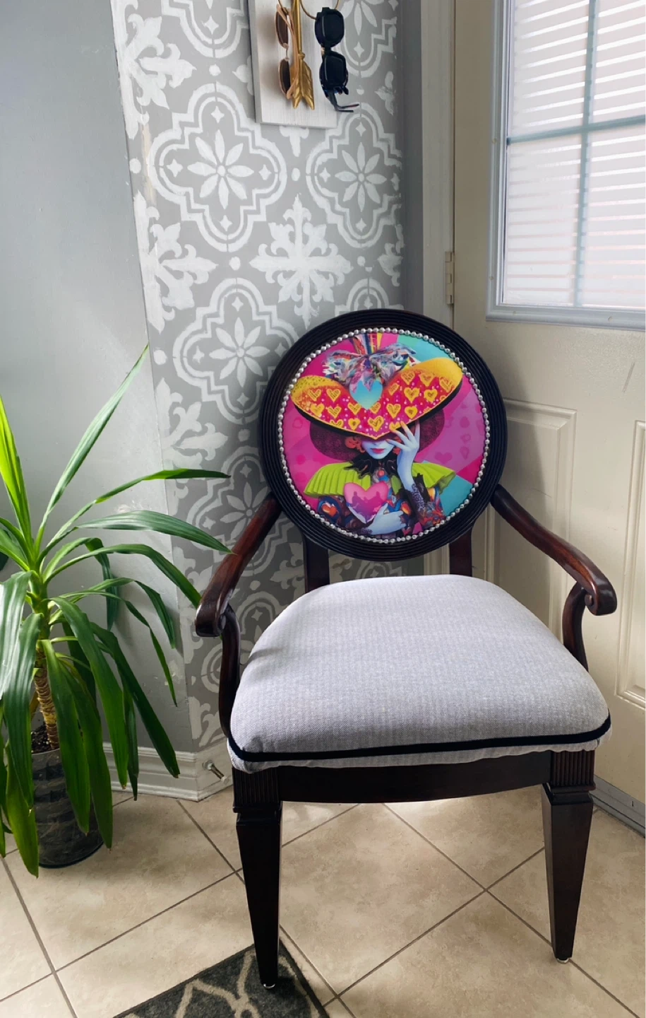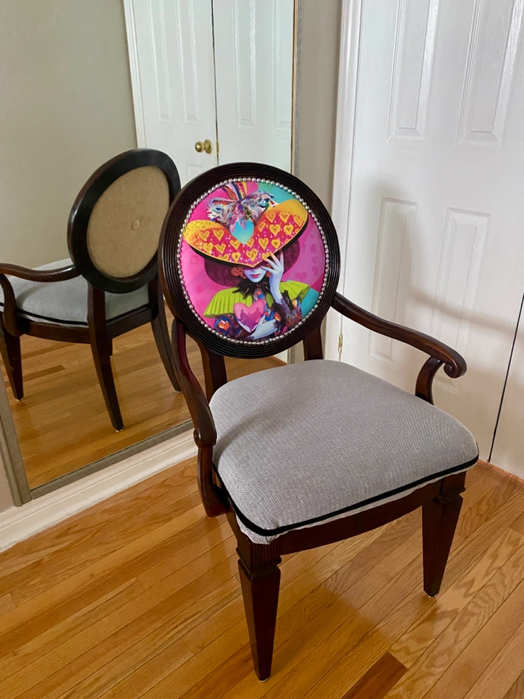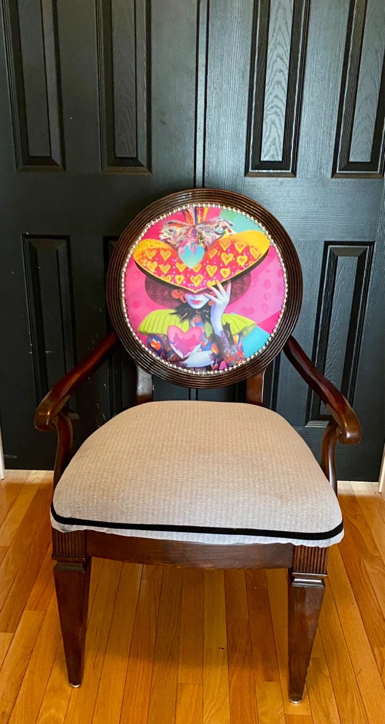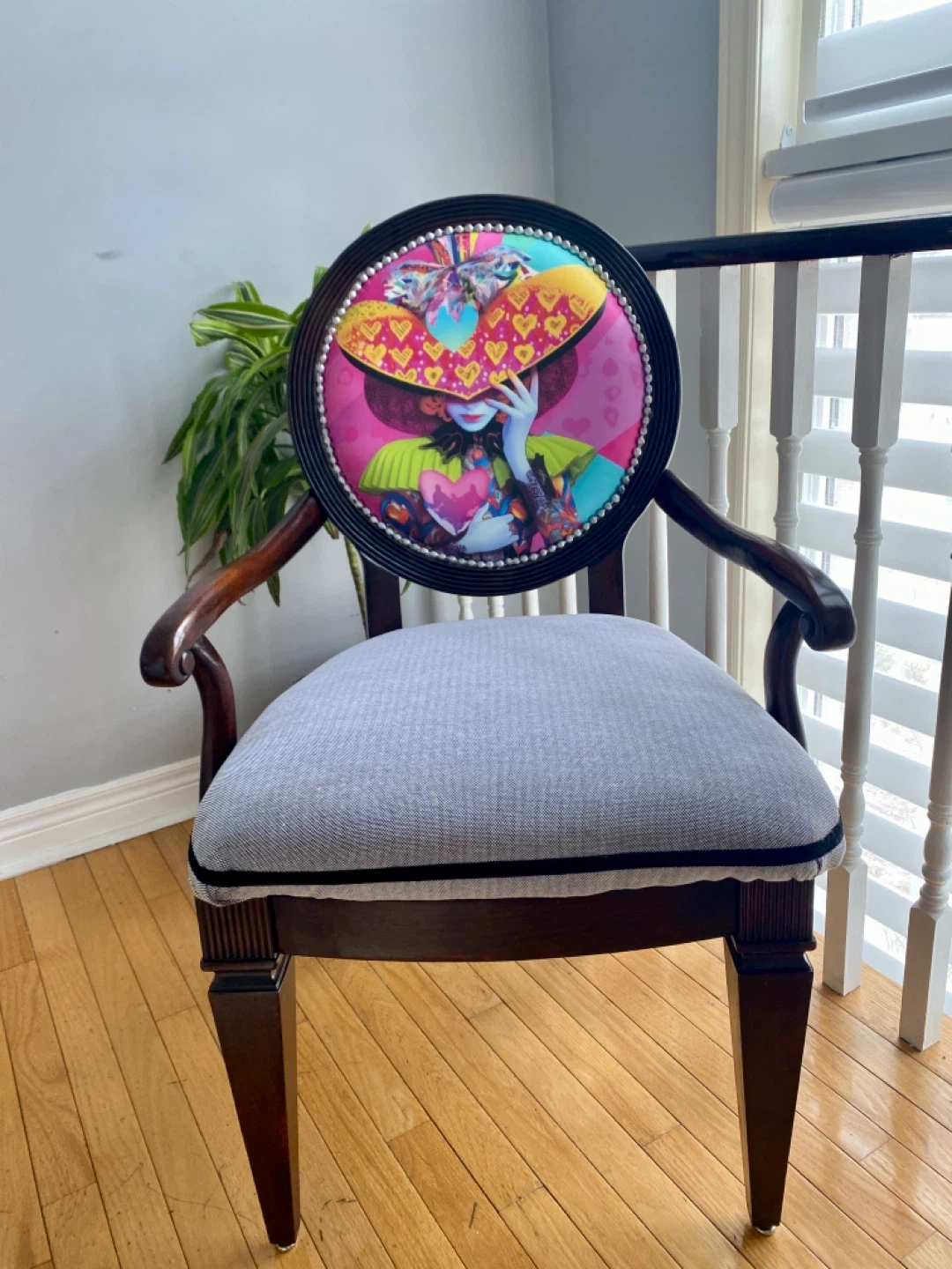 This armchair features a striking circular backrest with a vibrant, artistic depiction of a lady in a large hat, reminiscent of Art Nouveau styles. It's upholstered in a light grey fabric with contrasting black and white piping around the seat. The dark wood frame has classic, elegant curves. This unique chair adds a bold statement piece to any room! One of a kind chair