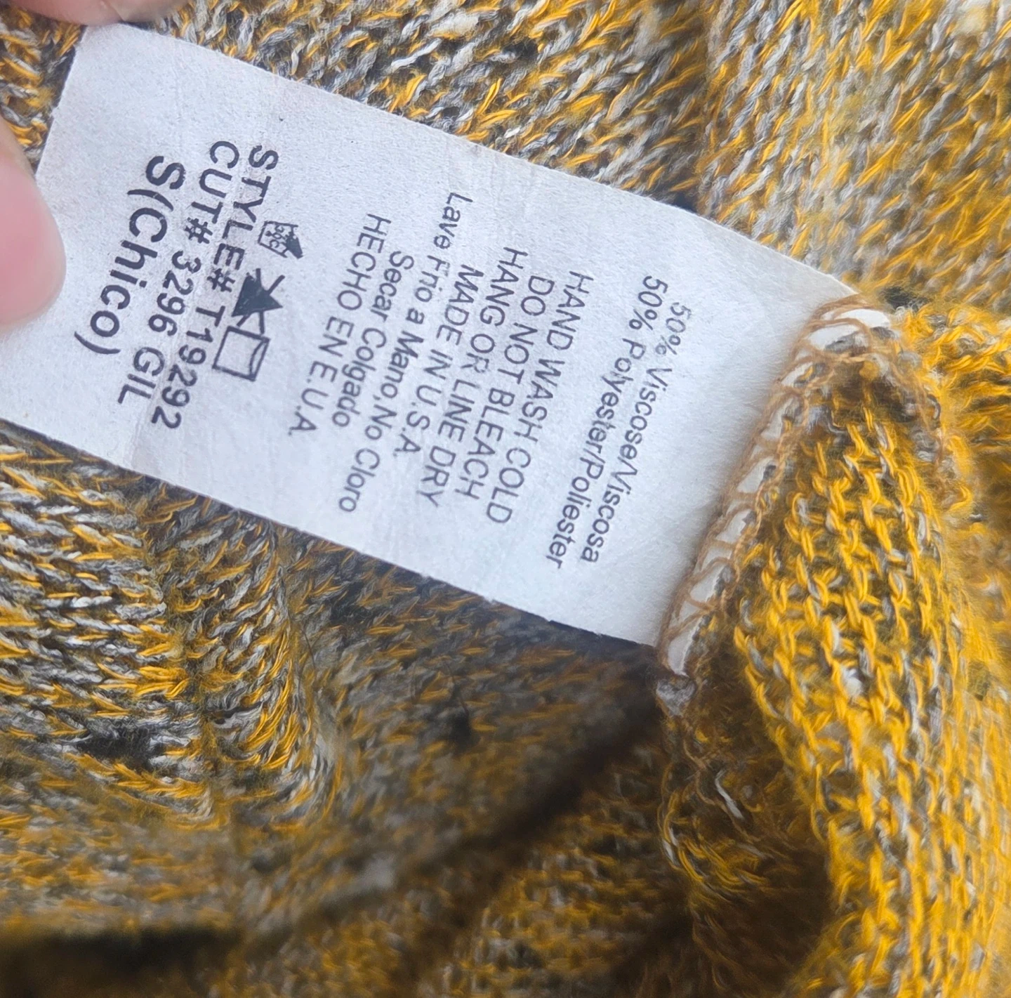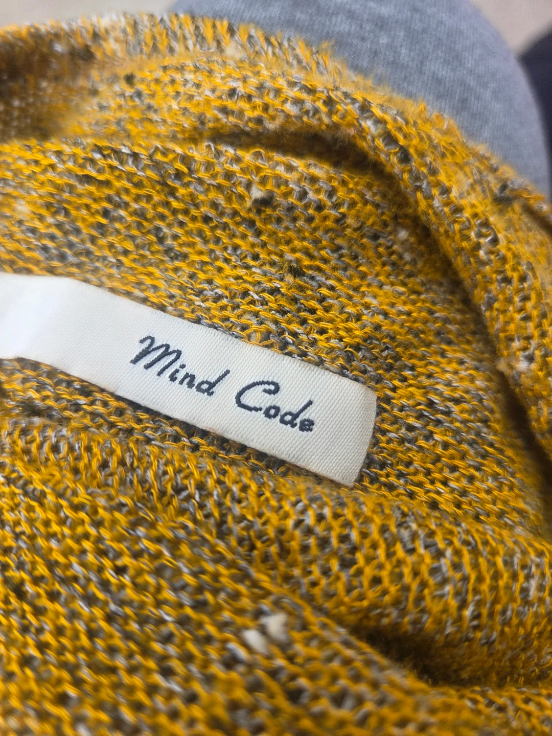 This is a Mind Code cropped sweater in yellow with a speckled knit pattern. It's made from 50% Viscose and 50% Polyester. Size is S (Chico).