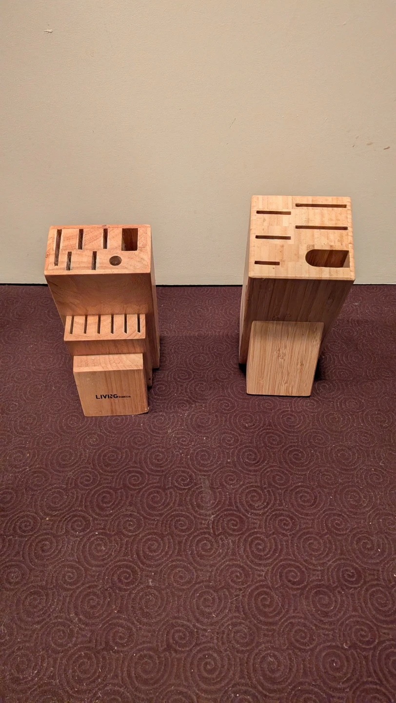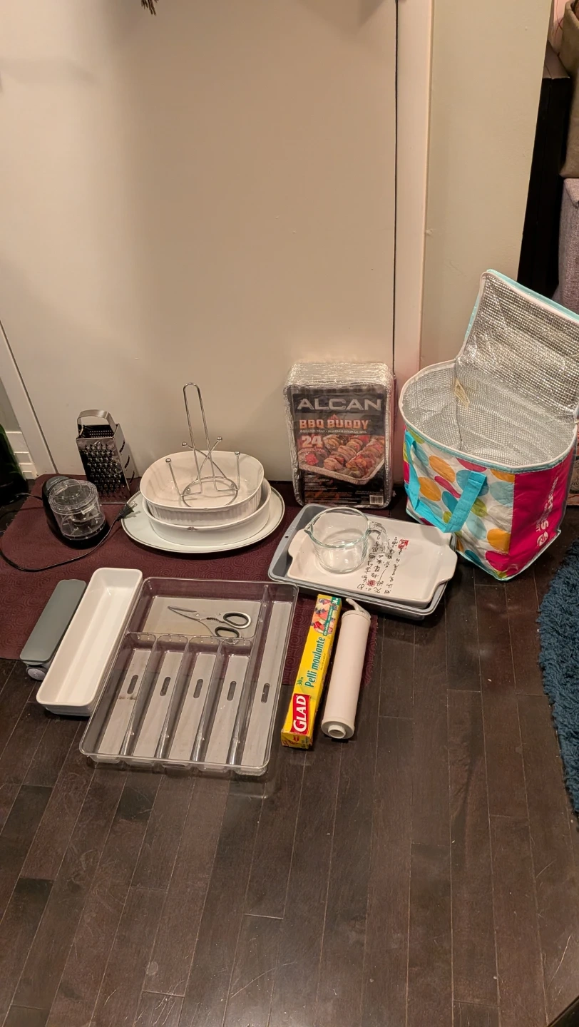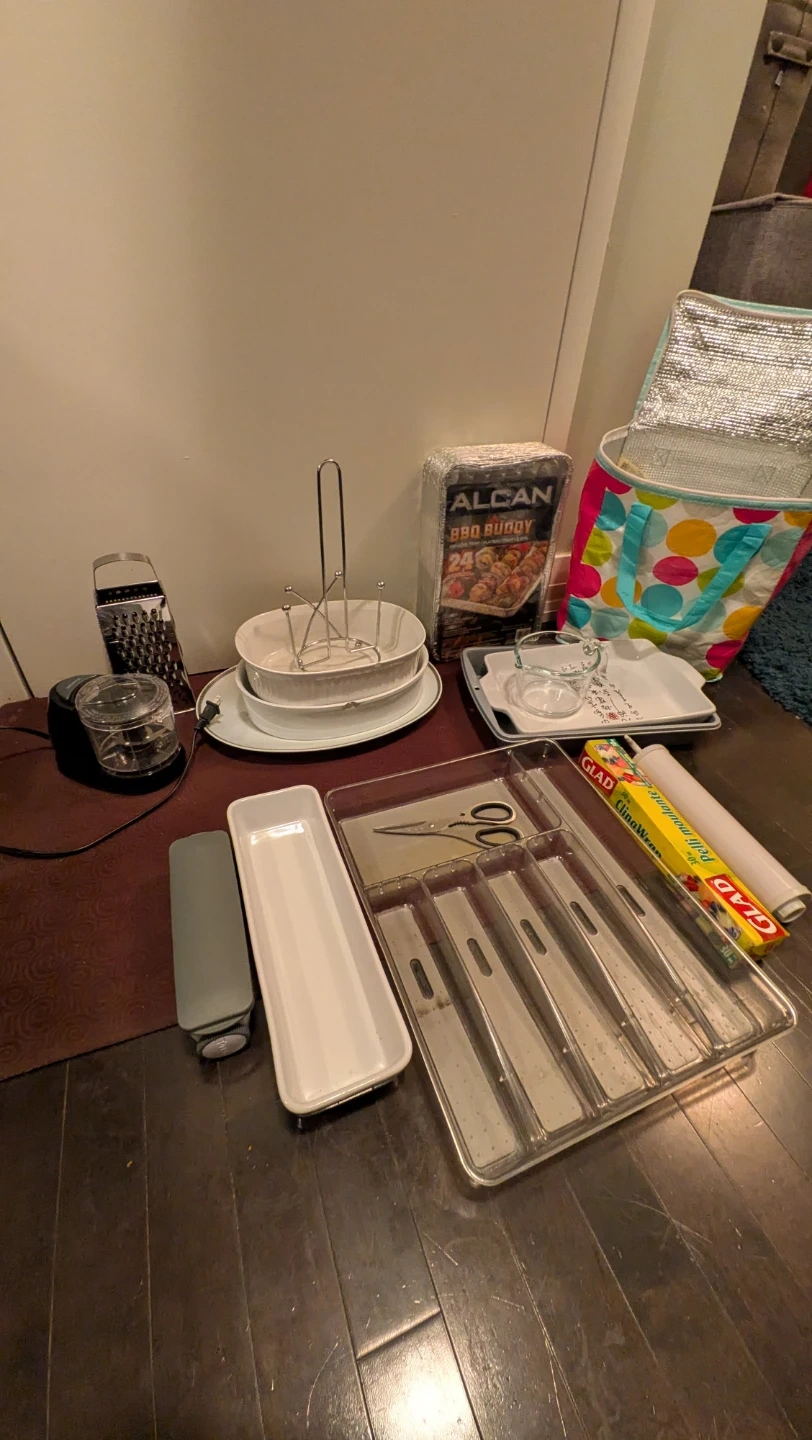 Platter, baking dishes, cutlery tray, veg shredder, knife block, knives, food travel bag, etc.