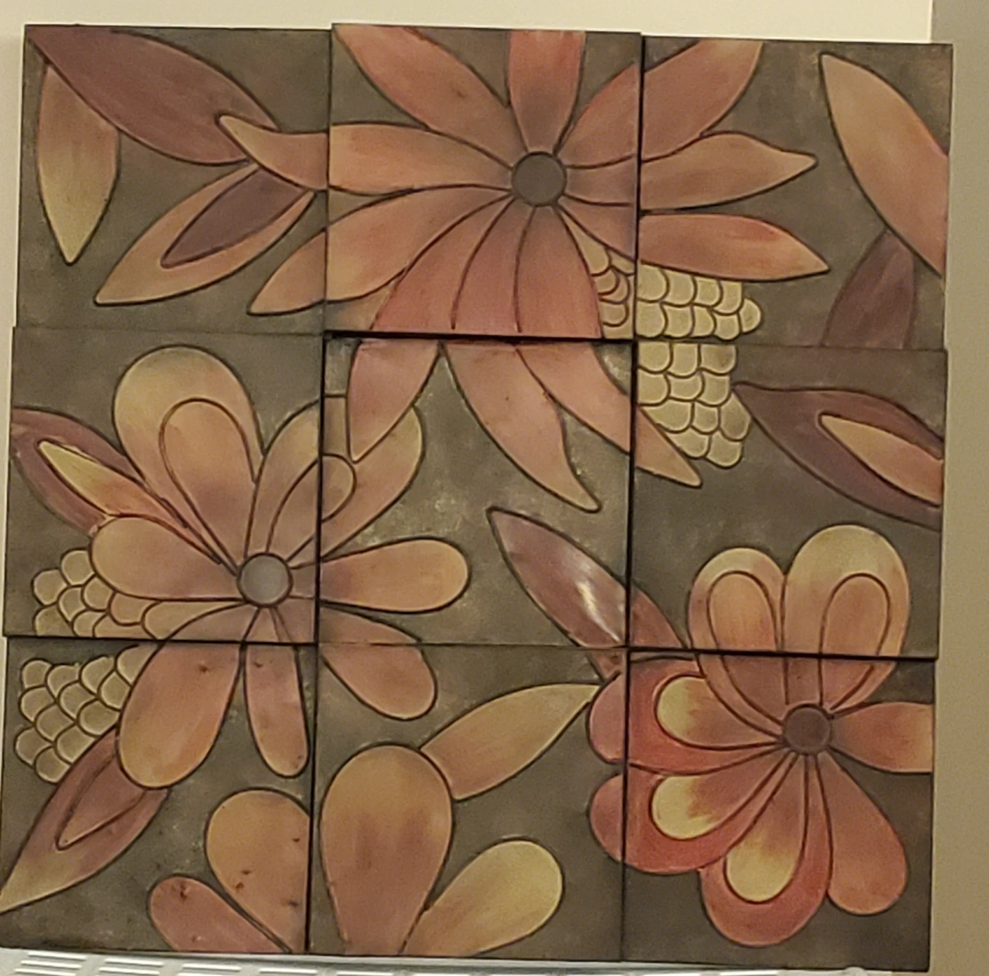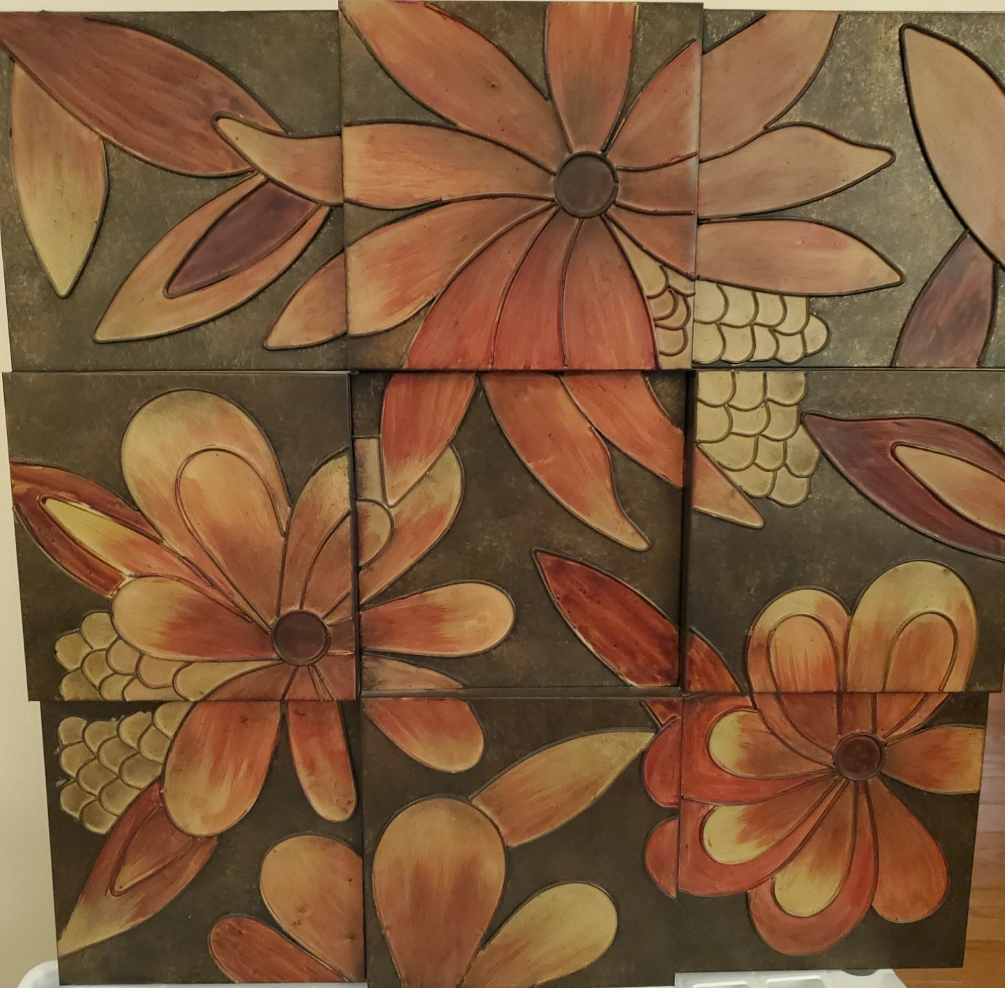 This is a unique piece of floral wall art made up of individual tiles. The design features a beautiful flower pattern in shades of red, black, green and, burnt orange. It would make a lovely addition to any room!