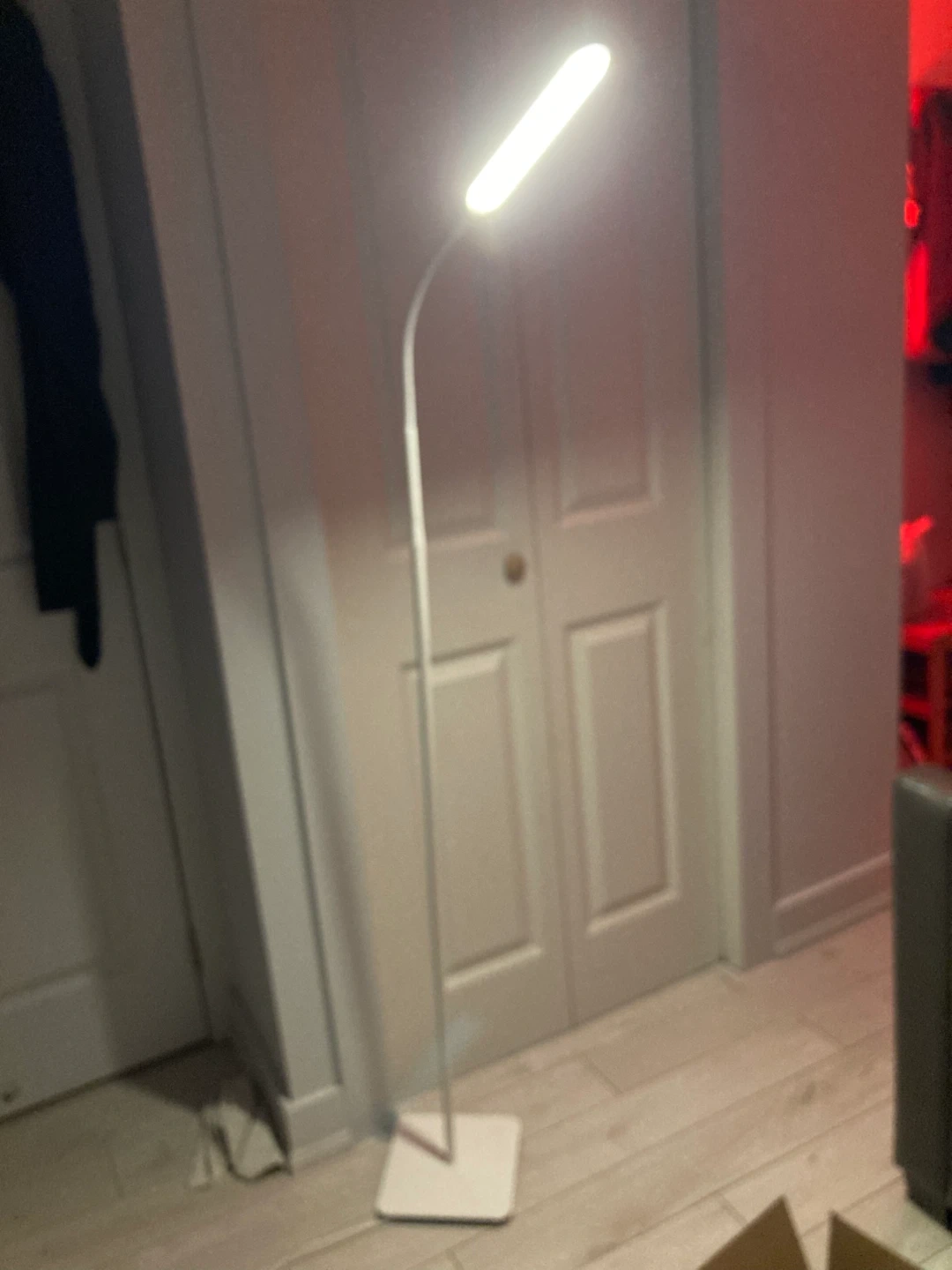 This is a sleek, modern floor LED lamp with an adjustable gooseneck. It's perfect for reading nooks or adding ambient light to any room.
