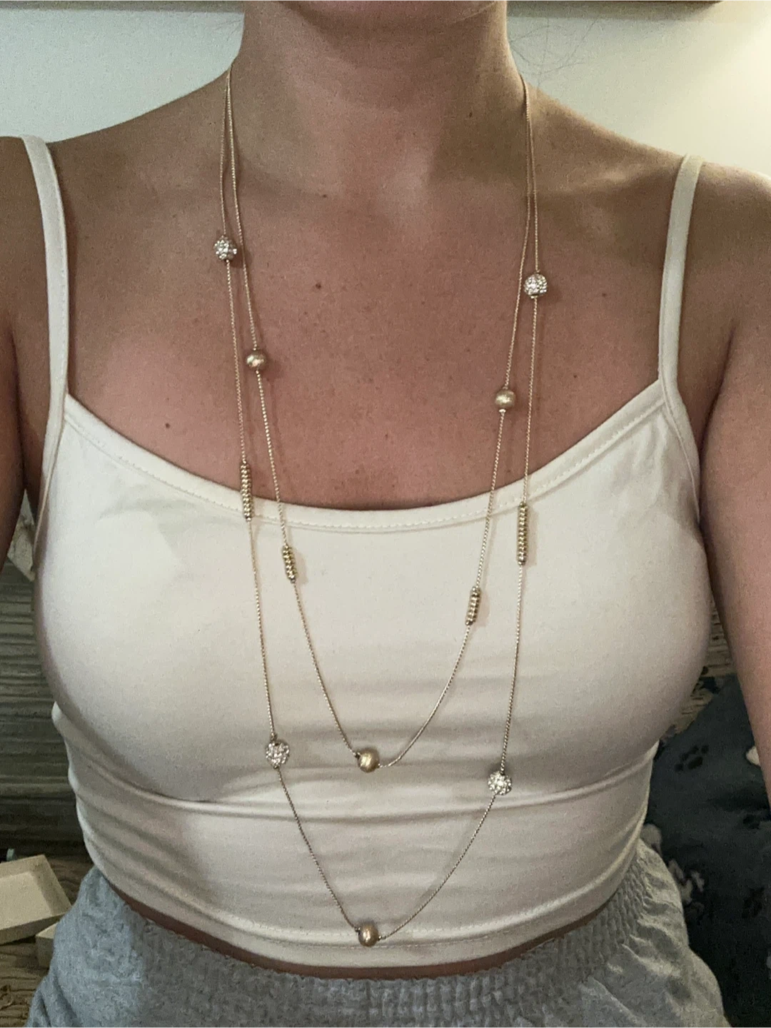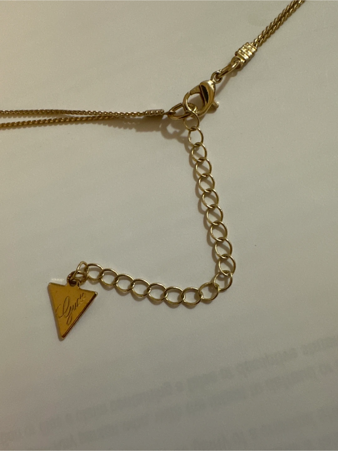 Selling a beautiful Guess gold-tone layered necklace! This necklace features a delicate chain with beads and a Guess logo charm. It's perfect for adding a touch of elegance to any outfit
