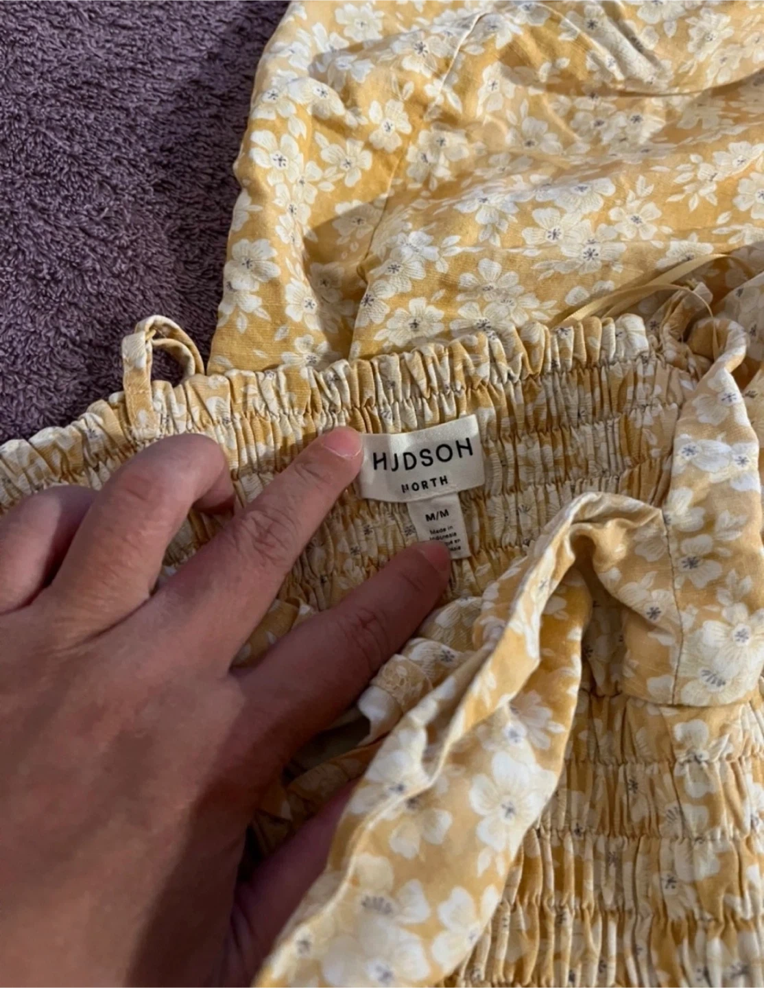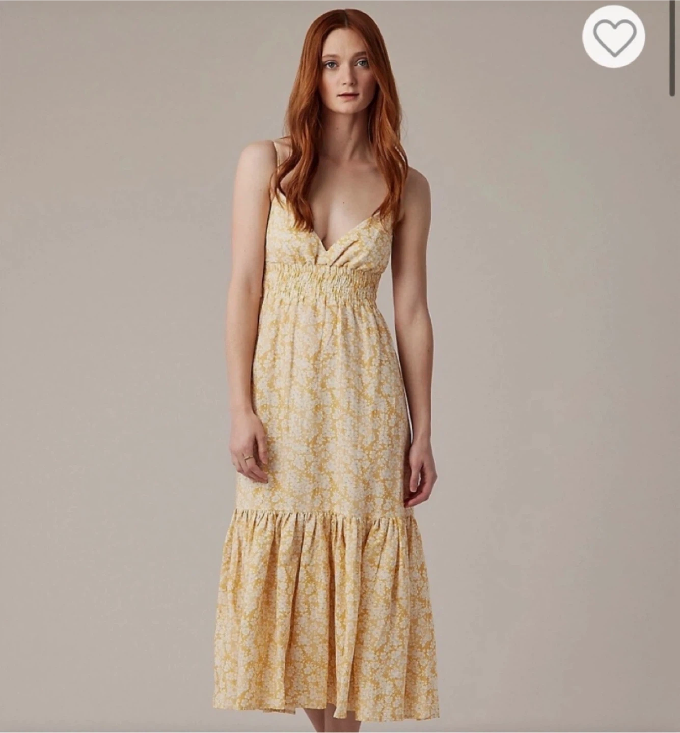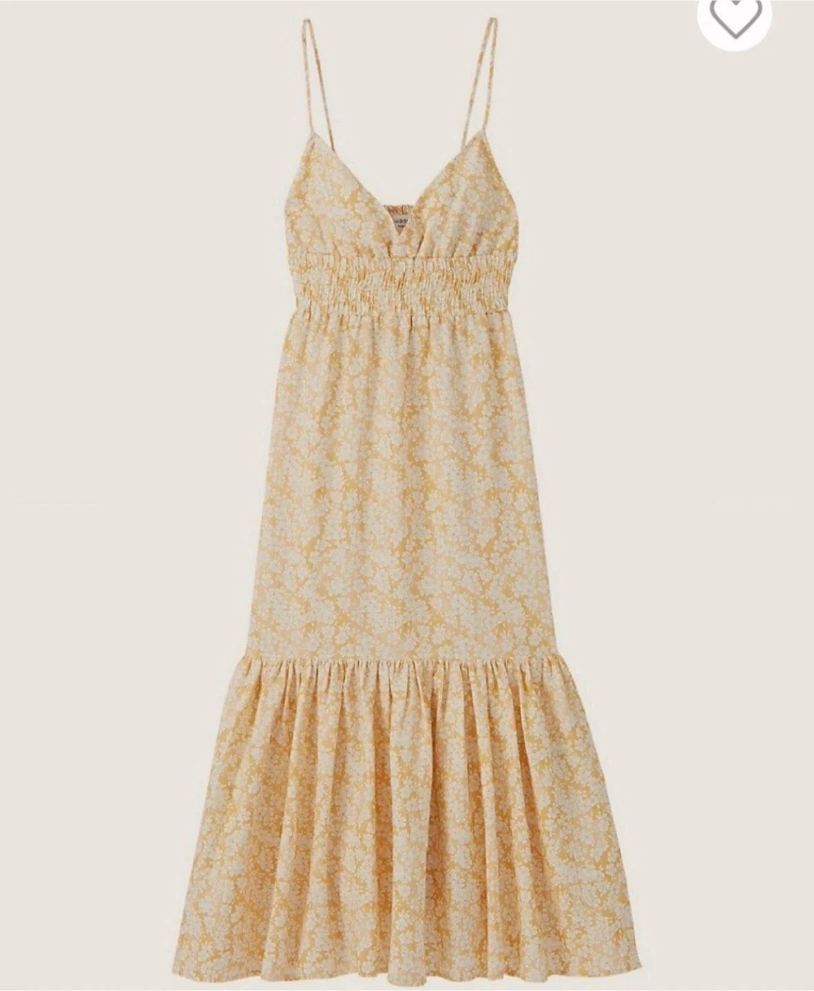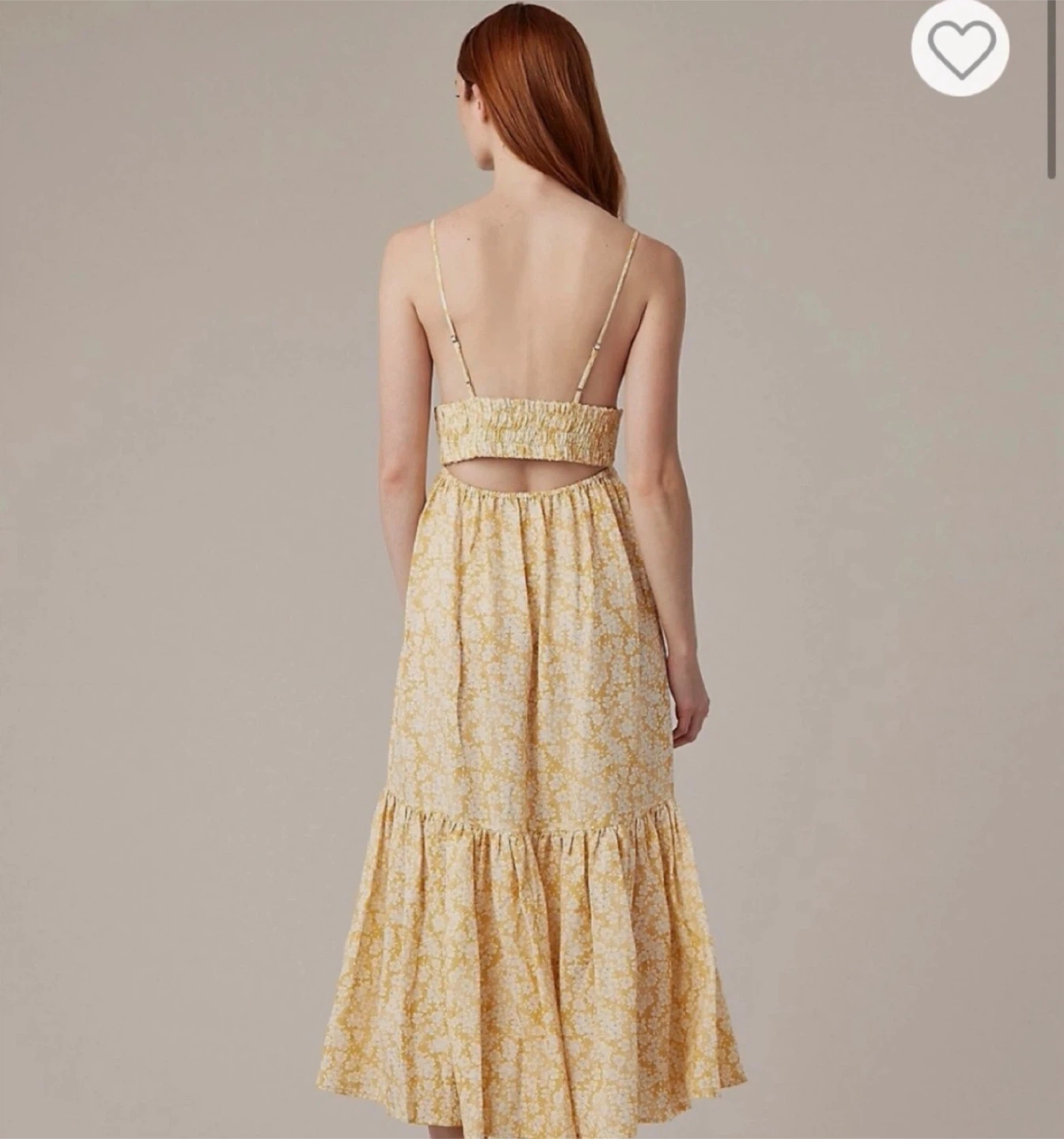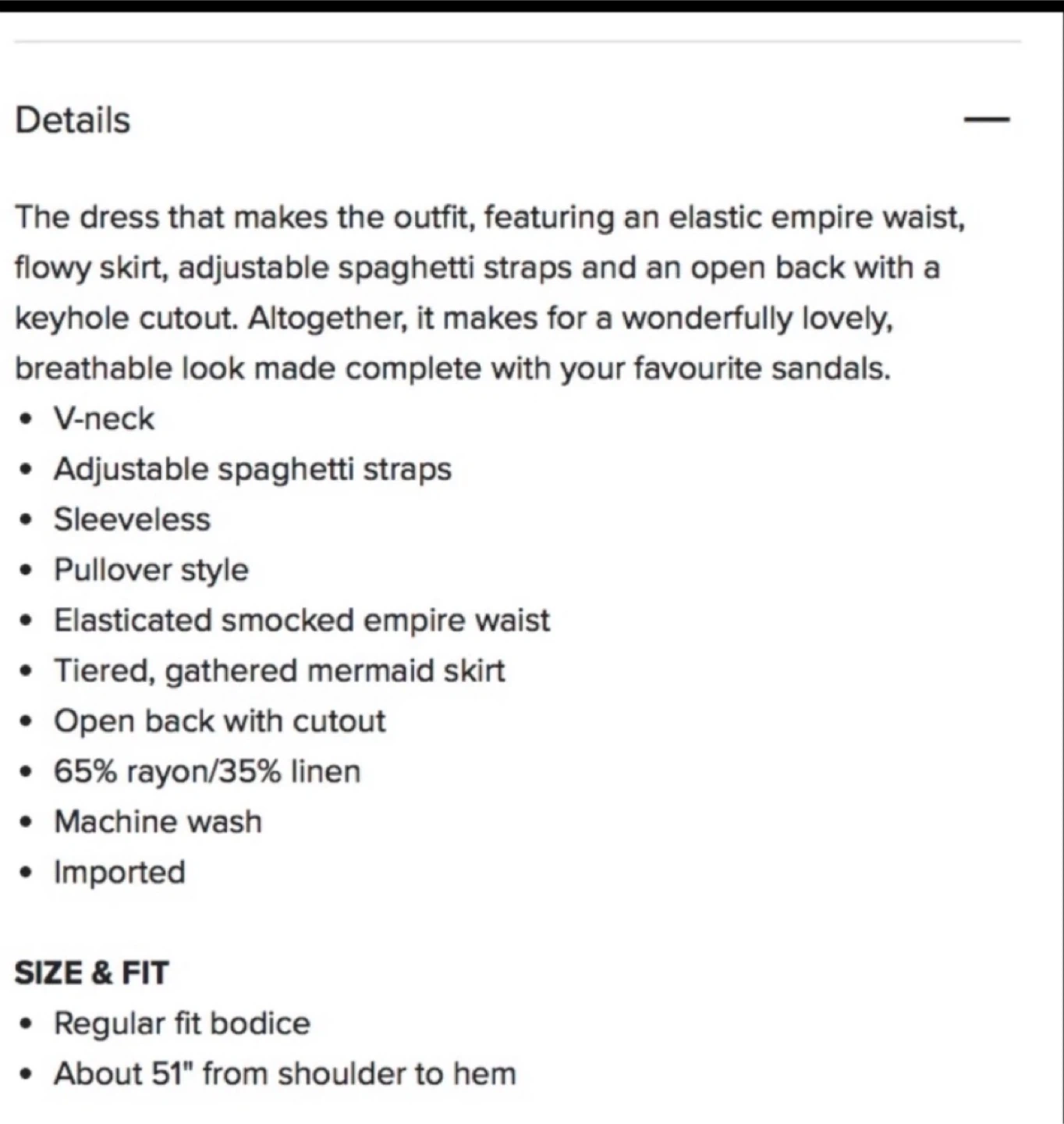 This dress features an elasticated smocked empire waist and a flowy tiered skirt. It has adjustable spaghetti straps and an open back with a cutout. Made of 65% rayon and 35% linen. Machine wash, imported. Too big for me.