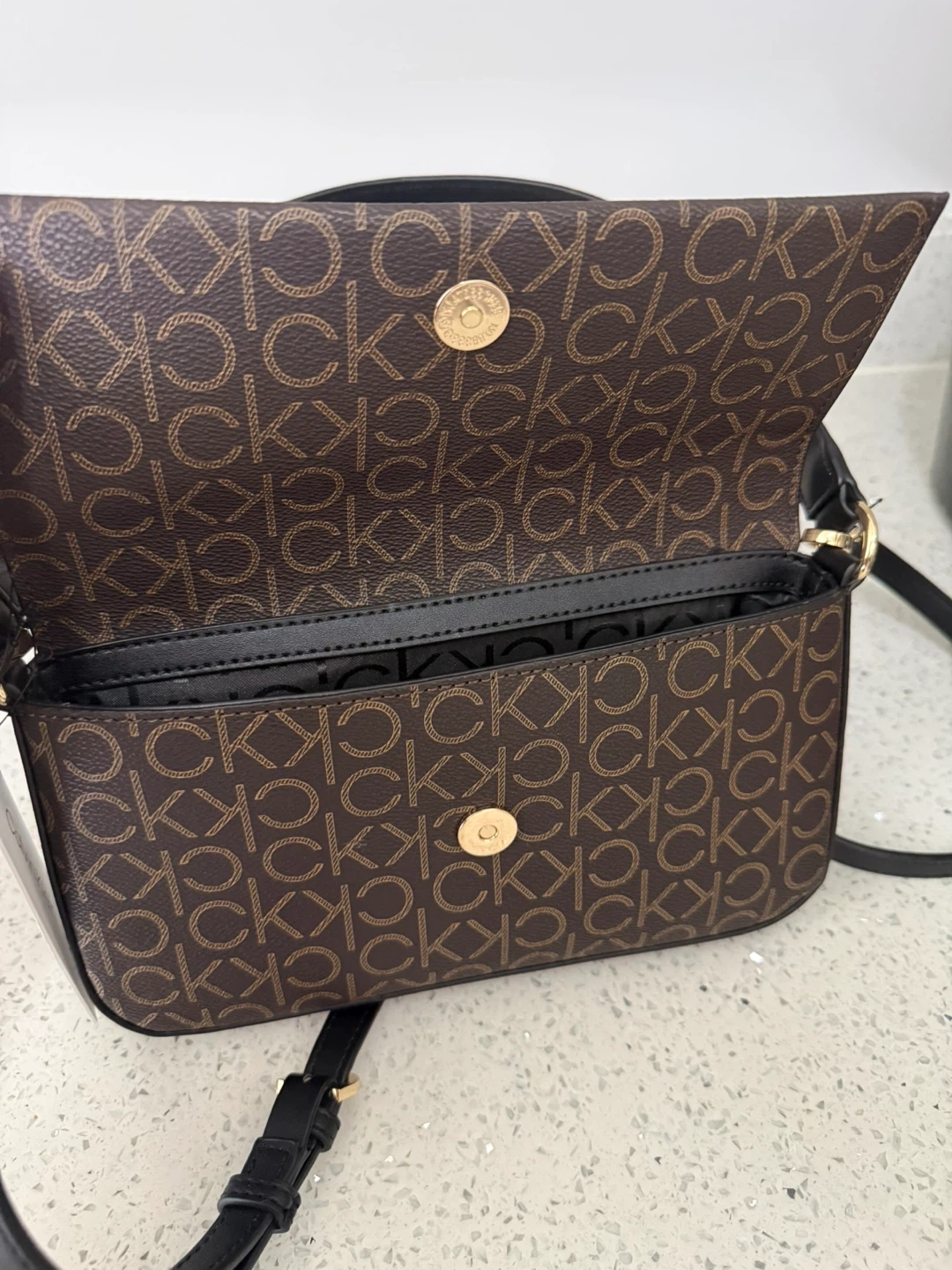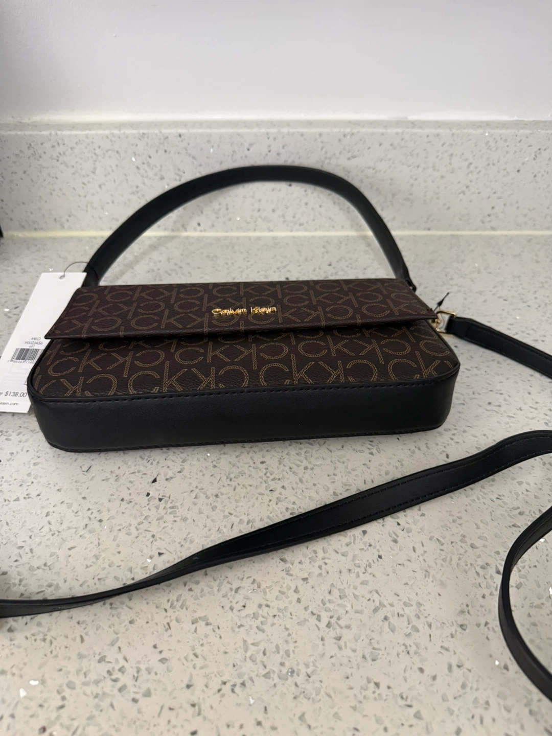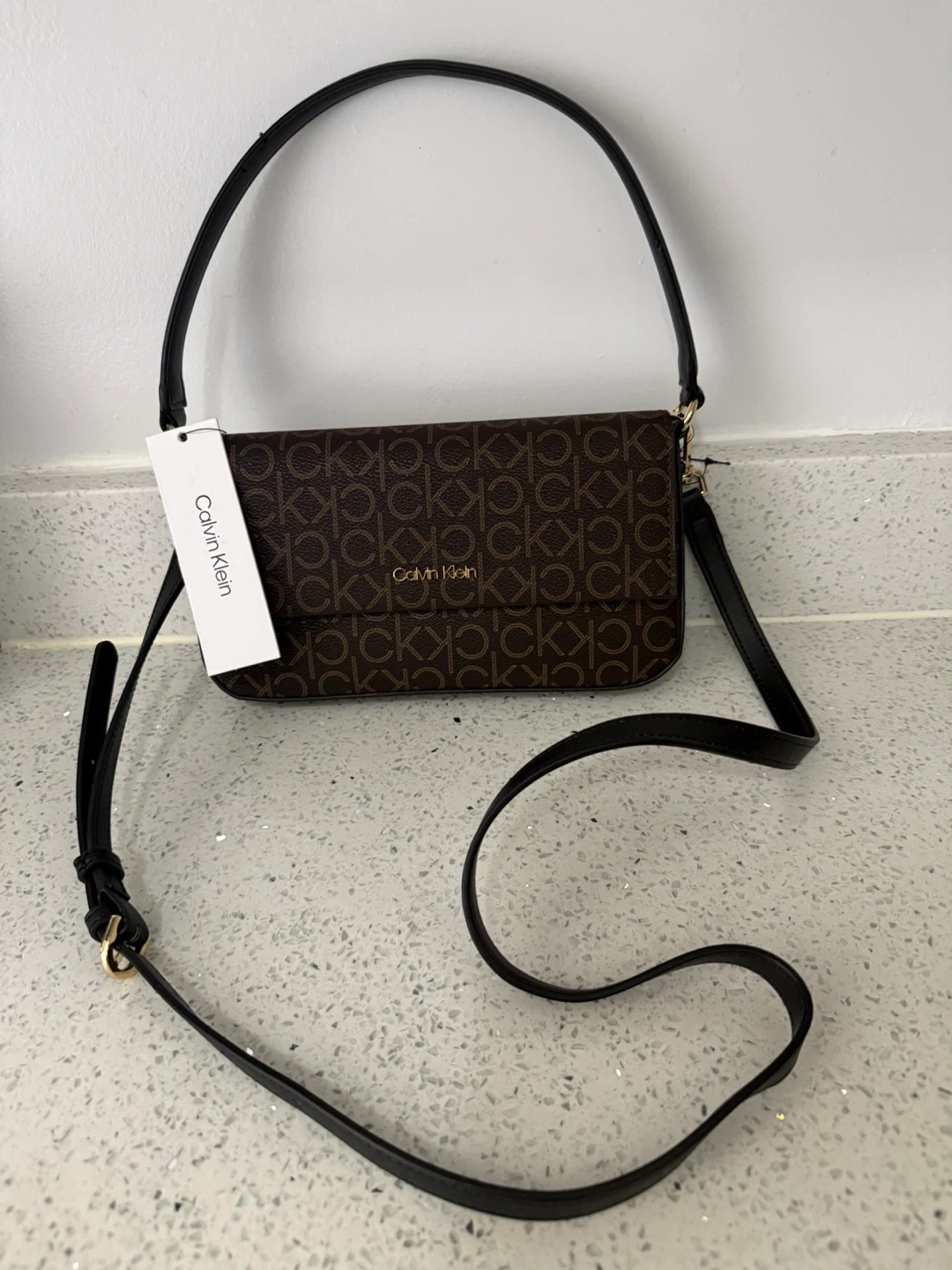This Calvin Klein shoulder bag features the signature monogram print. It has a black adjustable strap and gold hardware. The interior includes a main compartment and a smaller pocket.