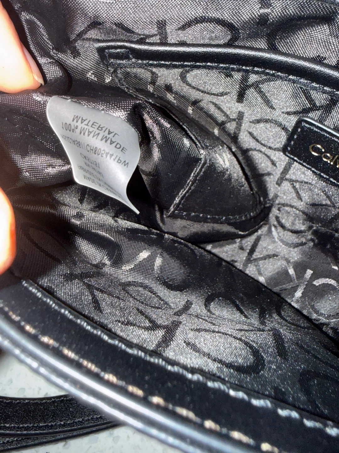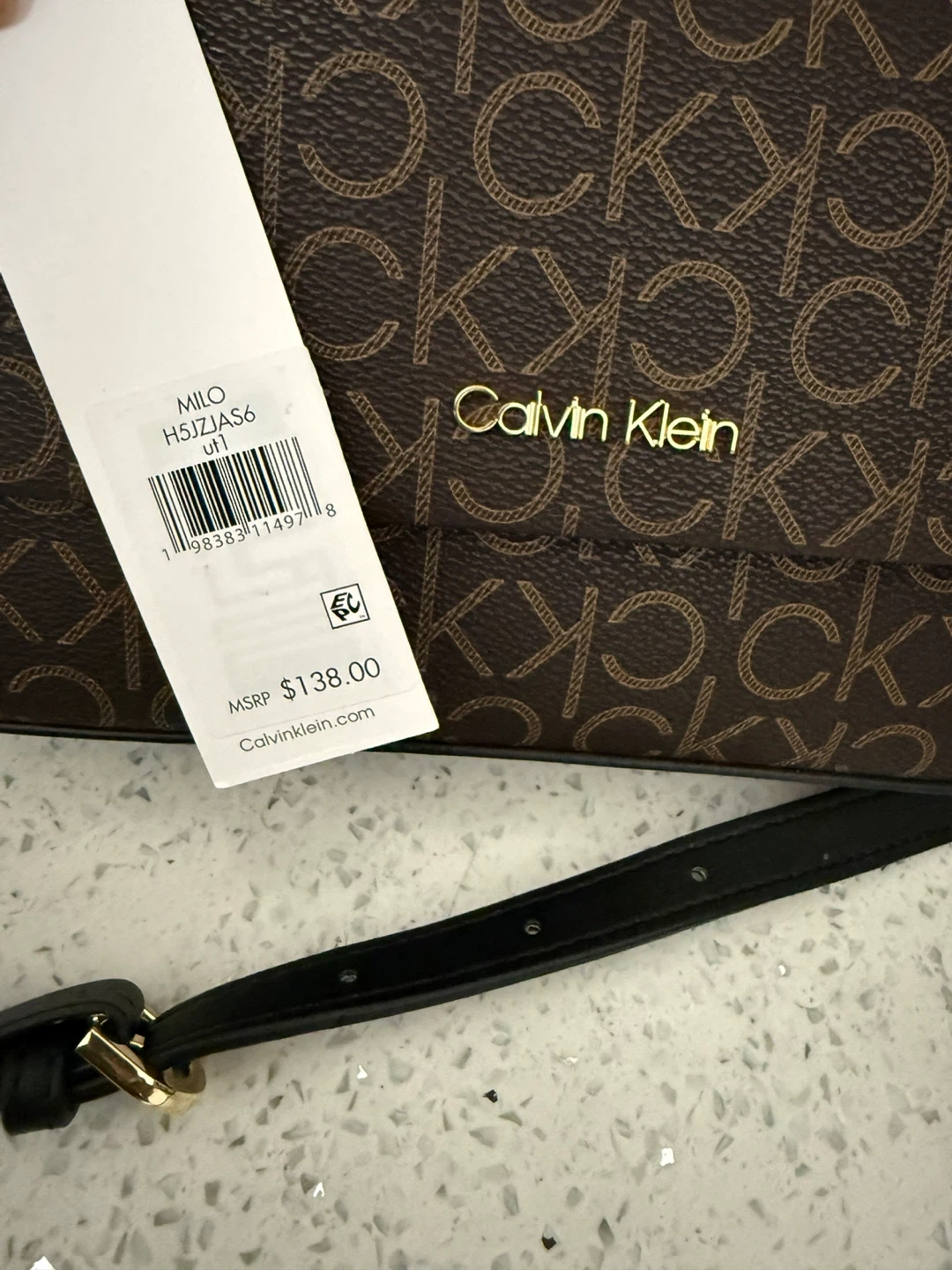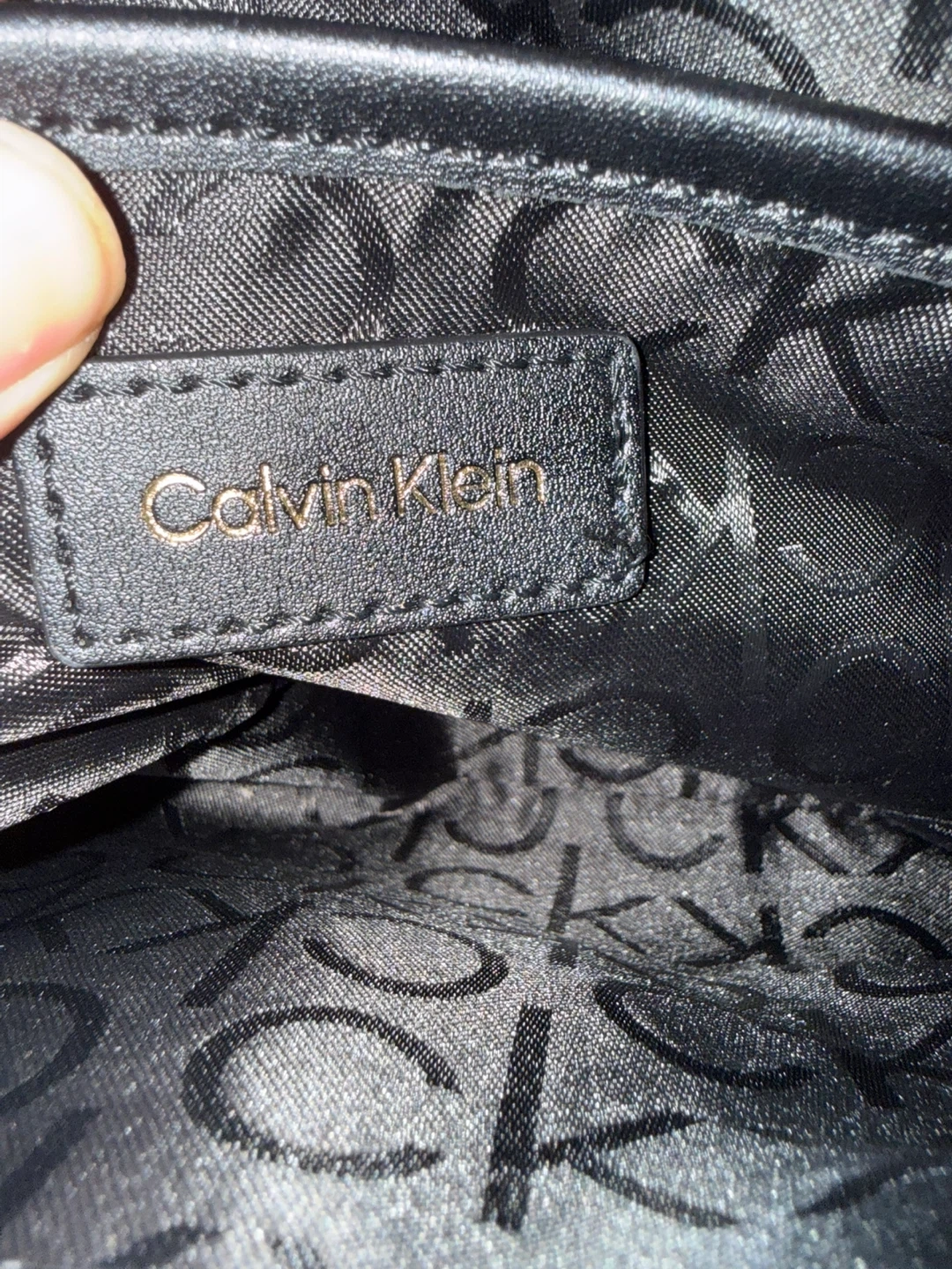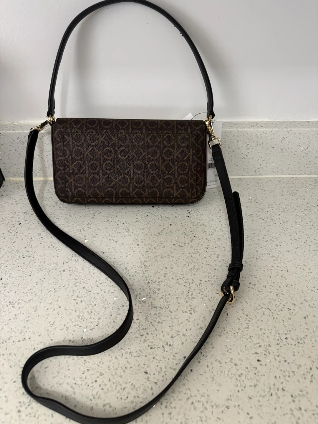 This Calvin Klein shoulder bag features the signature monogram print. It has a black adjustable strap and gold hardware. The interior includes a main compartment and a smaller pocket.