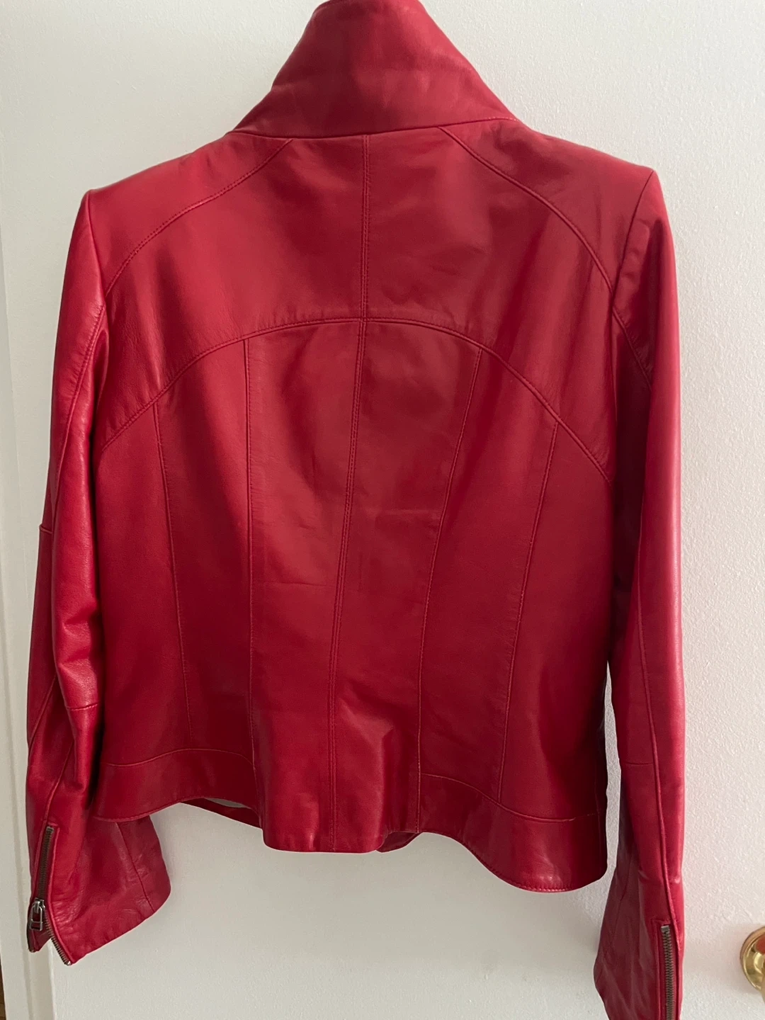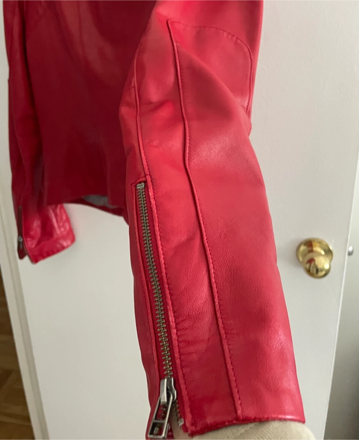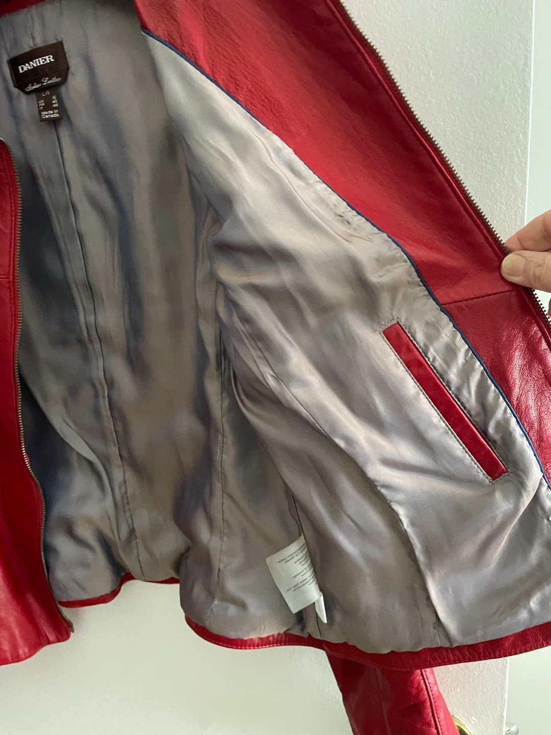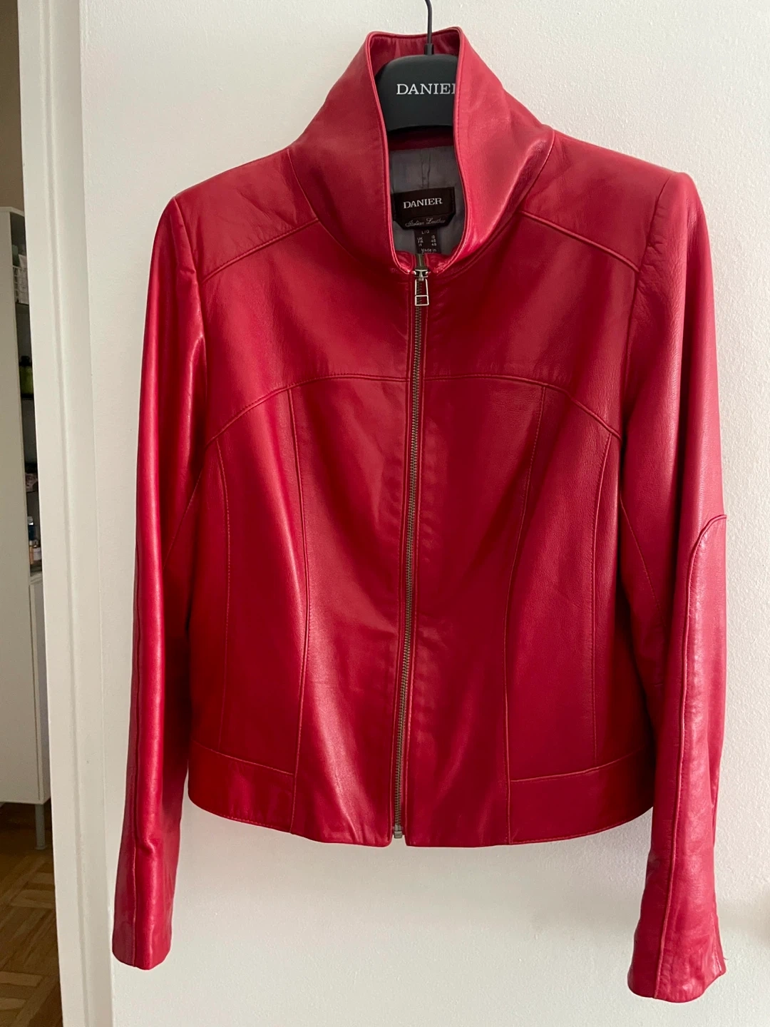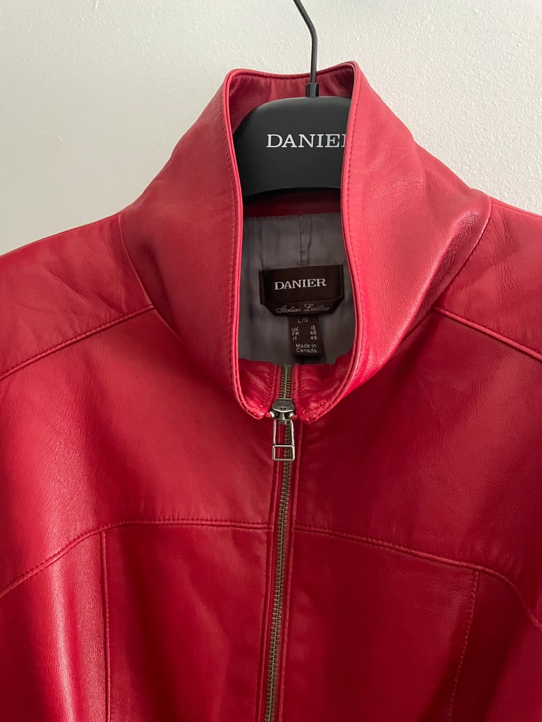 Stylish Danier red leather jacket, size L, fits M/L. Made with soft Italian leather. Features a full zip closure and zippered cuffs. Lined interior with one pocket. Great condition.