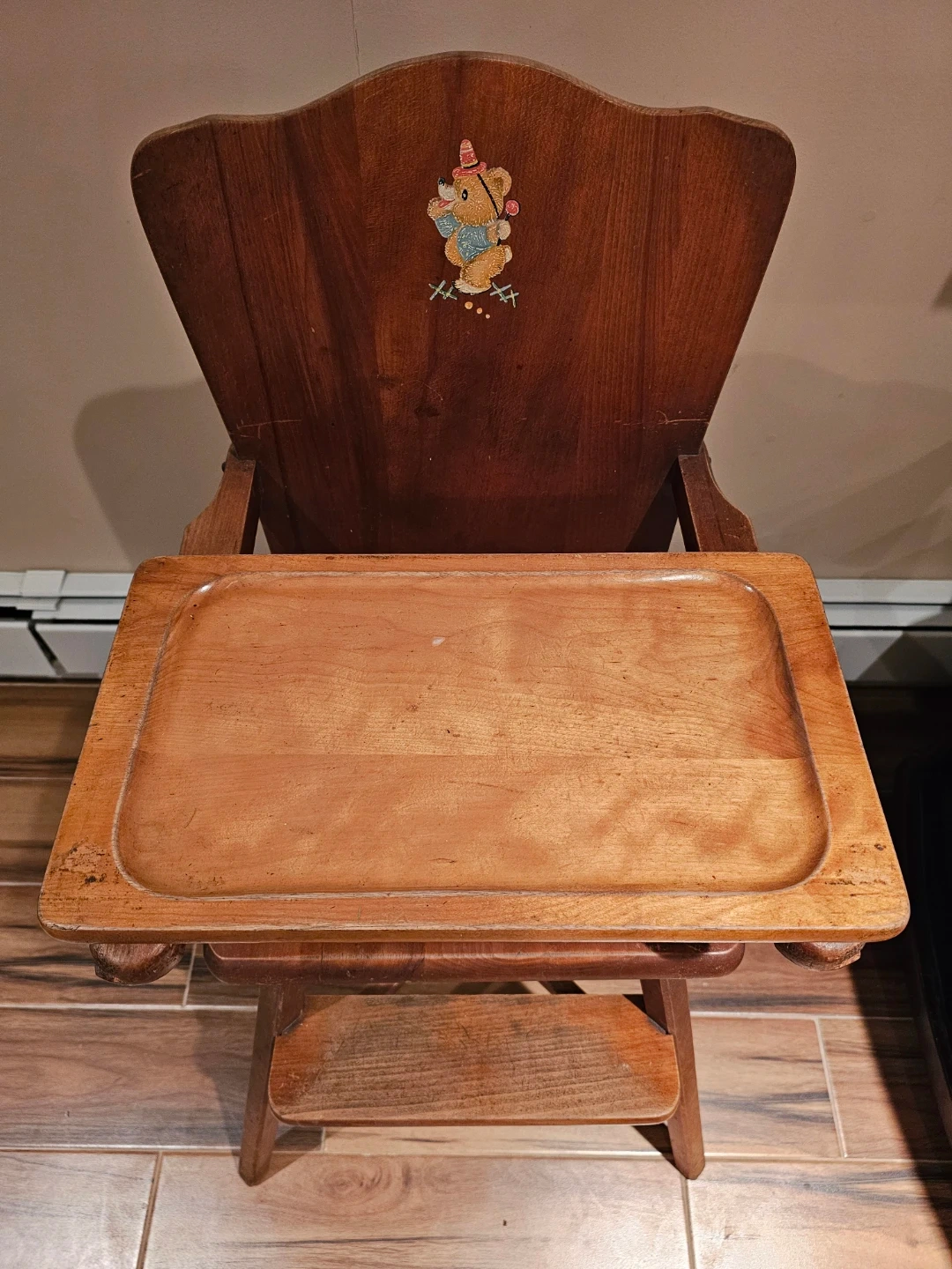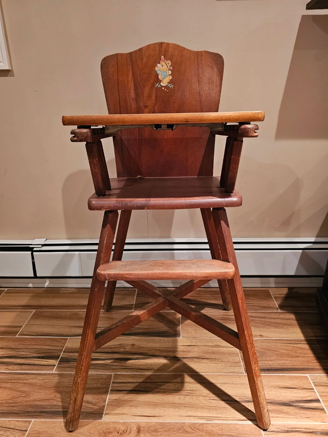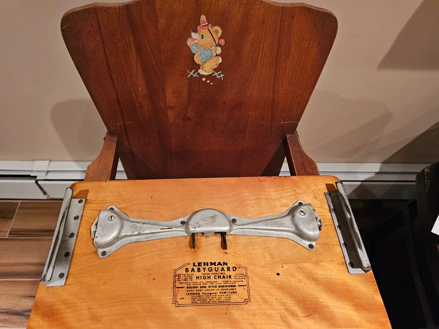 Vintage Lehman Babyguard high chair made of maple wood. Features a cute teddy bear decal on the backrest. Includes a wooden tray and footrest. Solid wood construction.
