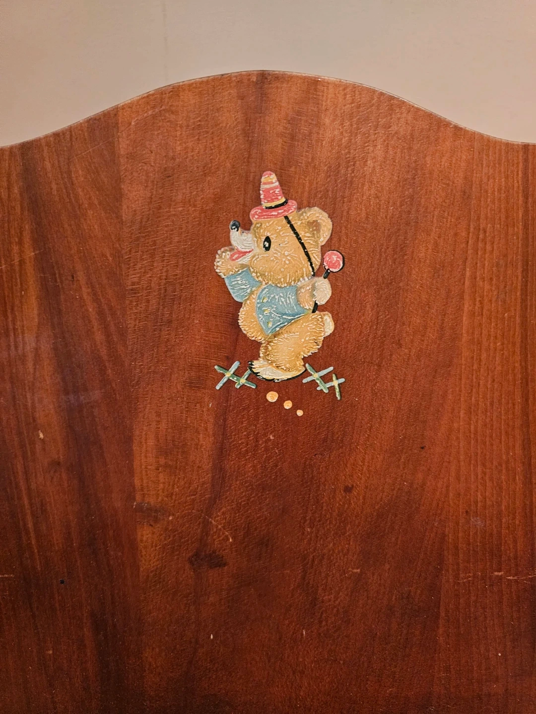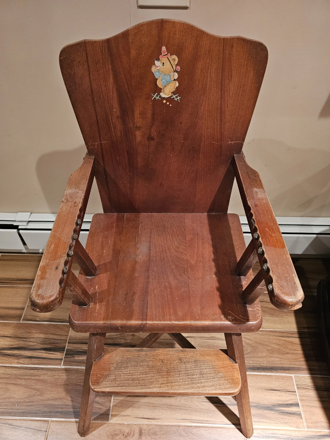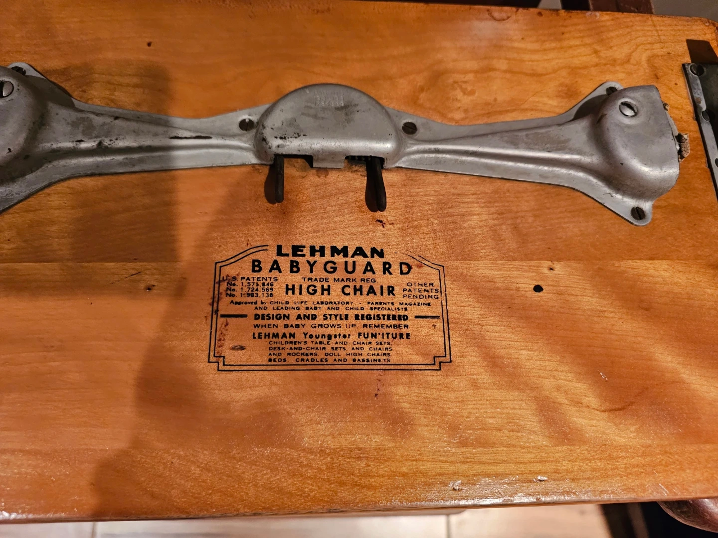 Vintage Lehman Babyguard high chair made of maple wood. Features a cute teddy bear decal on the backrest. Includes a wooden tray and footrest. Solid wood construction.